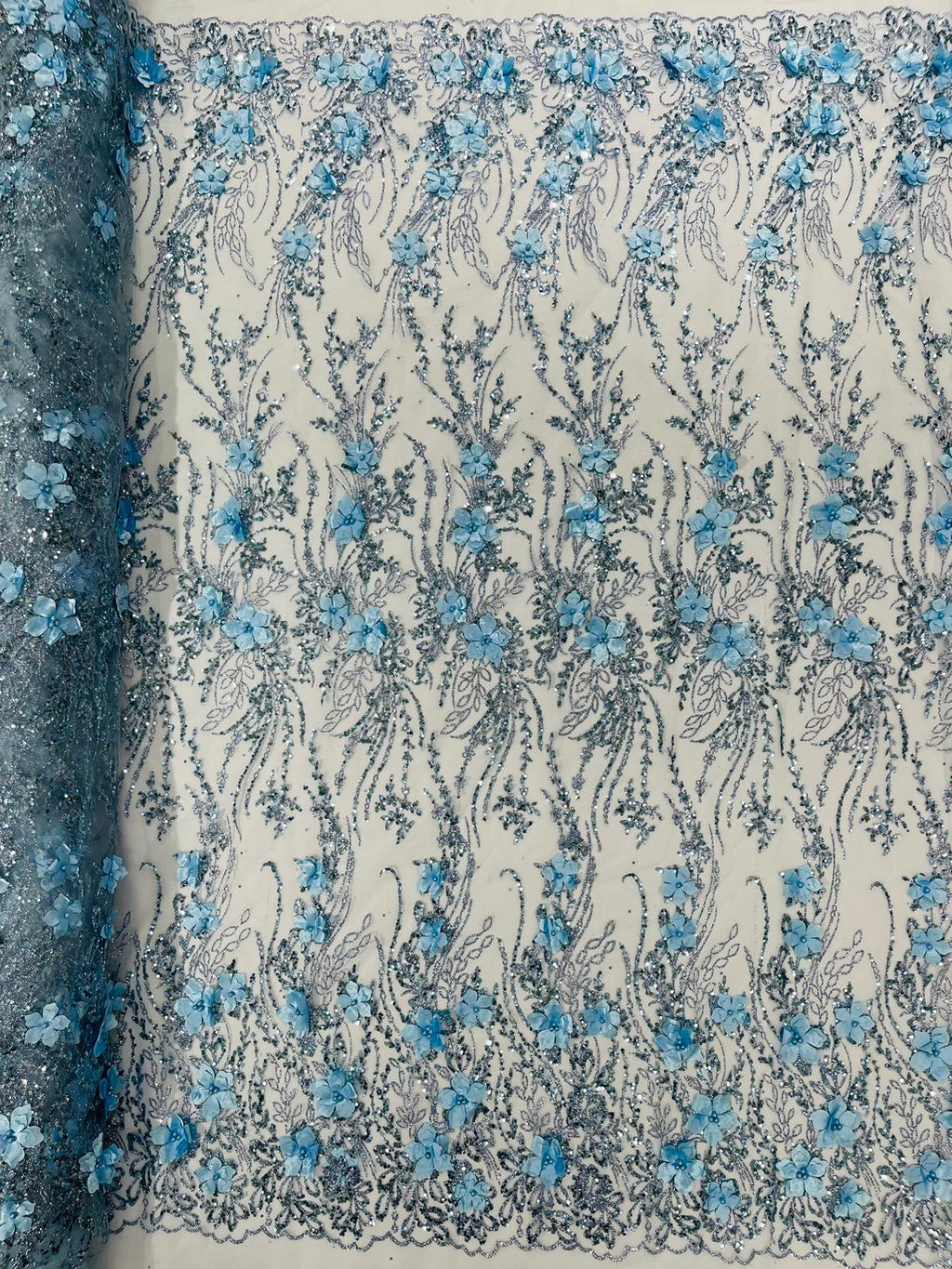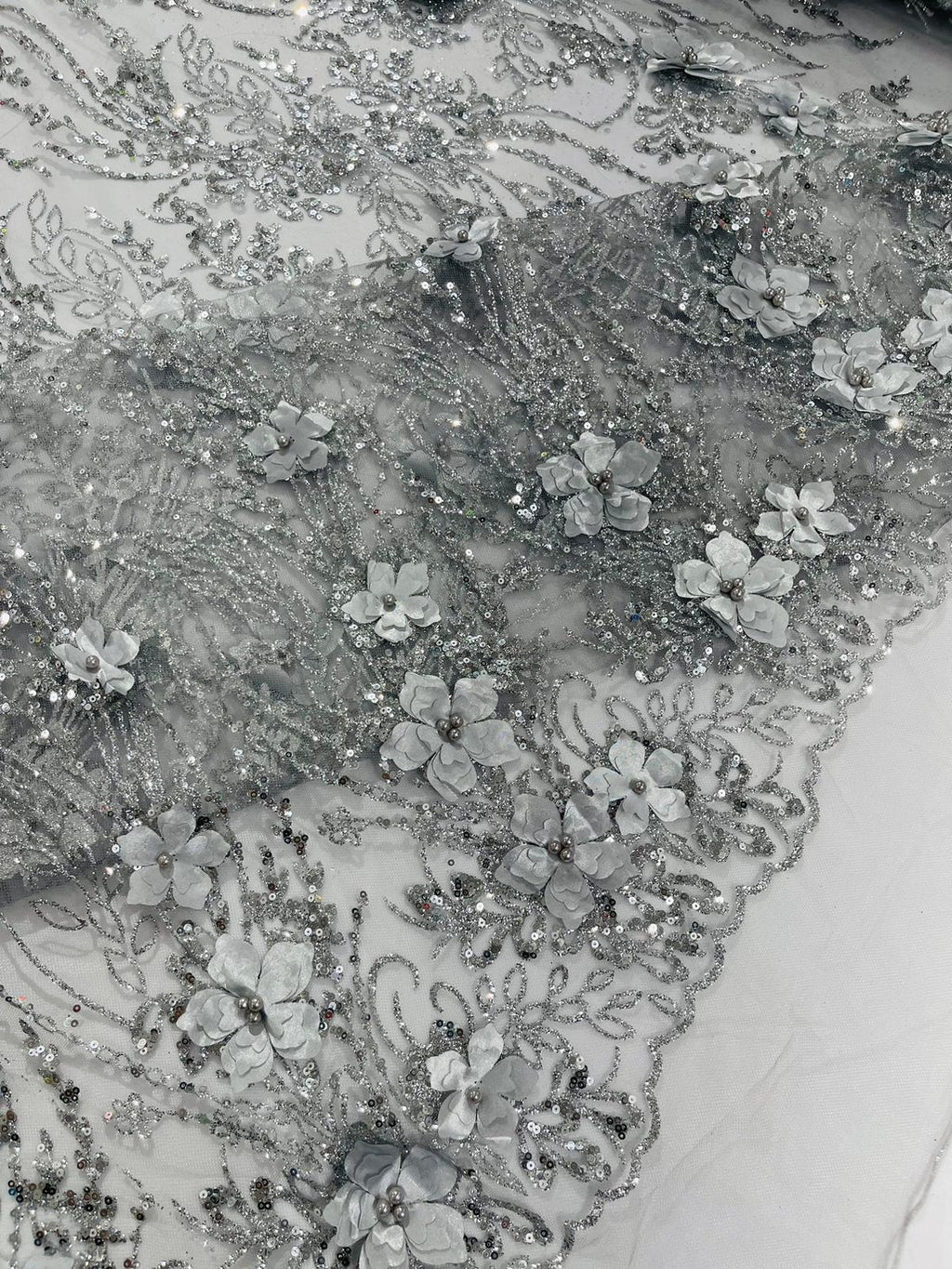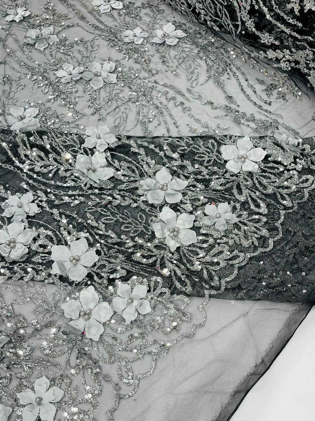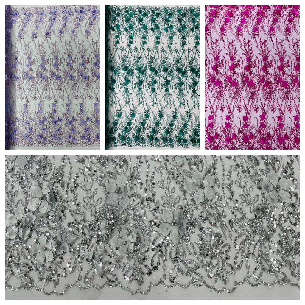 Beautiful 3d satin flower design embroider with glitter/sequin. The lace has glitter/sequins and 3d satin flowers embroider for a sparkling real look. This 3d satin flower lace has a glitter/sequins on the design that gives a beautiful shine. This lace is a great item for show people and dance dresses, great for Vegas shows.