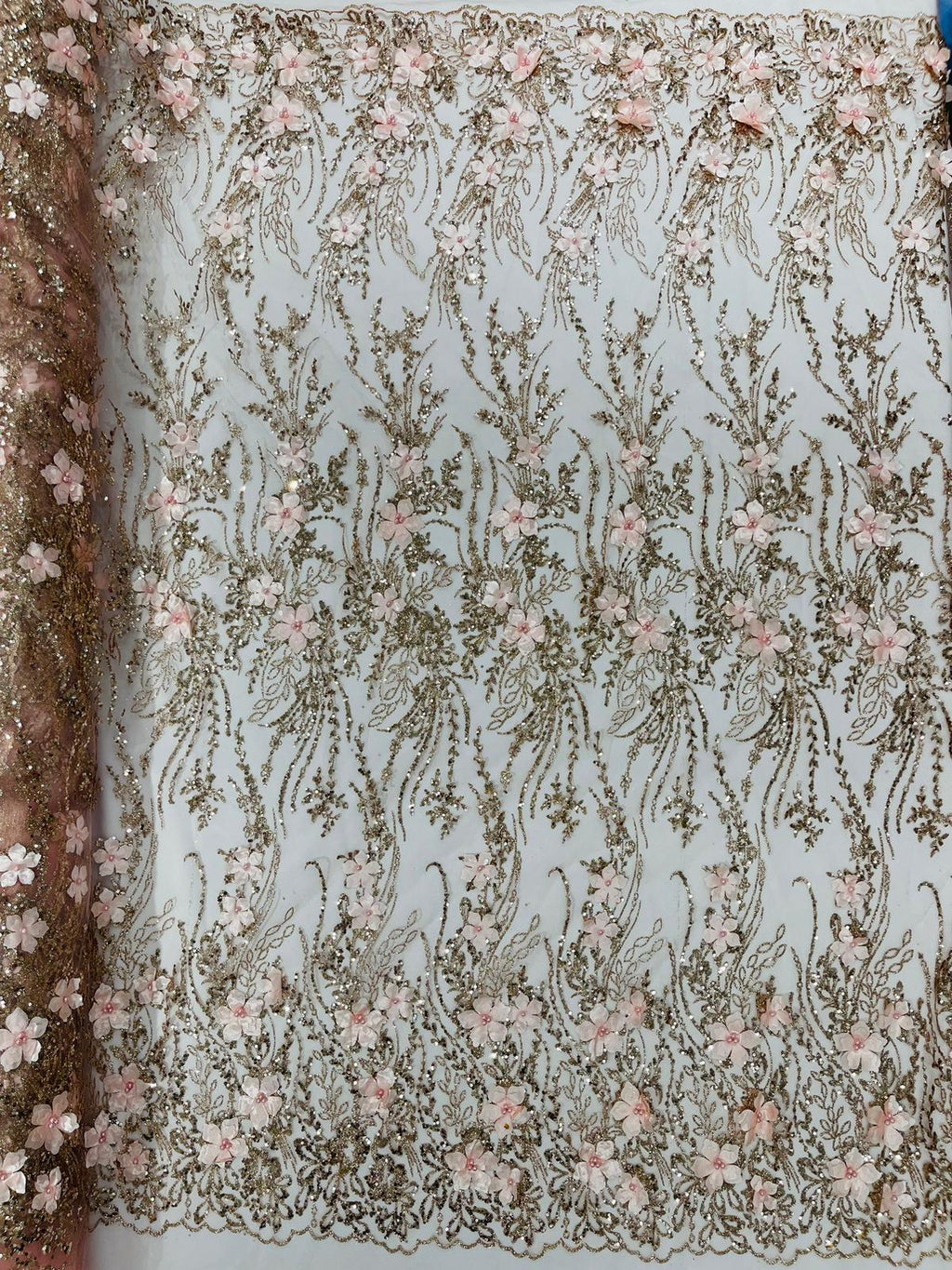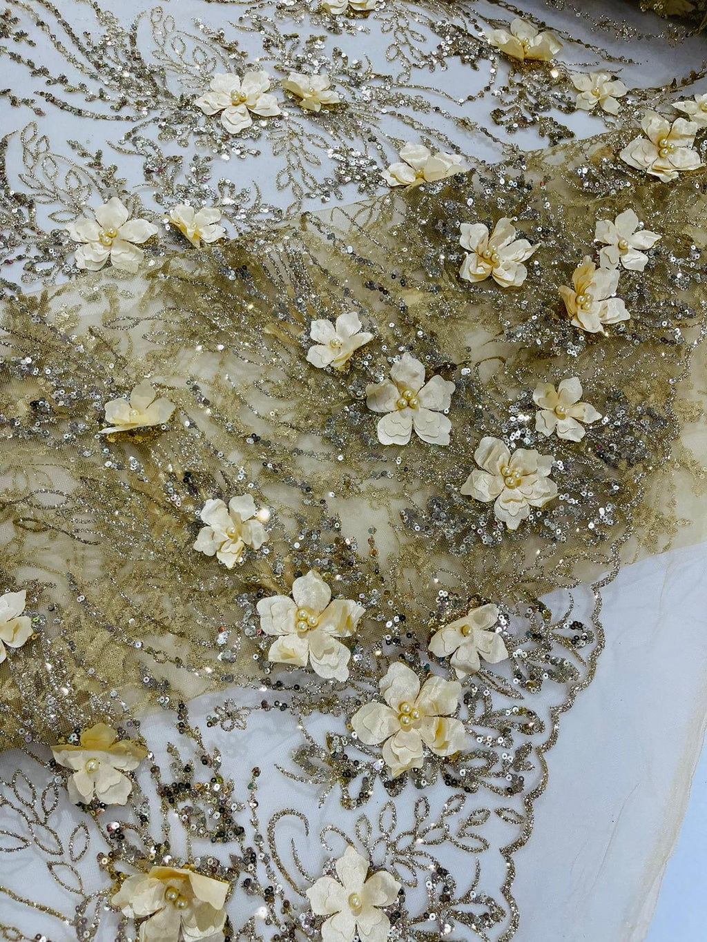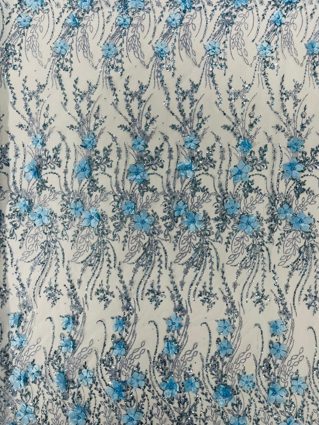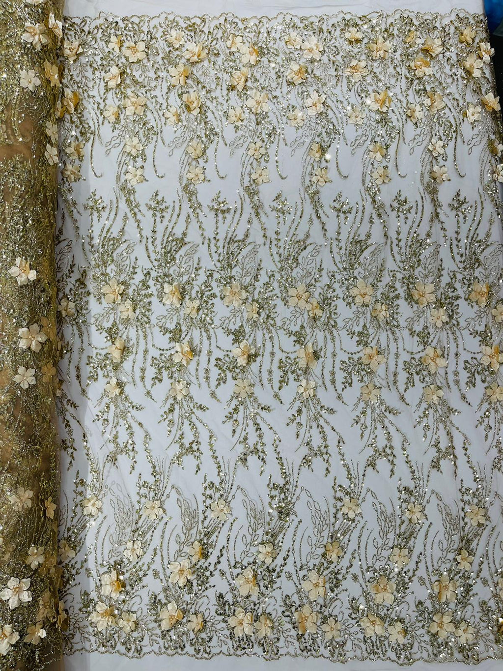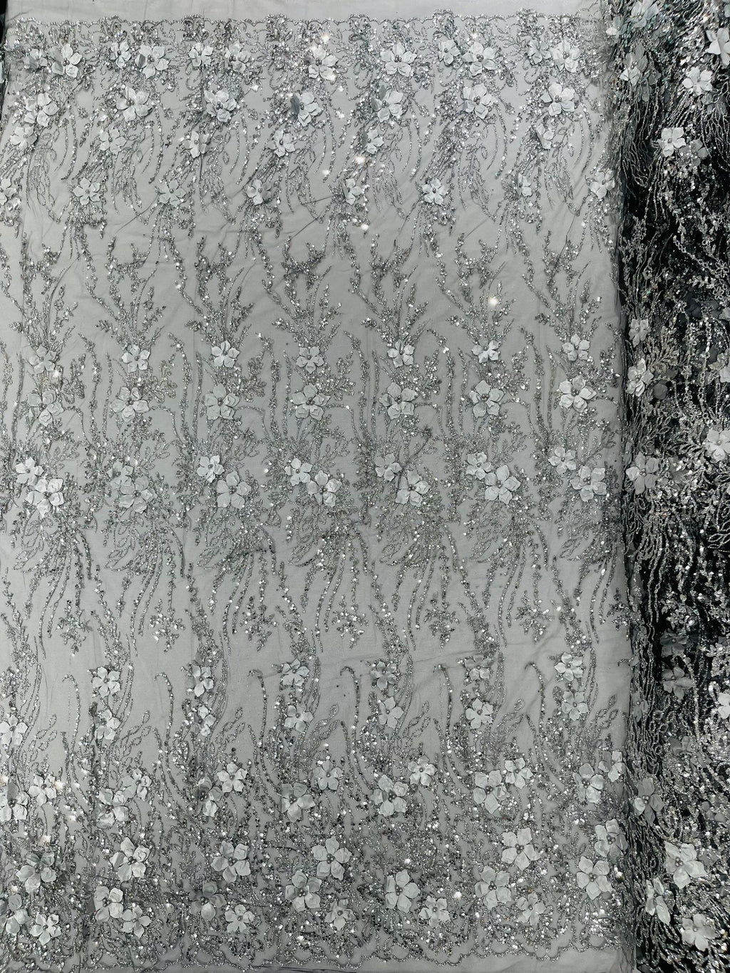Beautiful 3d satin flower design embroider with glitter/sequin. The lace has glitter/sequins and 3d satin flowers embroider for a sparkling real look. This 3d satin flower lace has a glitter/sequins on the design that gives a beautiful shine. This lace is a great item for show people and dance dresses, great for Vegas shows.