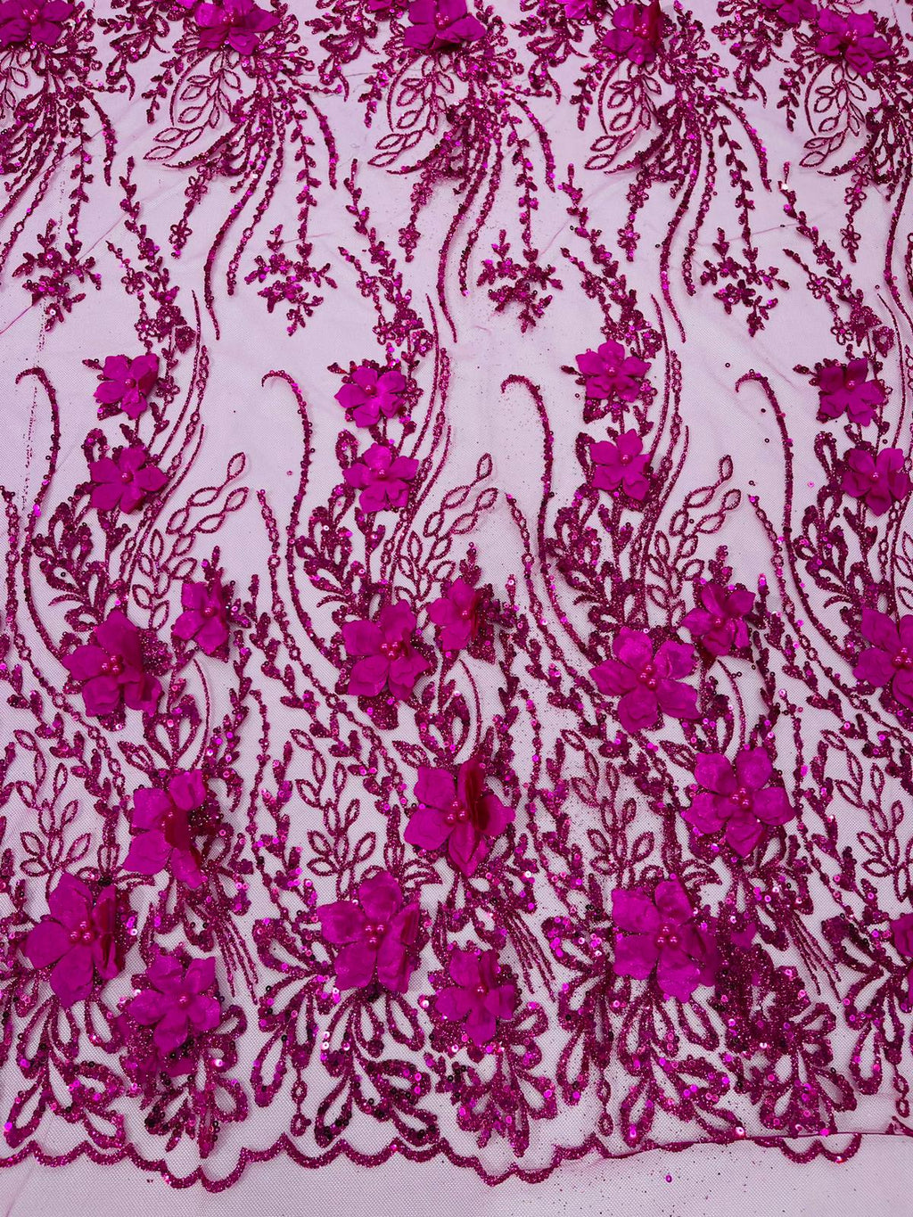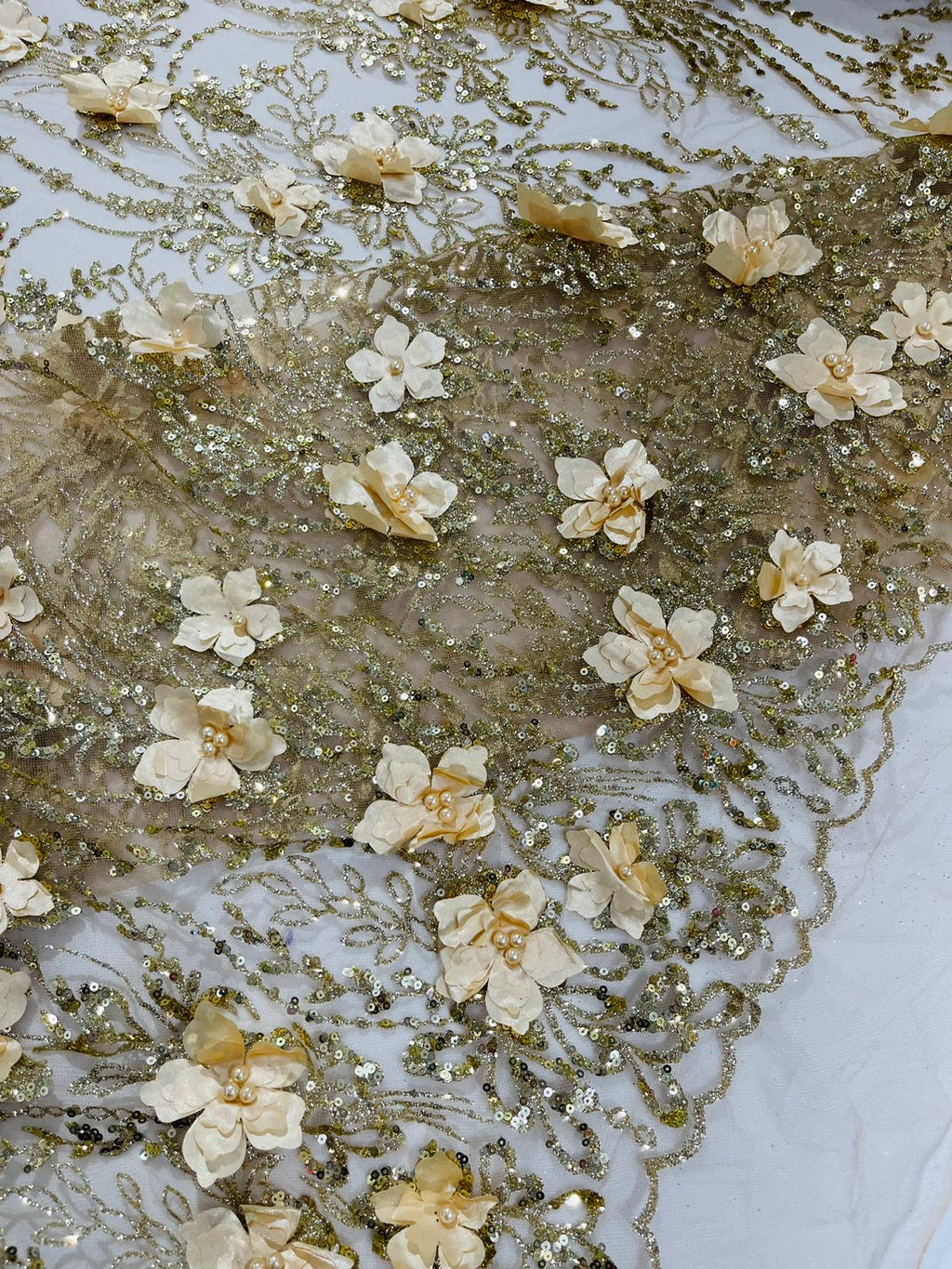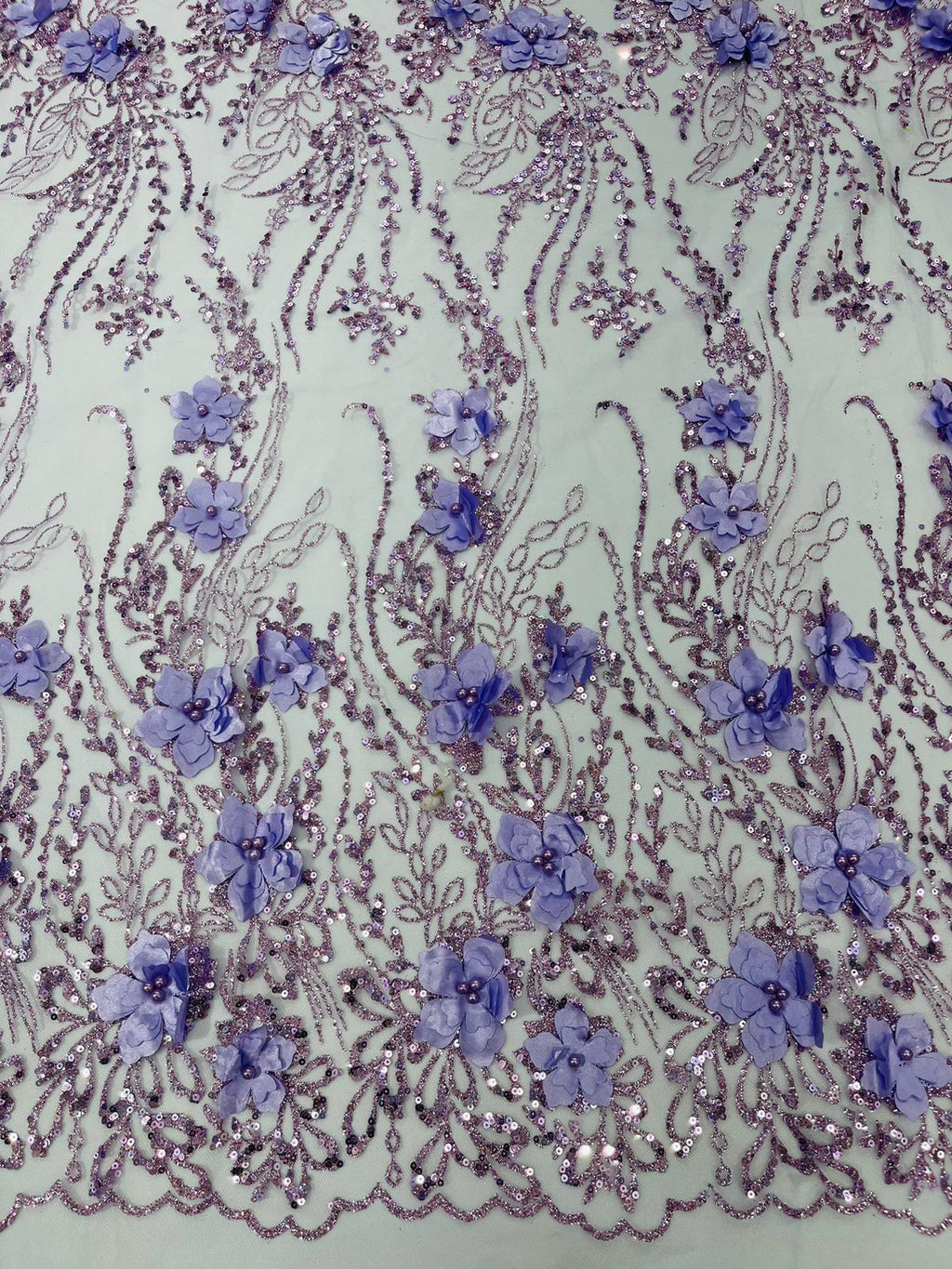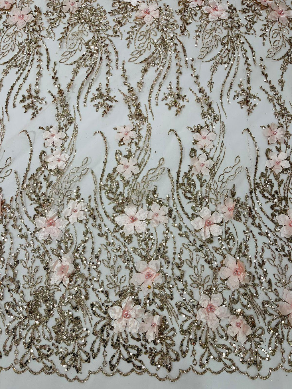 Beautiful 3d satin flower design embroider with glitter/sequin. The lace has glitter/sequins and 3d satin flowers embroider for a sparkling real look. This 3d satin flower lace has a glitter/sequins on the design that gives a beautiful shine. This lace is a great item for show people and dance dresses, great for Vegas shows.