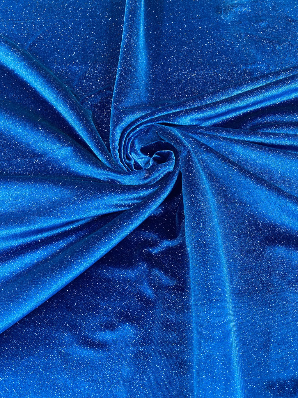 Galaxy Glitter Stretch velvet fabric is 58/60" inches wide, Fabric Type: 90% Polyester/10% Lycra Spandex. This stretchy velvet fabric is great for apparel, costumes, dance wear, decorations and more. The velvet has a silky soft feeling and a 2-way stretch. Its 60" width also makes it an ideal fabric for wide-width crafts and apparel projects. All orders will come in continuous yard piece lengths, unless you ask us otherwise! All colors are available in large quantities.