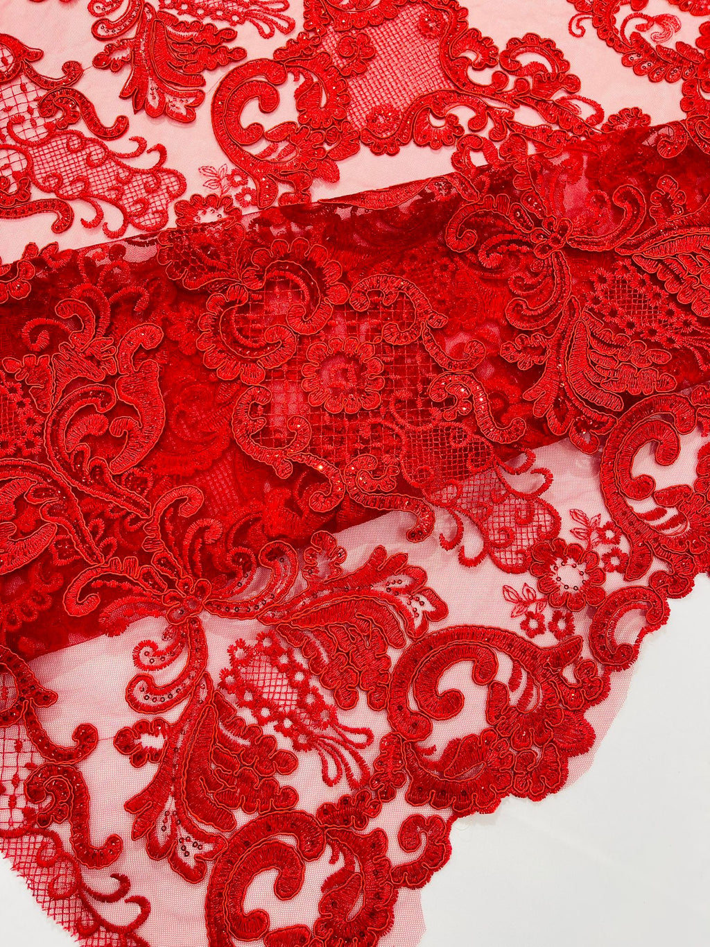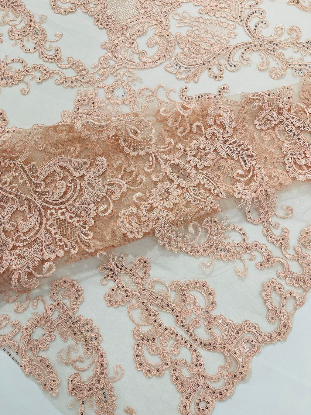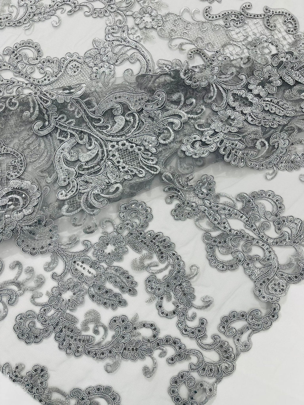 These corded flowers are embroider with sequins on a mesh lace fabric giving off a sophisticated and elegant look . The lace has a double scallops on the width. This lace can be used for dresses, tablecloths, nightgowns, prom gowns, bridal gowns, wedding gowns, runners, Vegas shows, pillows, decoration, and much more.