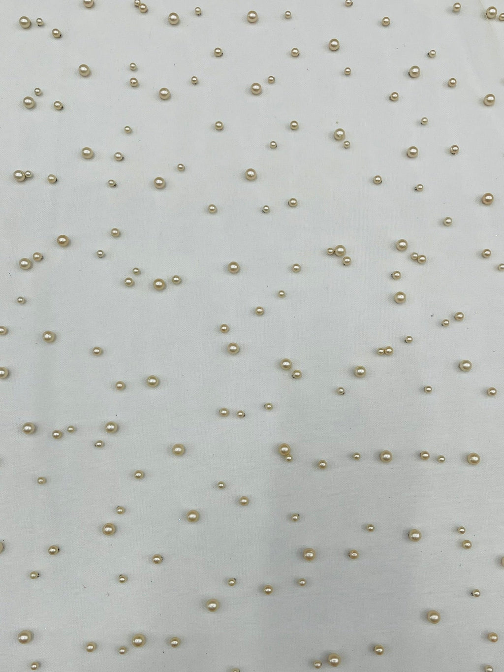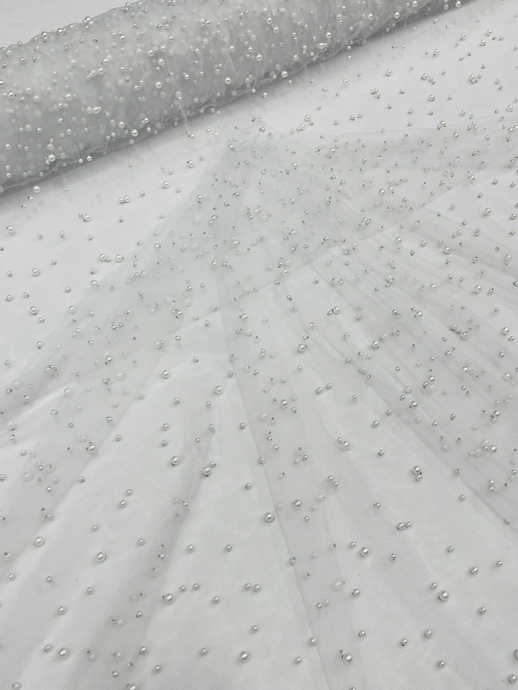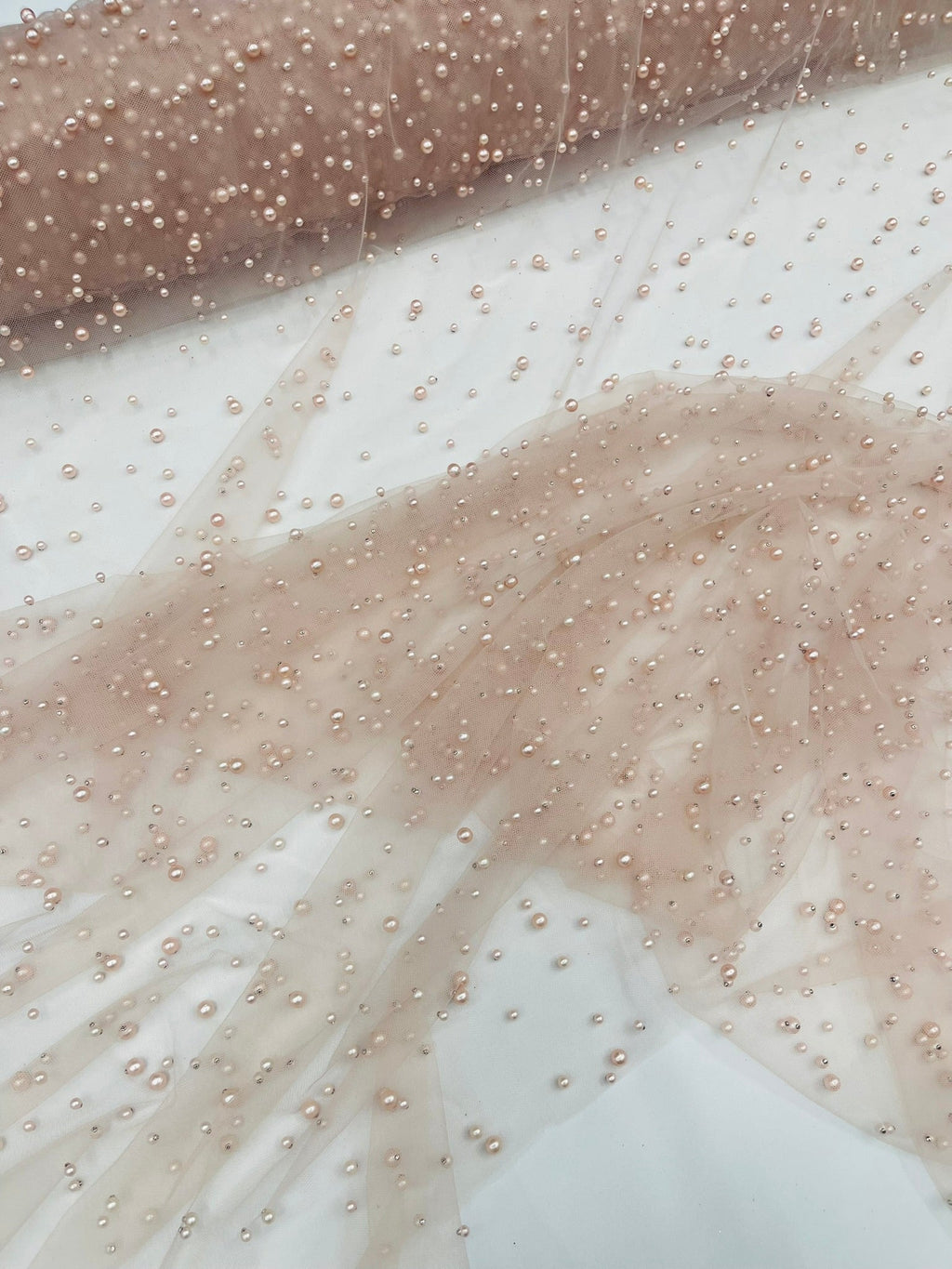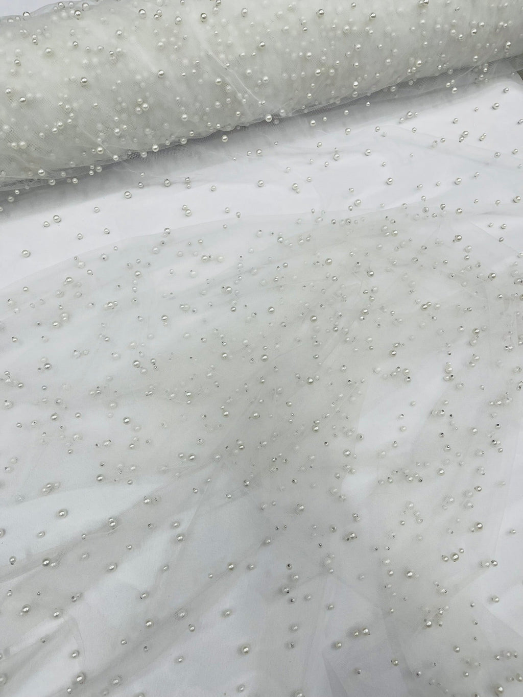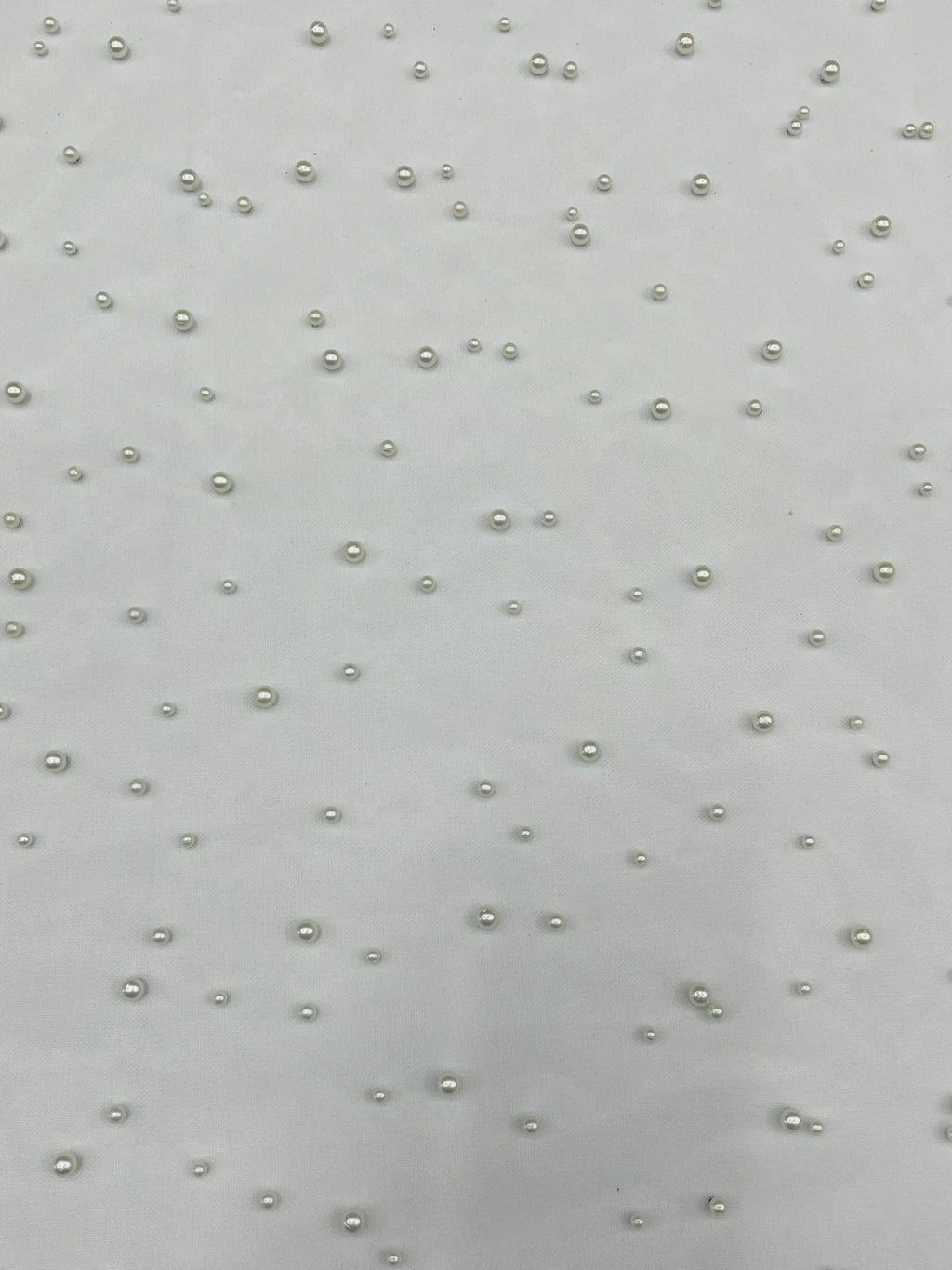Elevate your designs with our luxurious pearl tulle fabric, featuring delicately scattered pearls on soft, sheer mesh. This fabric is perfect for bridal veils, wedding gowns, evening dresses, and elegant DIY projects.