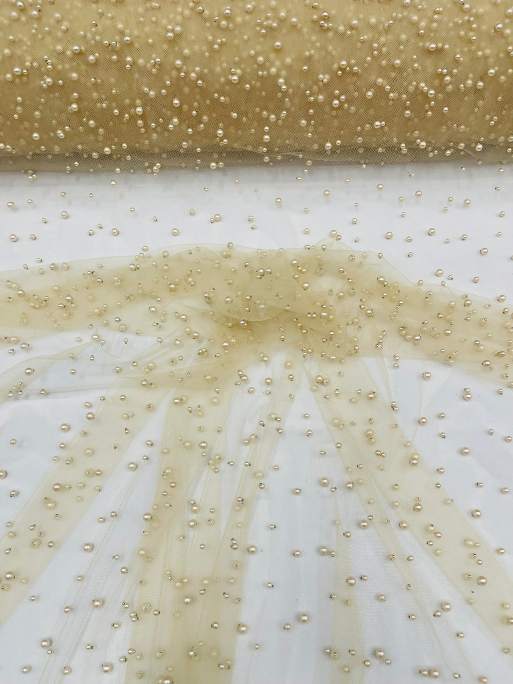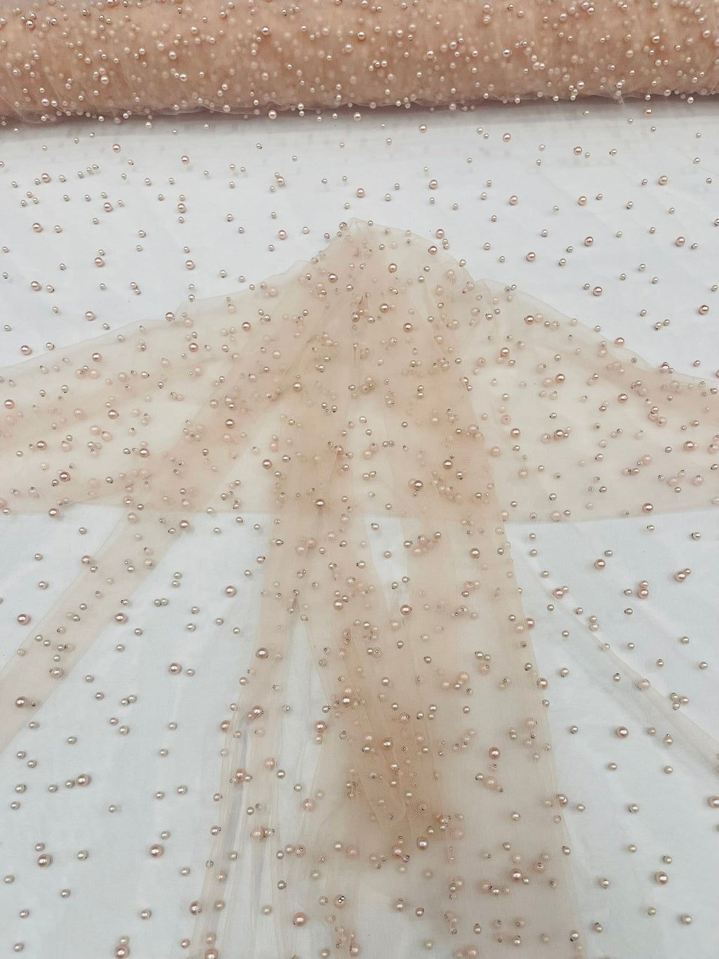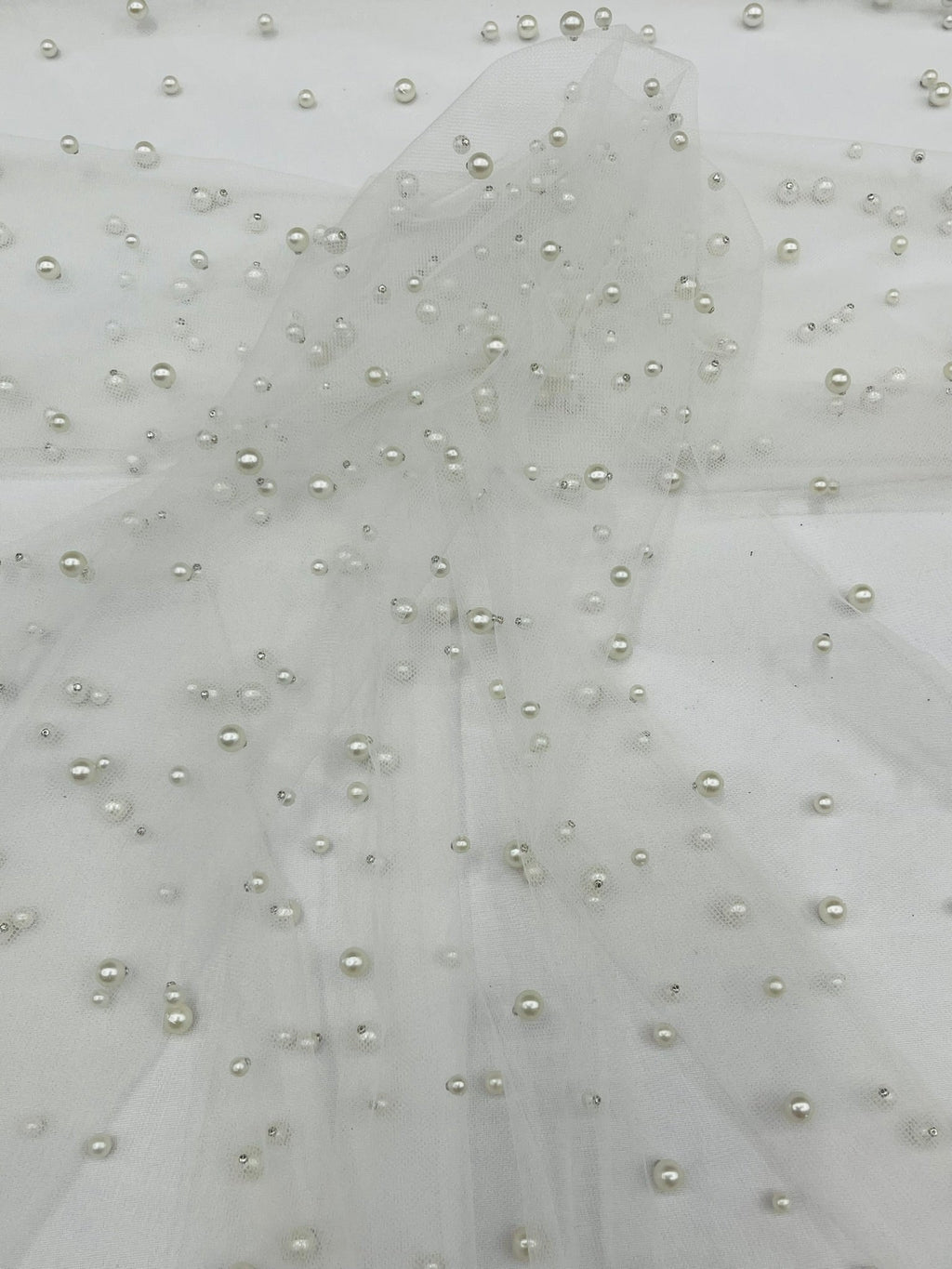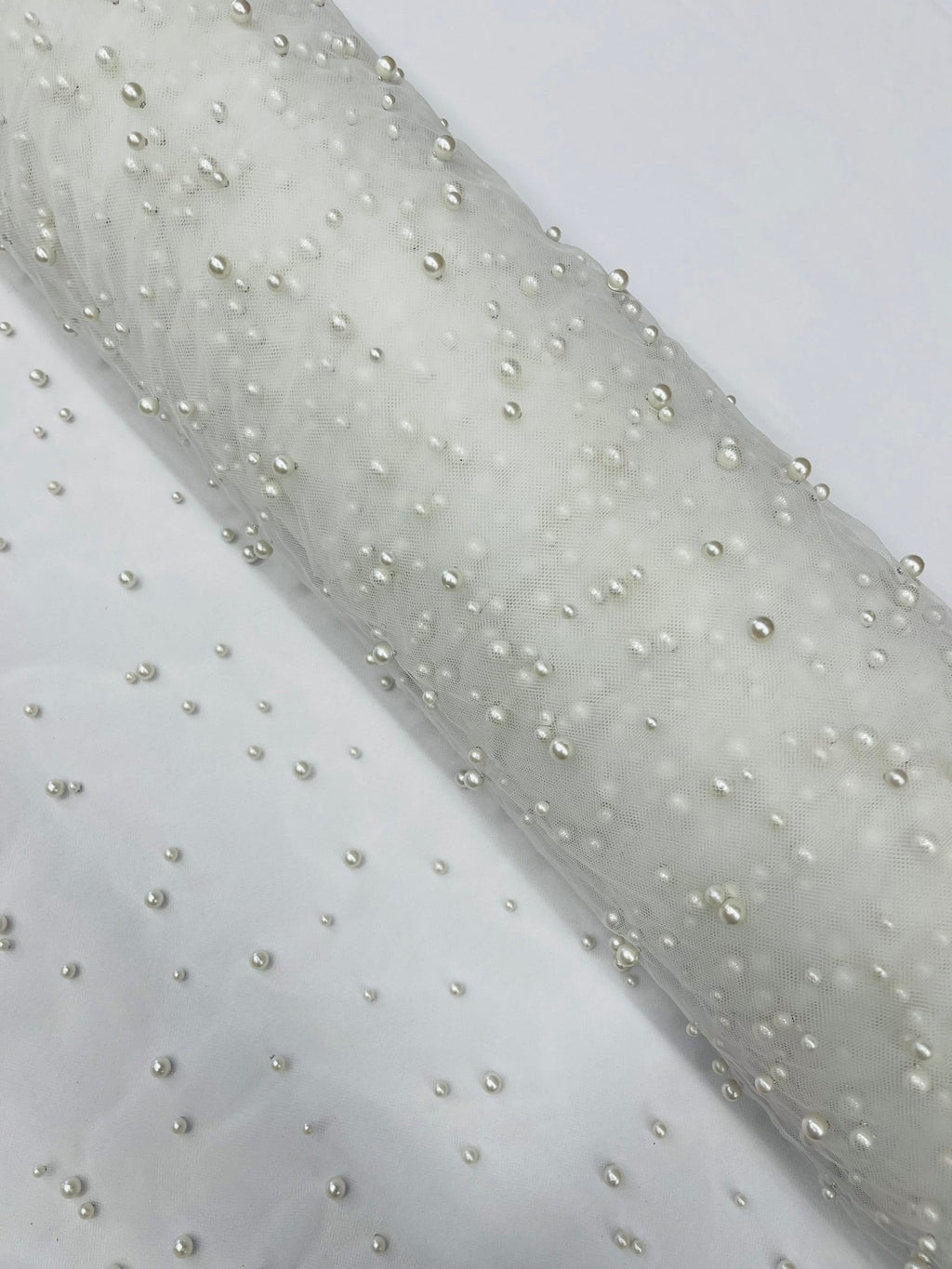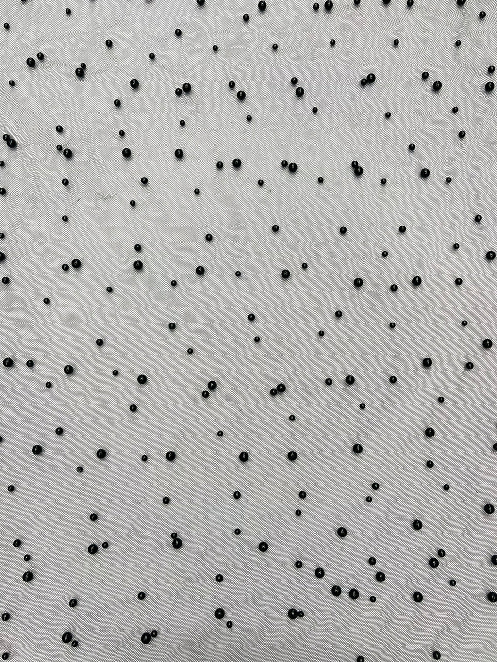 Elevate your designs with our luxurious pearl tulle fabric, featuring delicately scattered pearls on soft, sheer mesh. This fabric is perfect for bridal veils, wedding gowns, evening dresses, and elegant DIY projects.