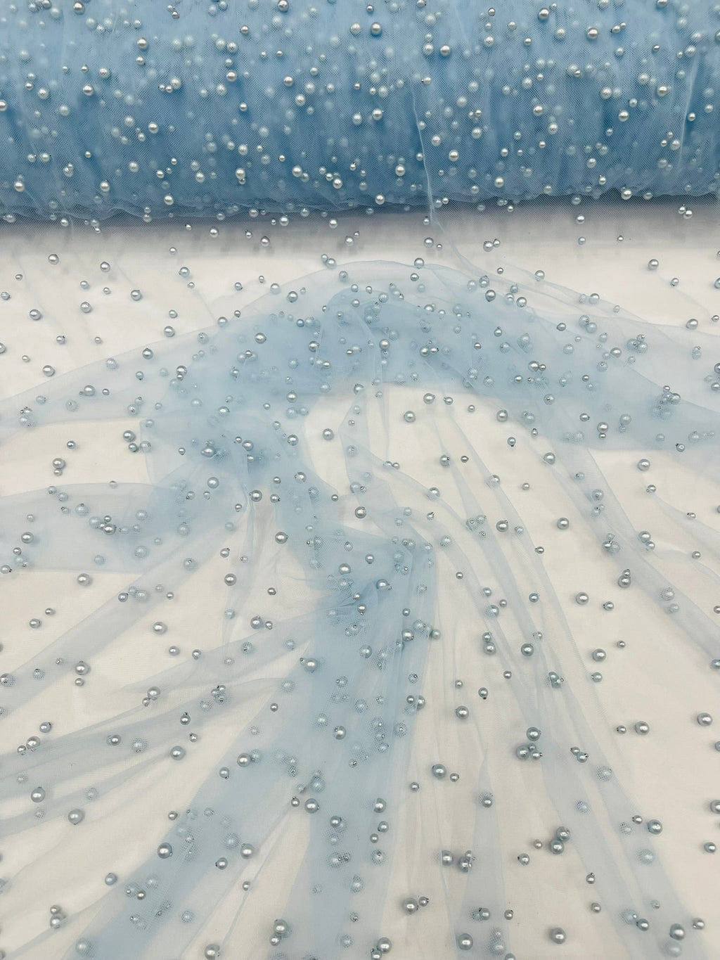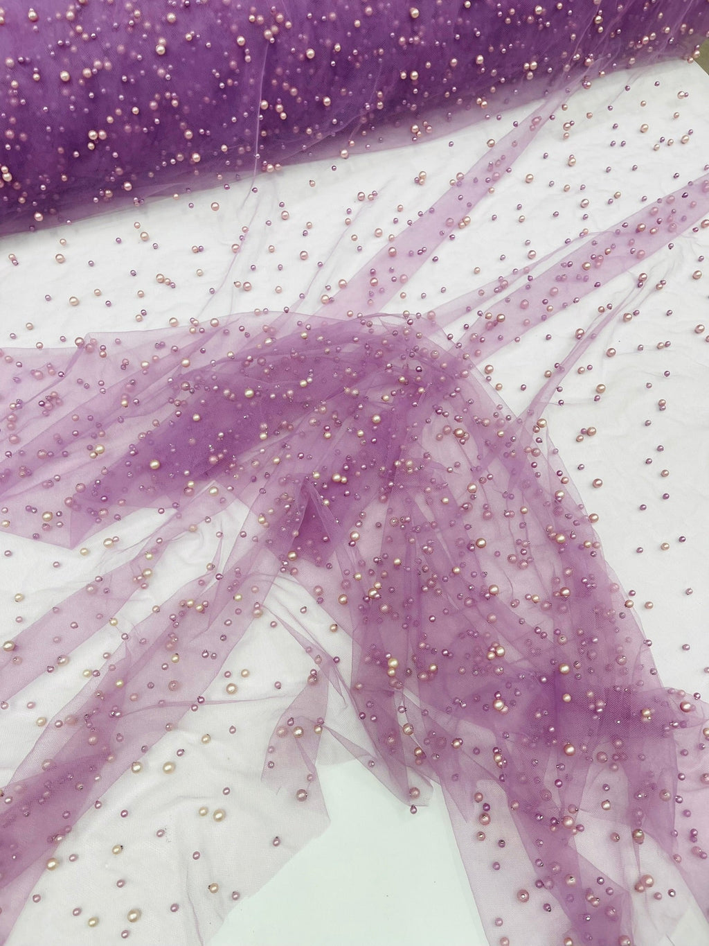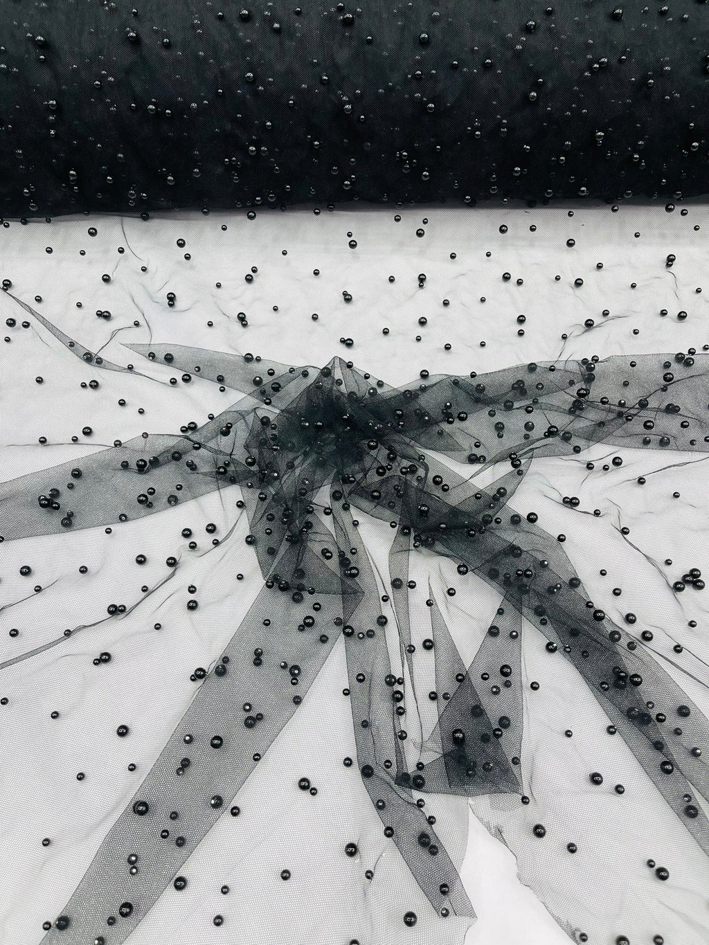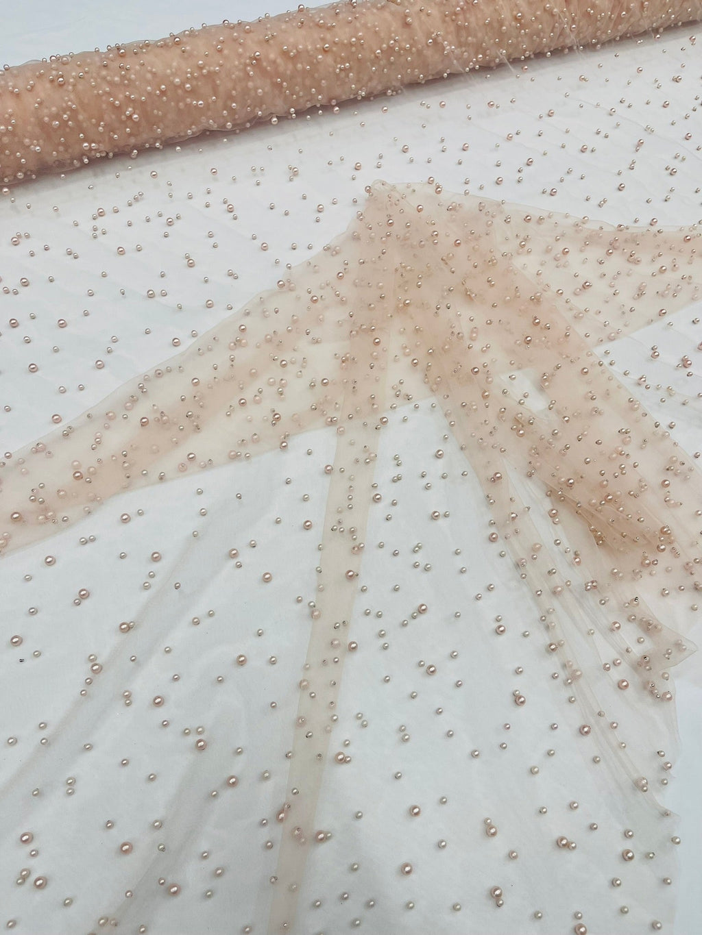 Elevate your designs with our luxurious pearl tulle fabric, featuring delicately scattered pearls on soft, sheer mesh. This fabric is perfect for bridal veils, wedding gowns, evening dresses, and elegant DIY projects.