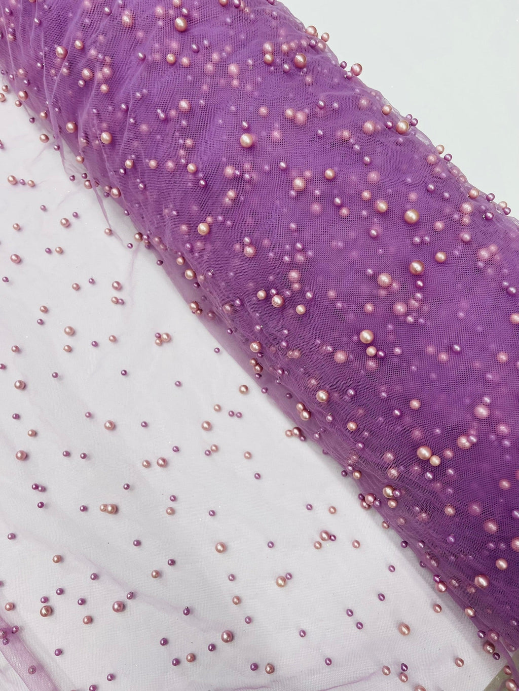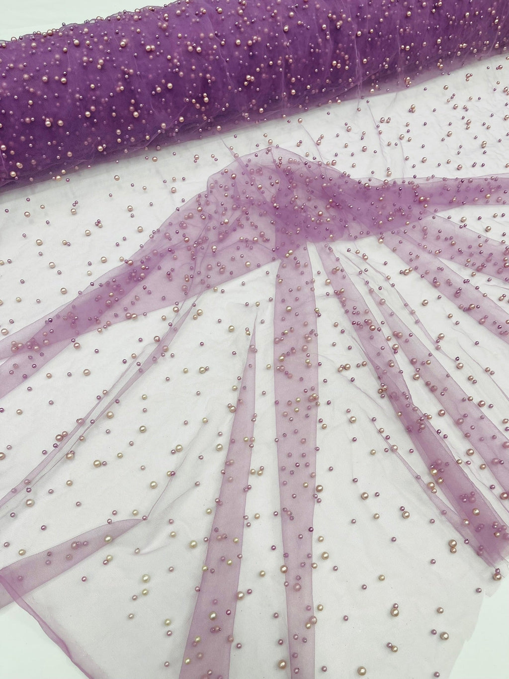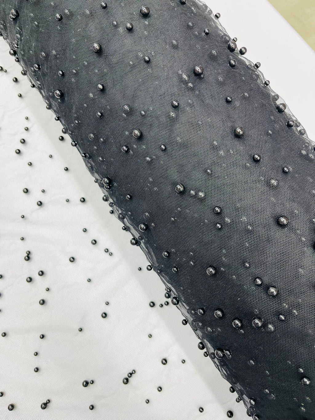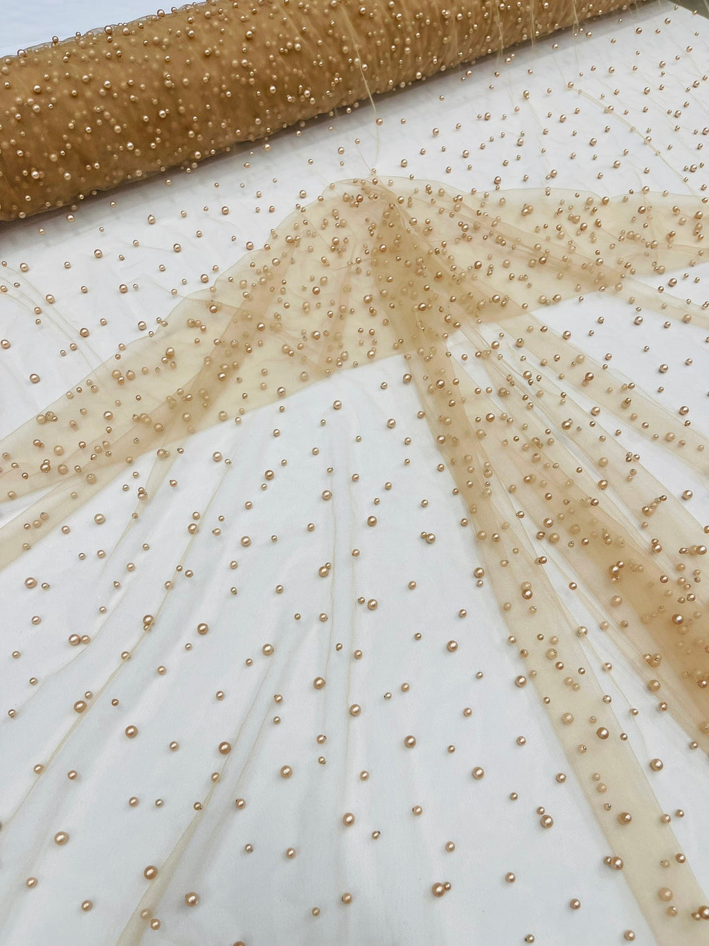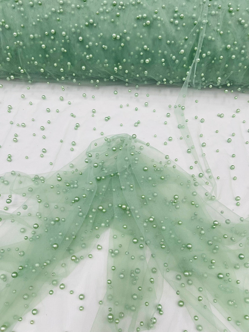Elevate your designs with our luxurious pearl tulle fabric, featuring delicately scattered pearls on soft, sheer mesh. This fabric is perfect for bridal veils, wedding gowns, evening dresses, and elegant DIY projects.