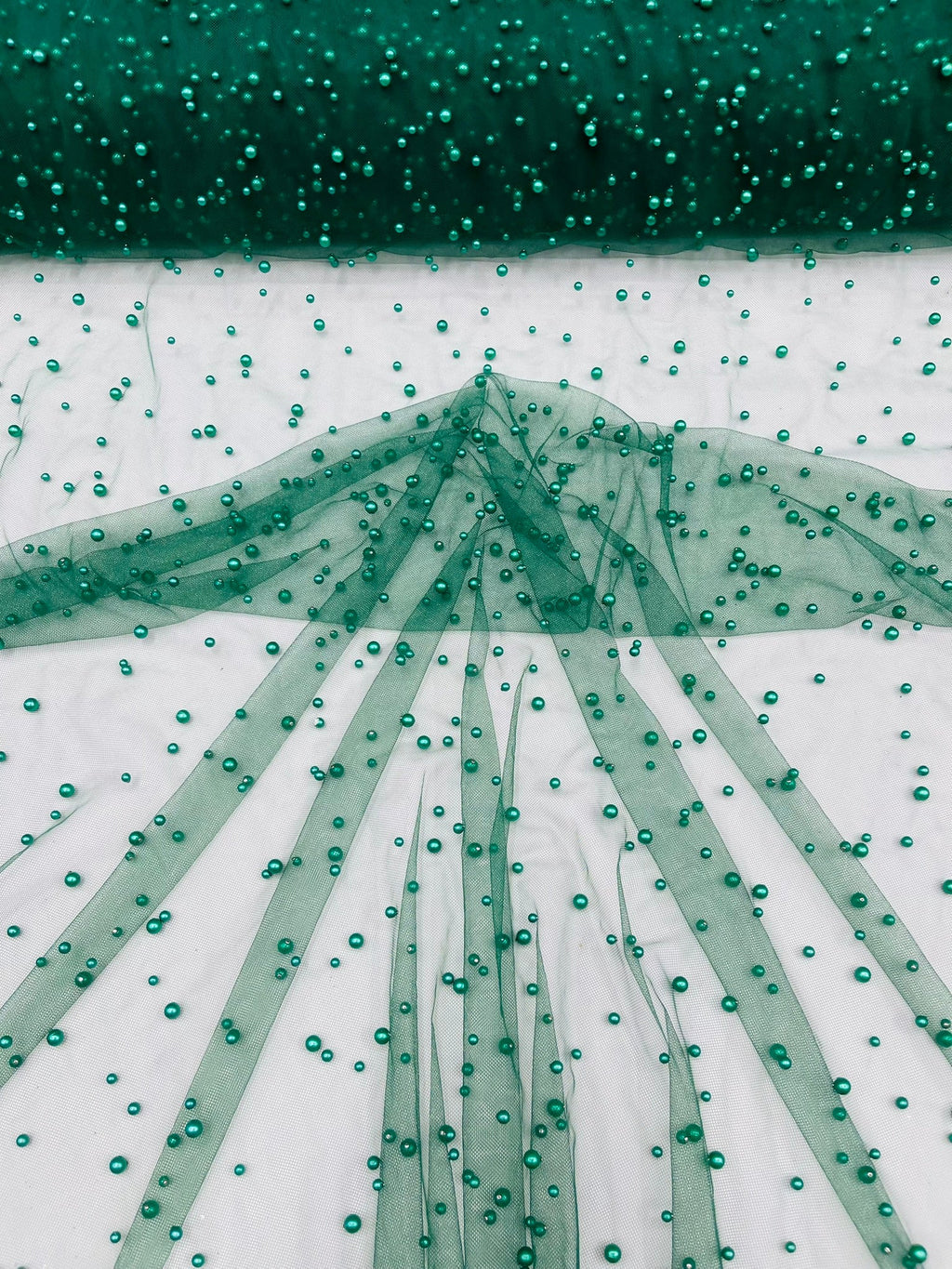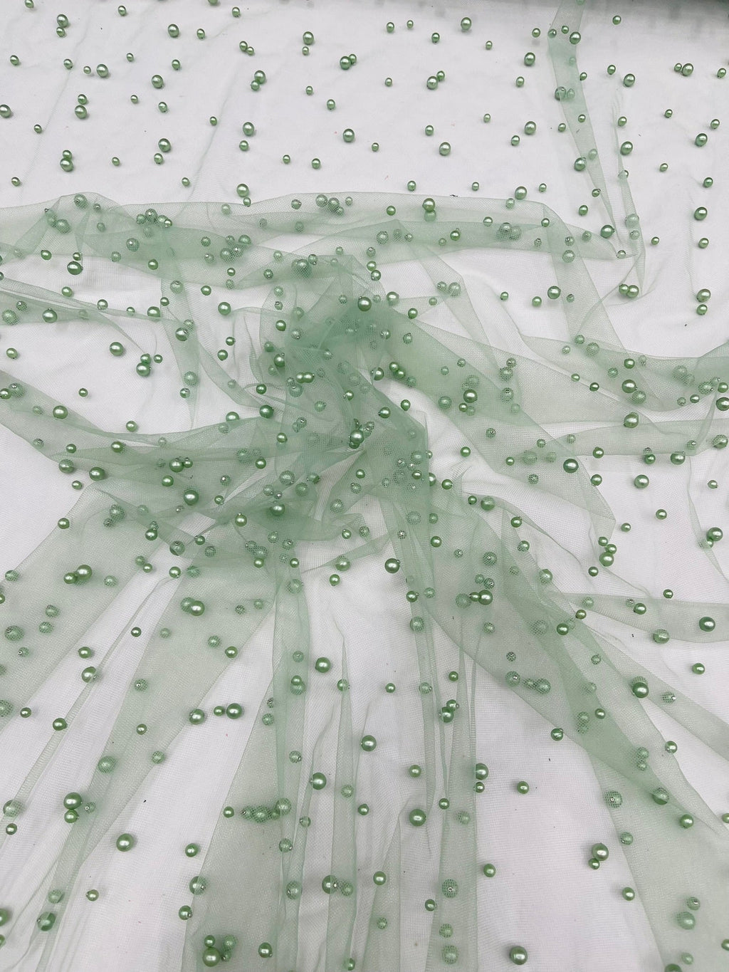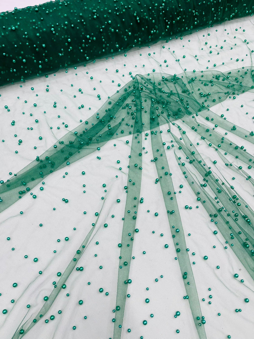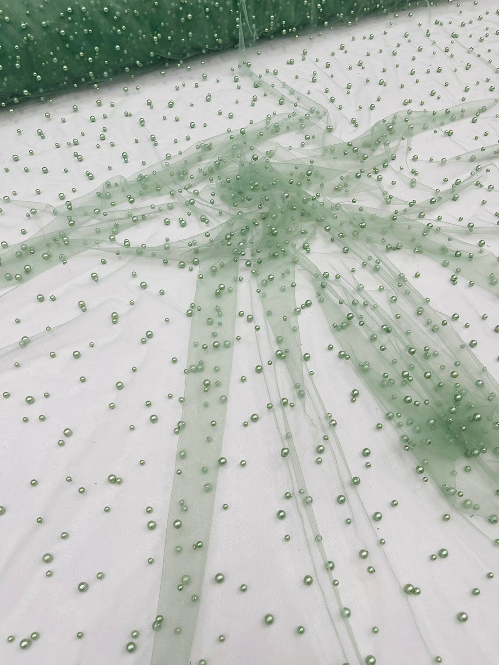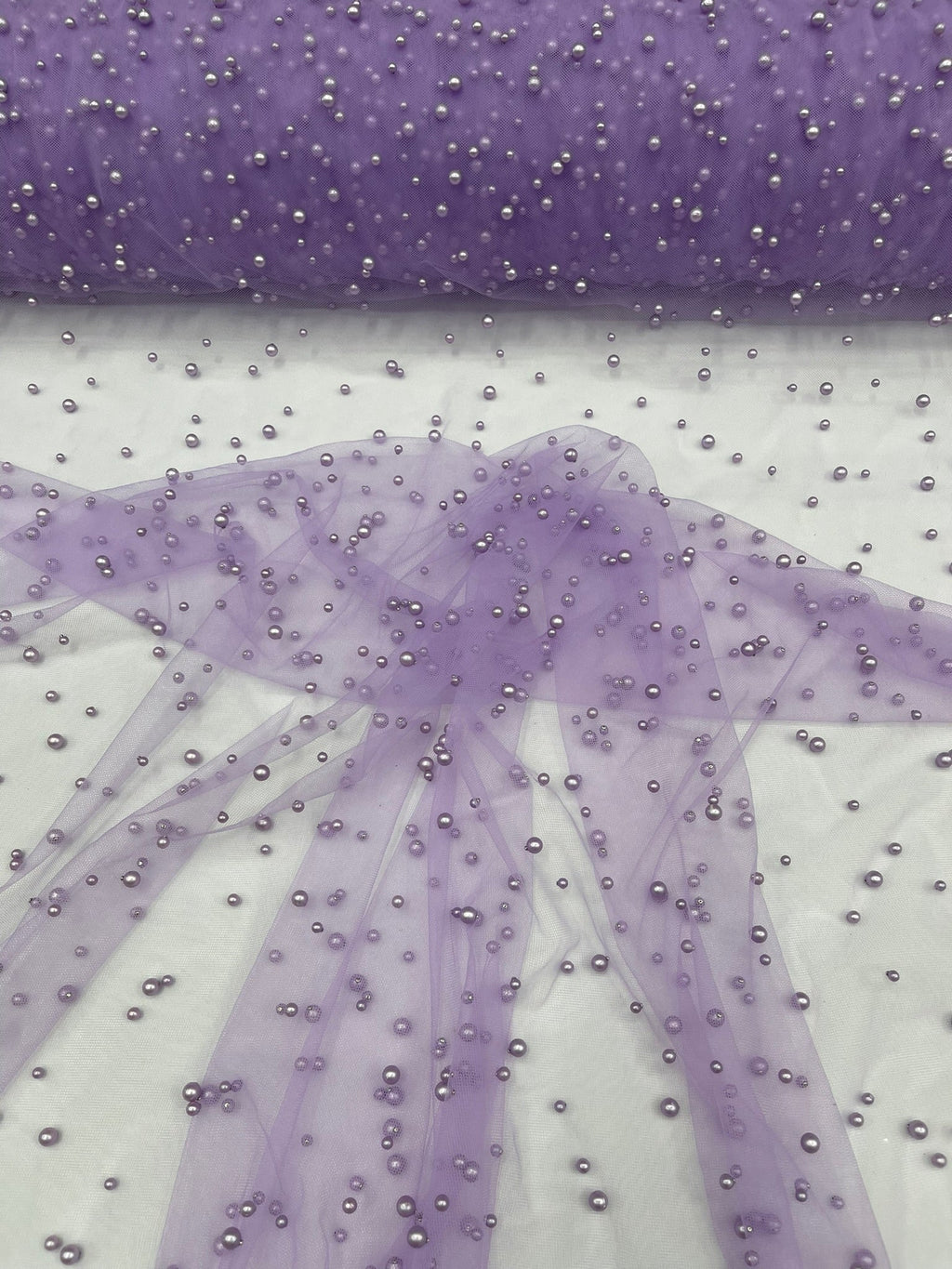 Elevate your designs with our luxurious pearl tulle fabric, featuring delicately scattered pearls on soft, sheer mesh. This fabric is perfect for bridal veils, wedding gowns, evening dresses, and elegant DIY projects.