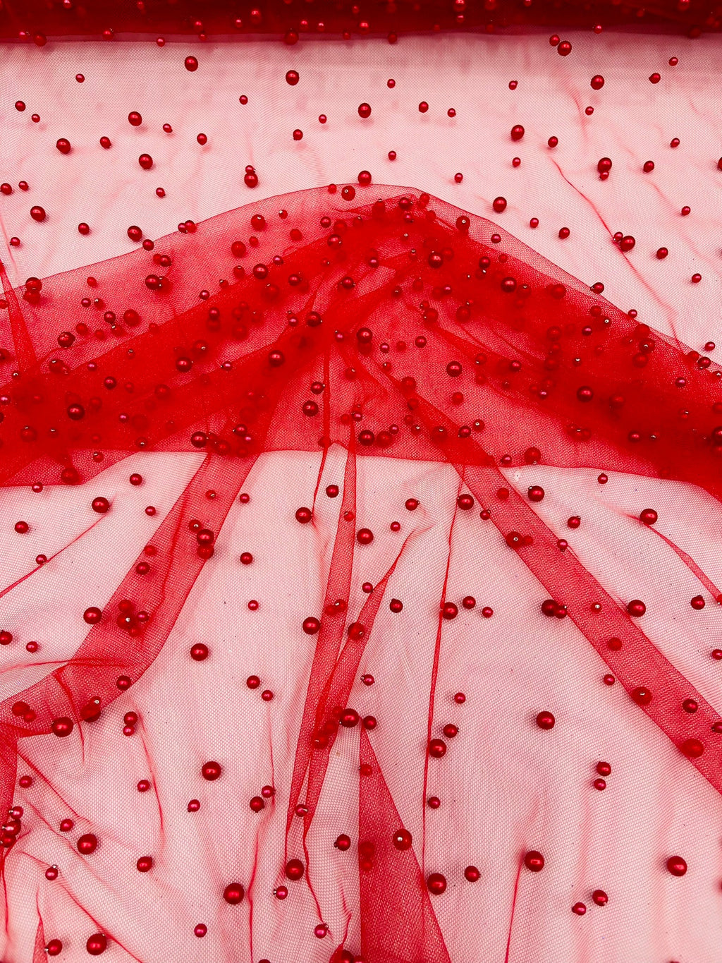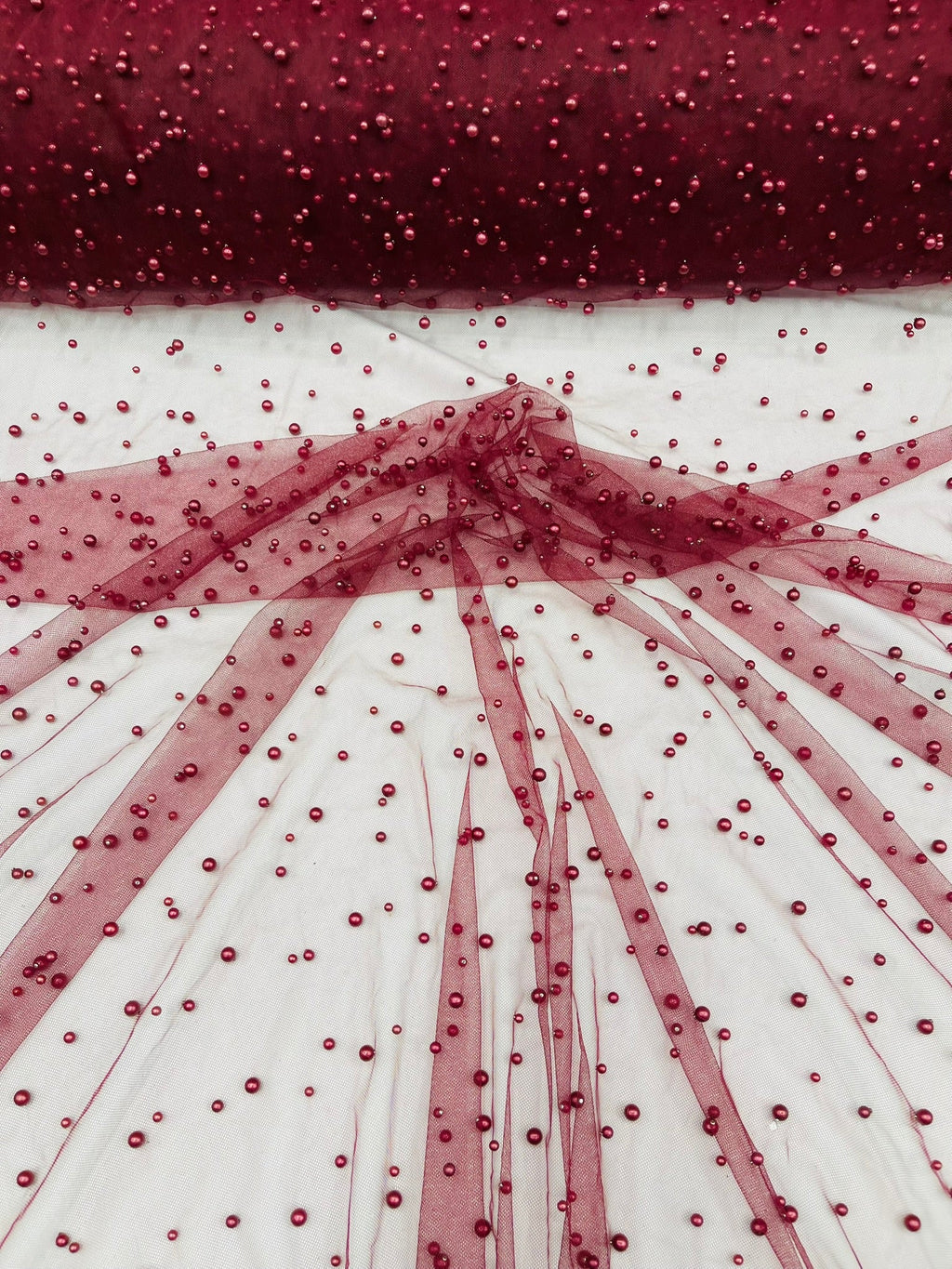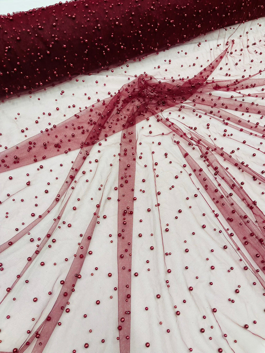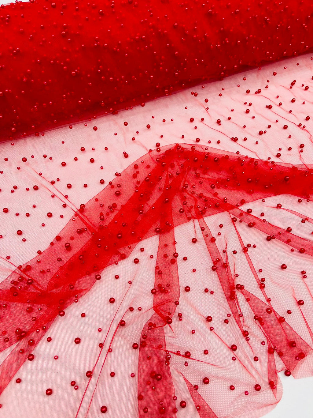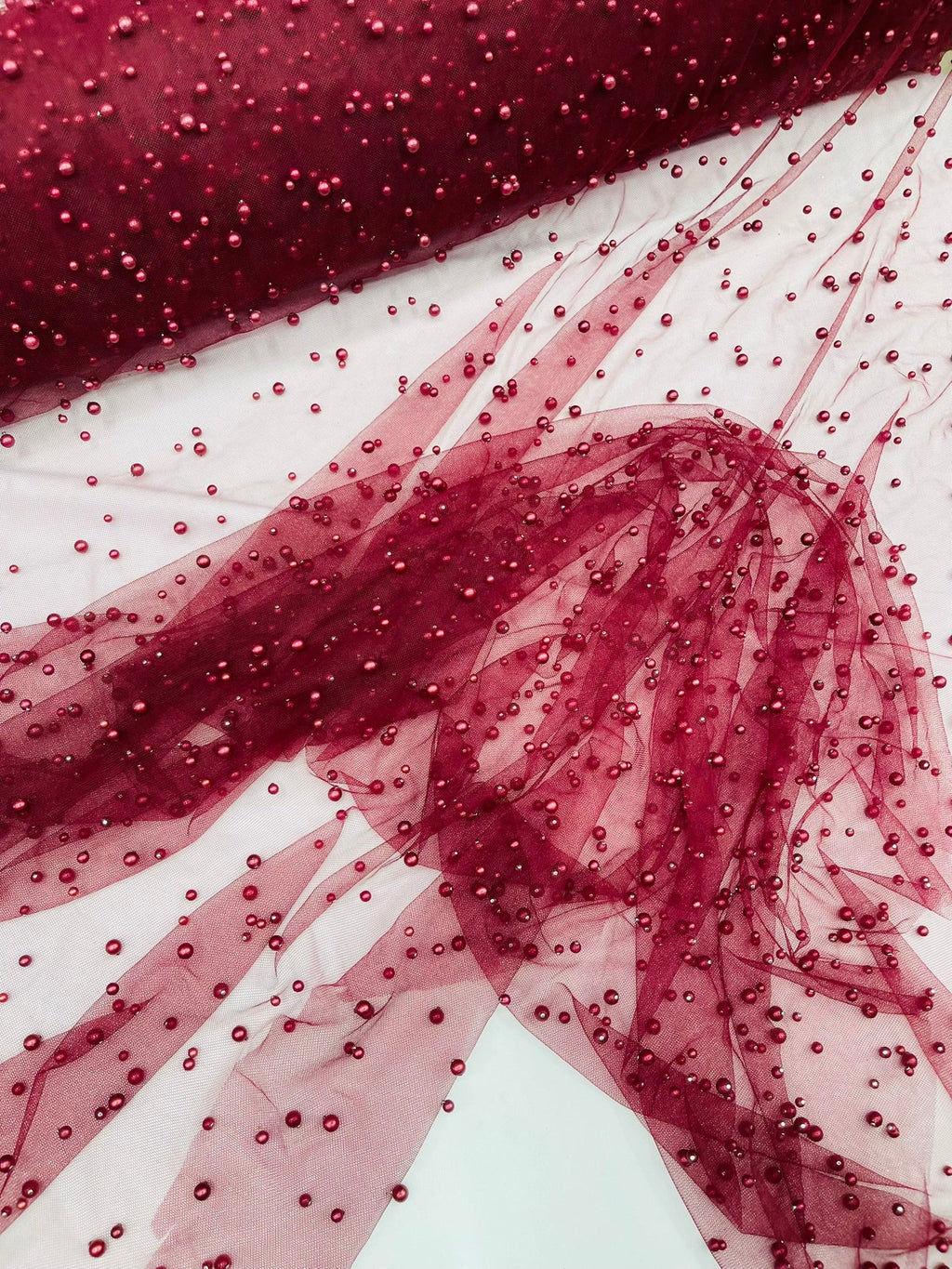 Elevate your designs with our luxurious pearl tulle fabric, featuring delicately scattered pearls on soft, sheer mesh. This fabric is perfect for bridal veils, wedding gowns, evening dresses, and elegant DIY projects.