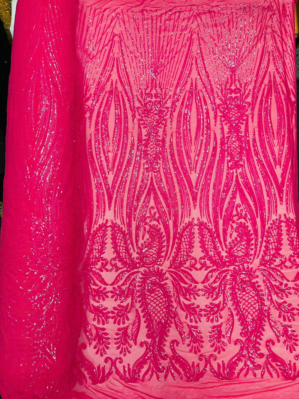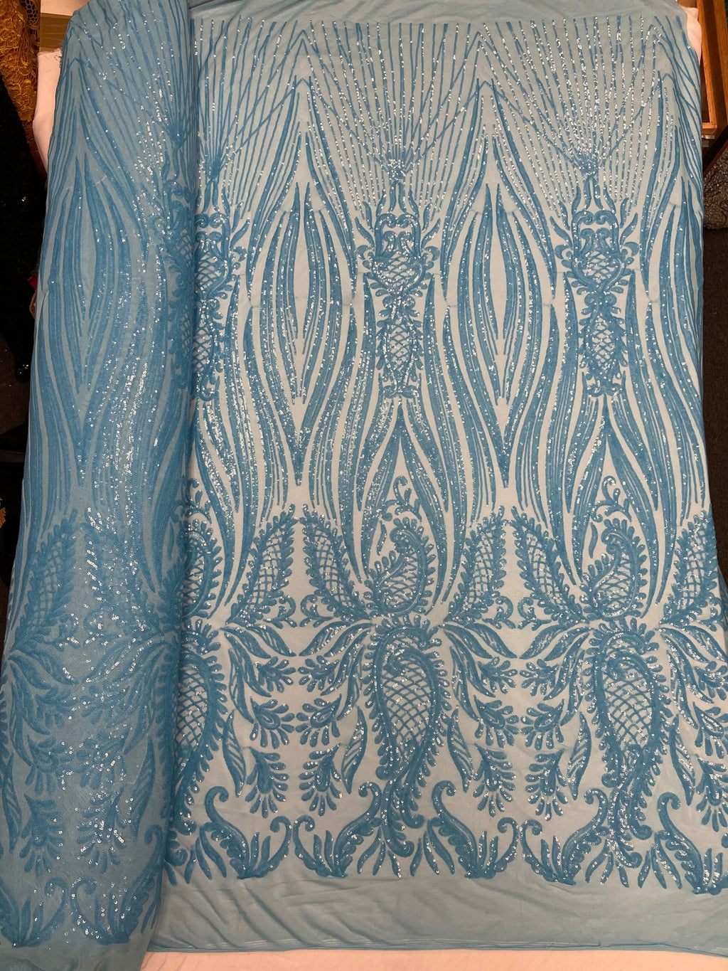 This Paisley design is embroidered with iridescent Sequins on a 4 Way Stretch mesh fabric. The iridescent Sequins has especial and extraordinary design on the Mesh . It is super elegant and classy, The royalty design embroider with iridescent Sequins on a mesh can be use for dresses, tablecloths, night gowns, Skirts, prom dresses, wedding dresses, runners for tables, decoration and much more.