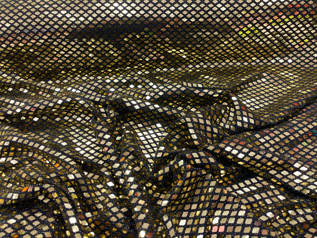 Gold Diamond Sequin On Black Metallic Lurex 2 Way Stretch Fabric- Sold By The Yard