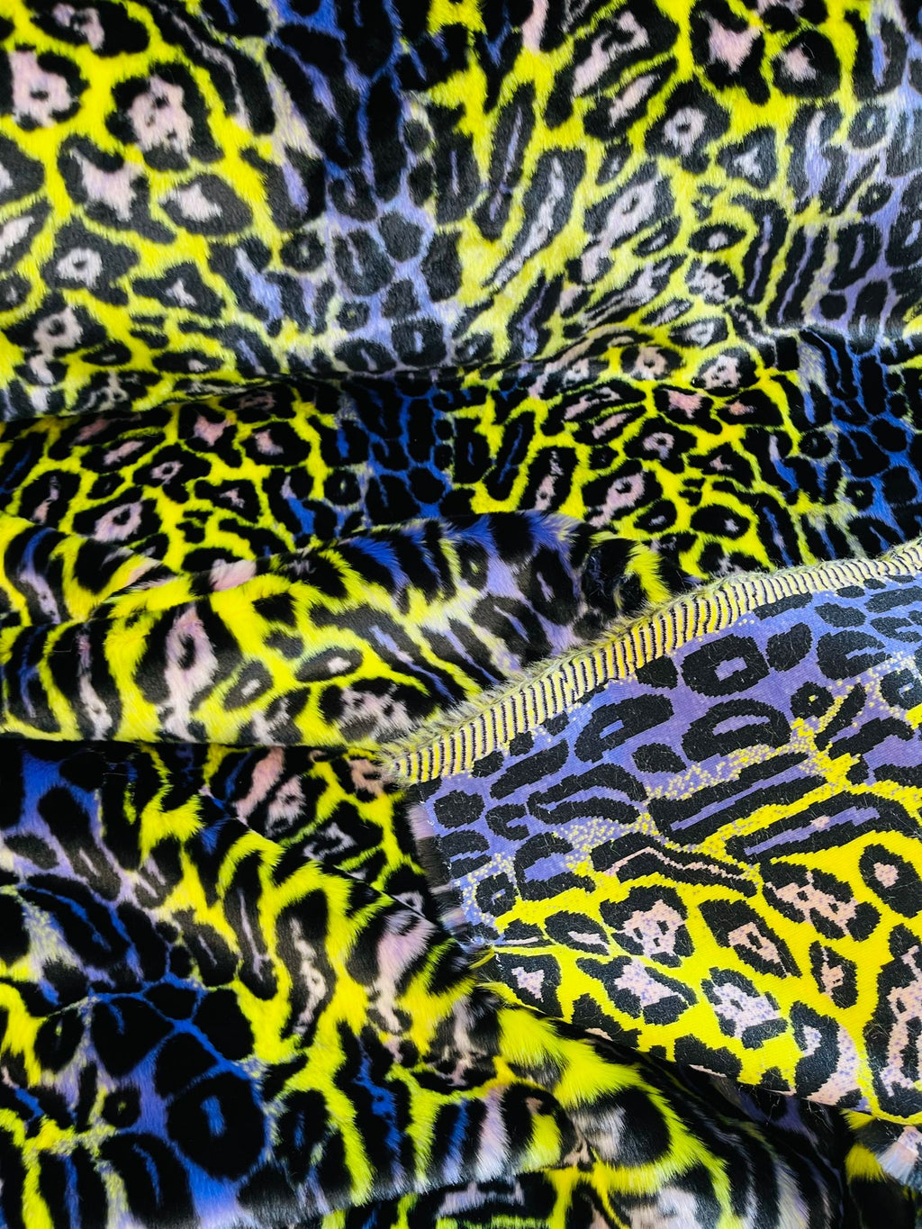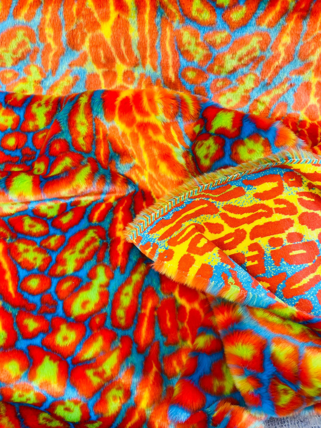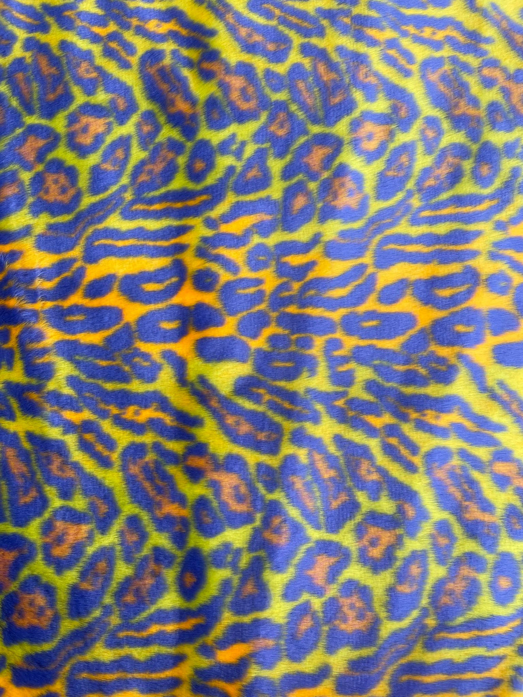 Unleash your wild side with this Leopard Tie Dyed Faux Fur. This luxurious fabric boasts a striking leopard print design in a vibrant tie-dye pattern, adding a touch of fierce glamour to any project. Crafted from high-quality faux fur material, it offers a plush and sumptuous texture that feels incredibly soft to the touch. The black light reflective feature adds an electrifying glow, perfect for creating eye-catching costumes, accessories, or decor pieces that truly stand out. With its versatile and durable construction, this faux fur fabric is ideal for a wide range of applications, from fashion to home decor. Elevate your creativity and let your imagination run wild with this captivating Leopard Tie Dyed Faux Fur.