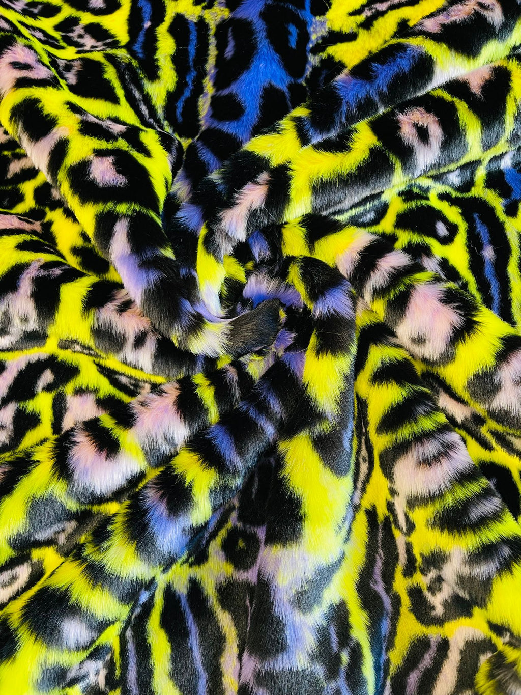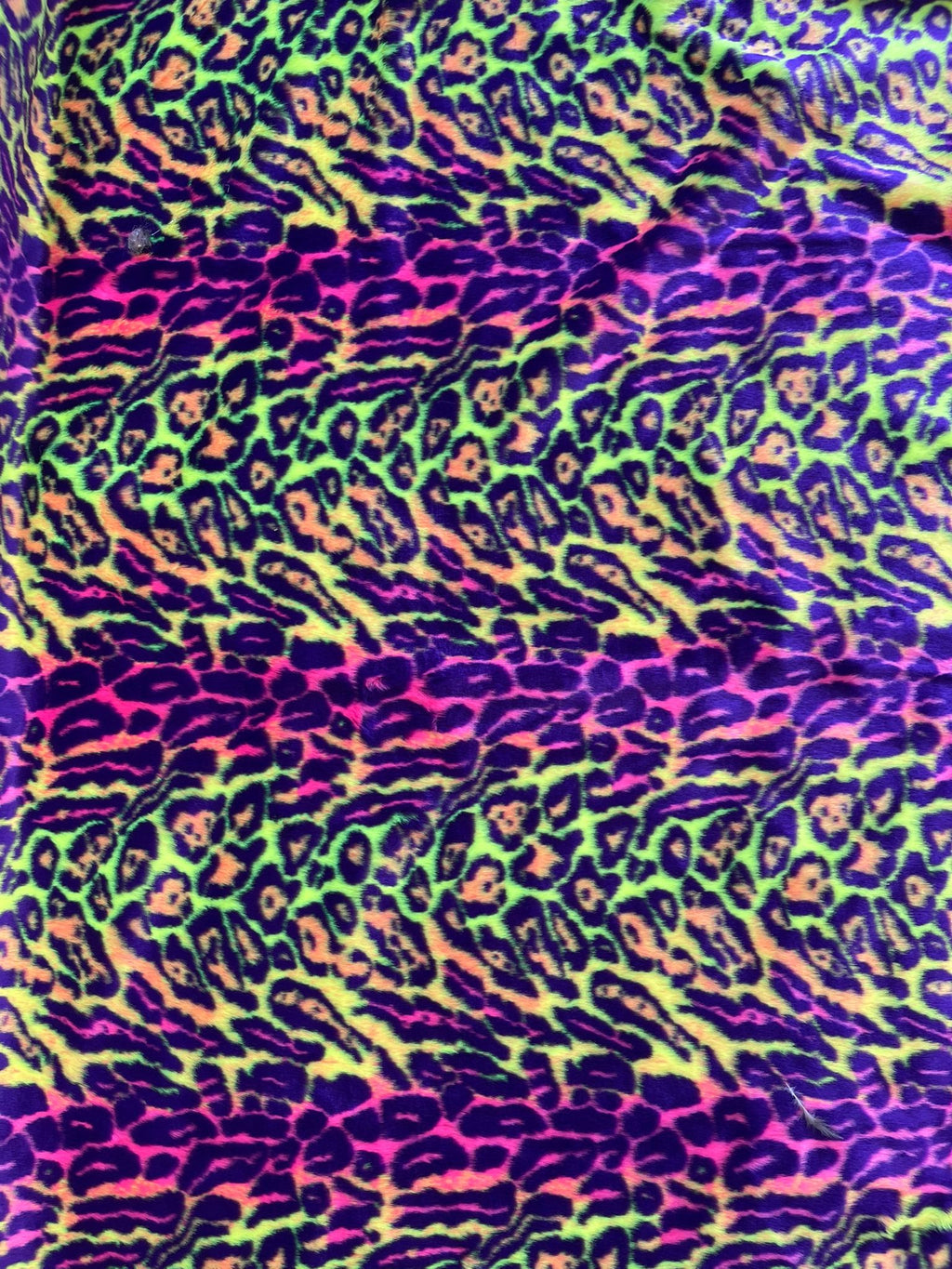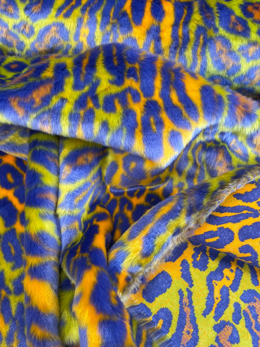Unleash your wild side with this Leopard Tie Dyed Faux Fur. This luxurious fabric boasts a striking leopard print design in a vibrant tie-dye pattern, adding a touch of fierce glamour to any project. Crafted from high-quality faux fur material, it offers a plush and sumptuous texture that feels incredibly soft to the touch. The black light reflective feature adds an electrifying glow, perfect for creating eye-catching costumes, accessories, or decor pieces that truly stand out. With its versatile and durable construction, this faux fur fabric is ideal for a wide range of applications, from fashion to home decor. Elevate your creativity and let your imagination run wild with this captivating Leopard Tie Dyed Faux Fur.