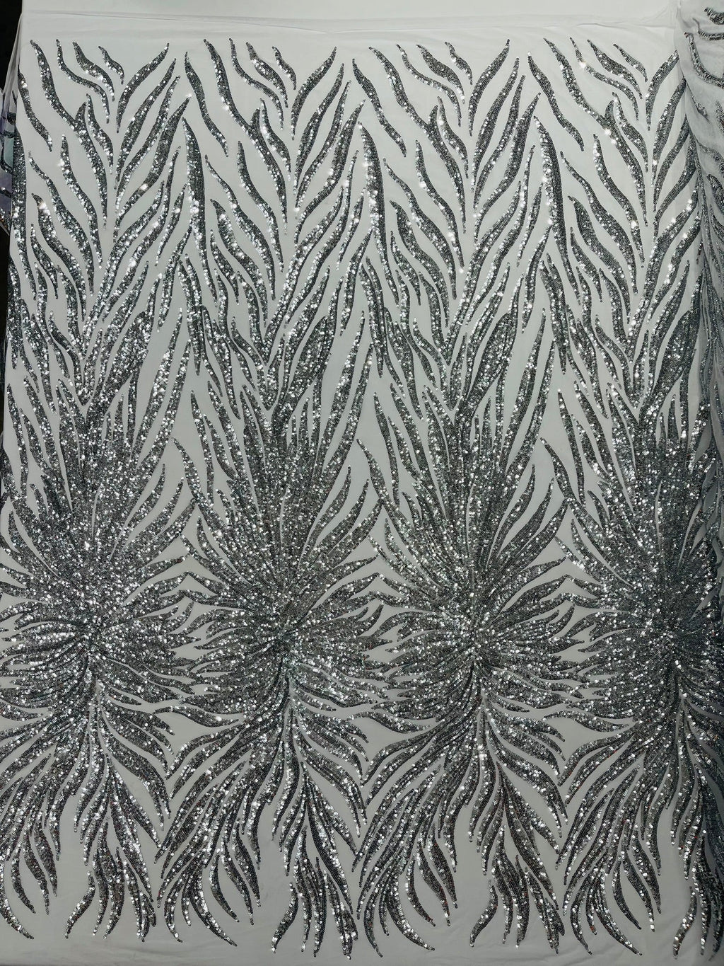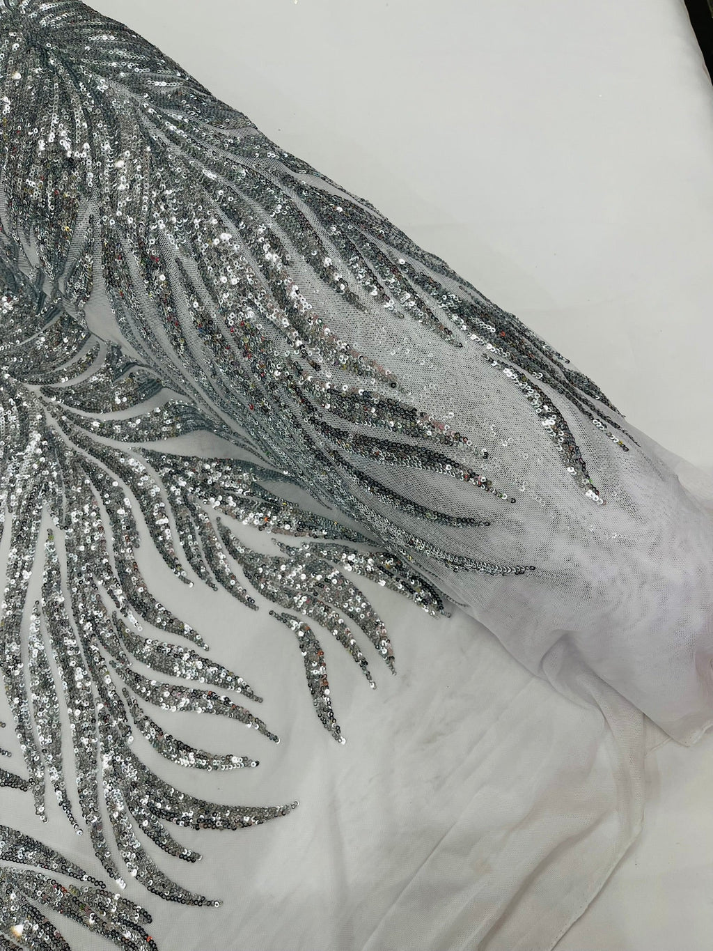 This Phoenix Wings design is embroidered with Sequins on a 4 Way Stretch mesh fabric. The Sequins has especial and extraordinary design on the Mesh . It is super elegant and classy, The flame design embroider with iridescent Sequins on a mesh can be use for dresses, tablecloths, night gowns, Skirts, prom dresses, wedding dresses, runners for tables, decoration and much more.