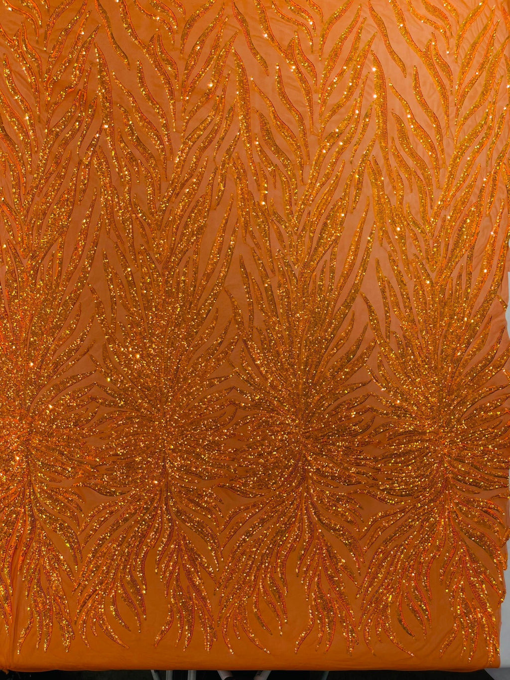 sequin flame design on a 4 way stretch mesh-sold by the yard.