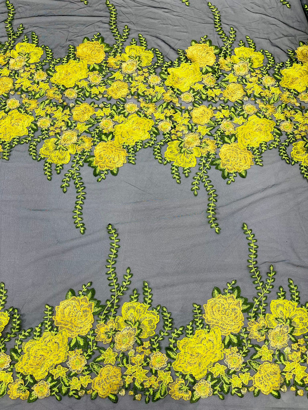 This multi color floral design is embroidered on a mesh lace fabric. It is very elegant and classy for special occasions. This lace has a rich double scallop. This lace mas multi color flowers that give you a rich look and brilliant look. The lace can be use for dresses, tablecloths, night gowns, Skirts, decoration and much more.