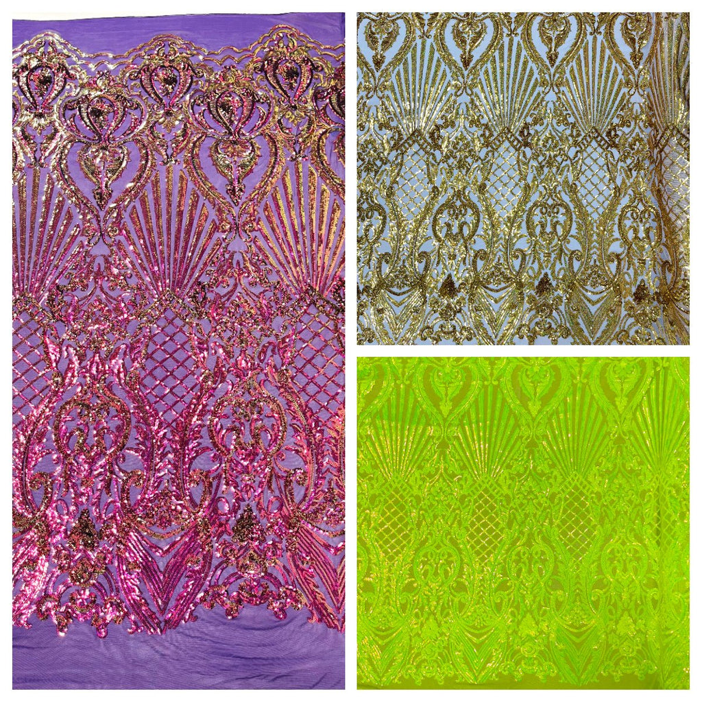 This shell damask design is embroidered with iridescent Sequins on a 4 Way Stretch mesh fabric. The iridescent Sequins has especial and extraordinary design on the Mesh . It is super elegant and classy, The royalty design embroider with iridescent Sequins on a mesh can be use for dresses, tablecloths, night gowns, Skirts, prom dresses, wedding dresses, runners for tables, decoration and much more.