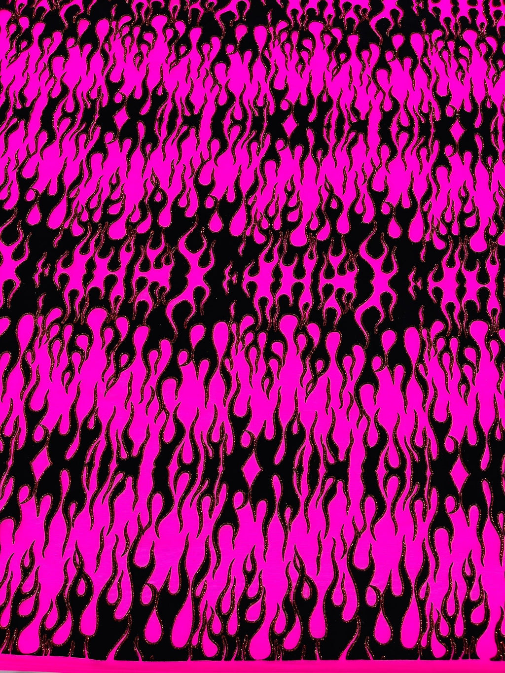 Transform your creative projects with this striking Power Mesh fabric featuring bold black flocking flames and eye-catching red glitter accents. At a generous 60 inches wide, this fabric offers ample material for automotive interiors, custom upholstery, or distinctive fashion pieces. The mesh base provides excellent breathability while the flocked flame pattern adds depth and texture. Perfect for hot rod enthusiasts looking to add that extra flair to their vehicle's interior, or designers seeking a unique material for statement pieces. The combination of black flames and sparkling red glitter creates a dynamic, head-turning effect that captures the essence of custom car culture. This versatile fabric can be used for seats, panels, accent pieces, or anywhere you want to make a bold statement. The durable construction ensures your creation maintains its striking appearance.