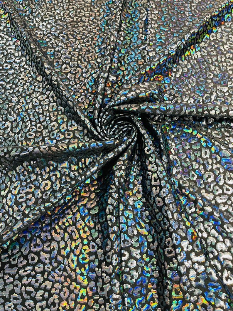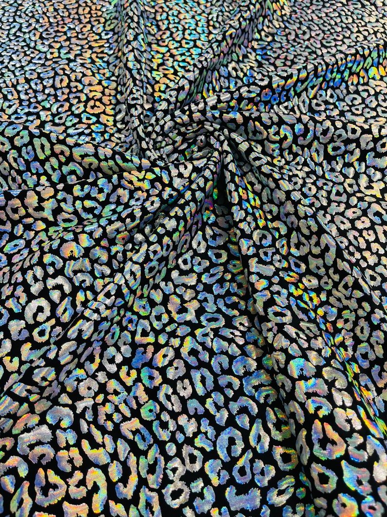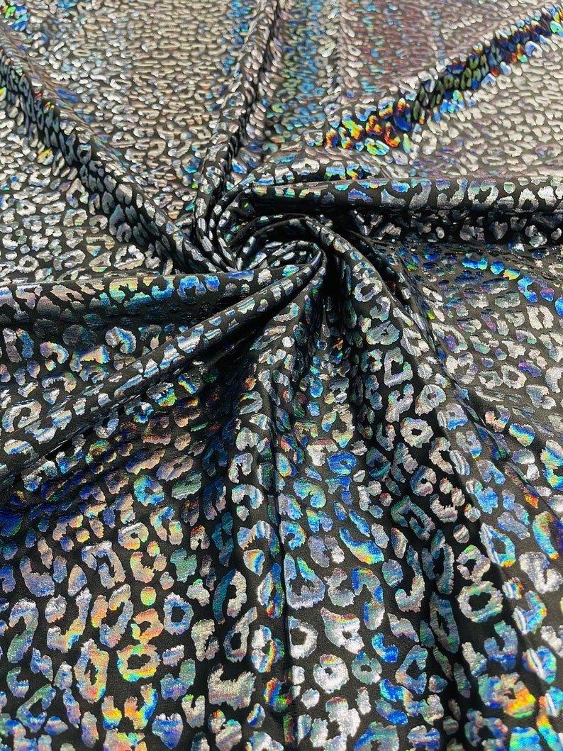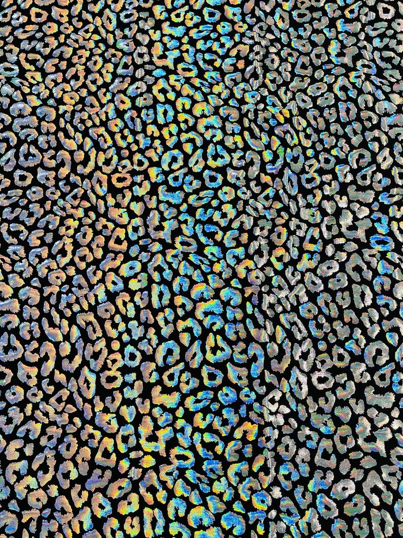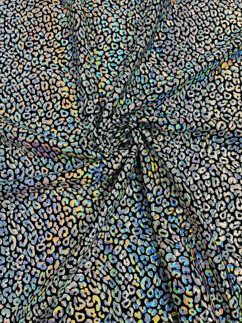 This leopard stretch fabric is 80% Nylon and 20% Spandex with a black stretch milliskin . It features a reflective and shimmering leopard print. This leopard print is Ideal for costumes, dresses, leggings, clothing, nightgowns, prom dresses, swim suits, interior decor and much more.