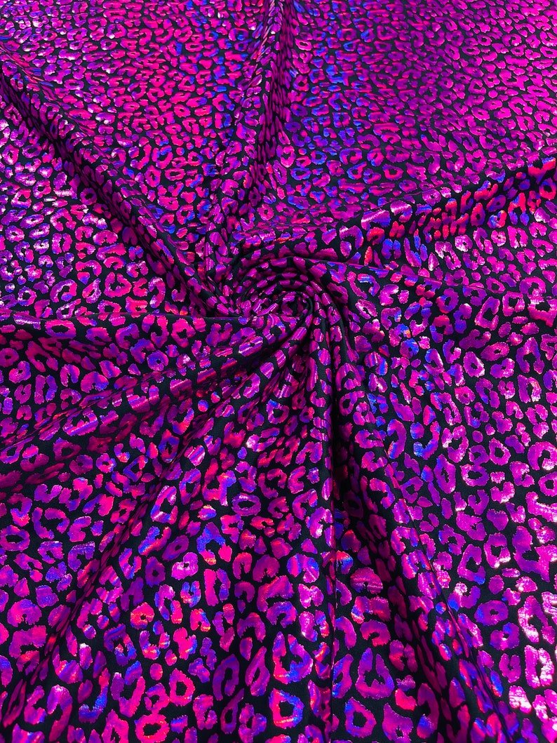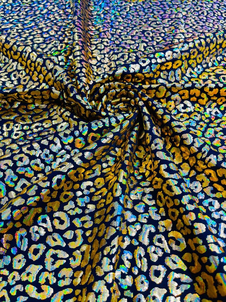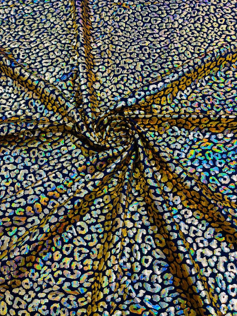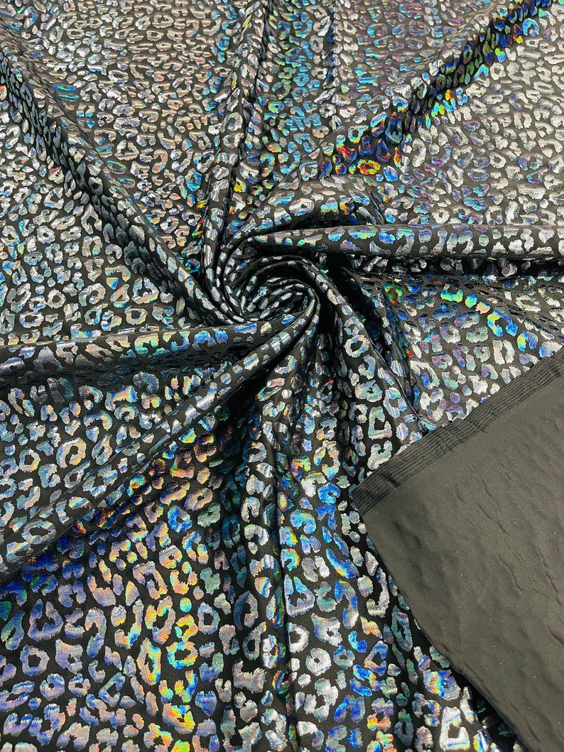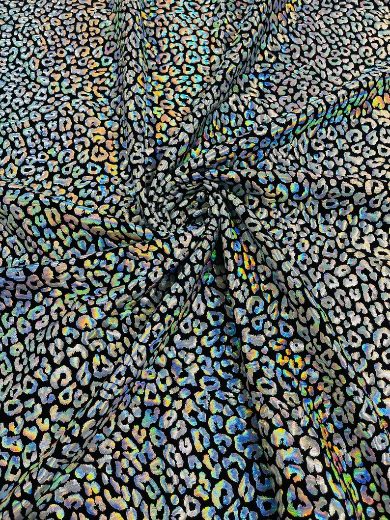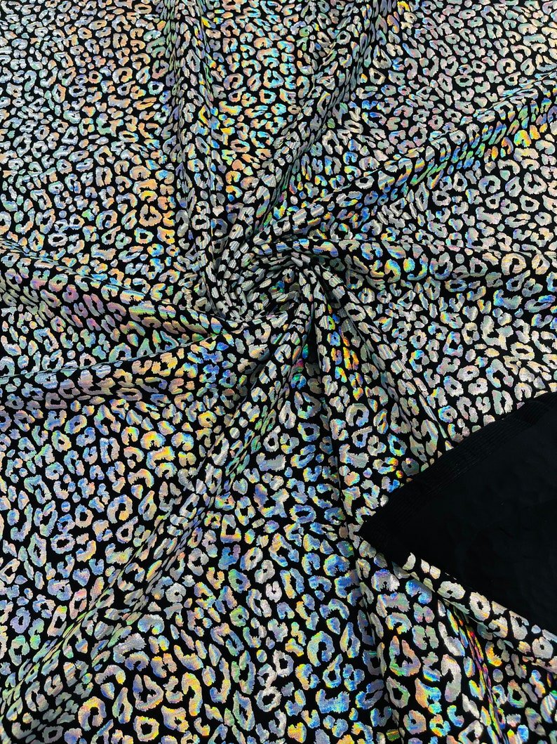 This leopard stretch fabric is 80% Nylon and 20% Spandex with a black stretch milliskin . It features a reflective and shimmering leopard print. This leopard print is Ideal for costumes, dresses, leggings, clothing, nightgowns, prom dresses, swim suits, interior decor and much more.