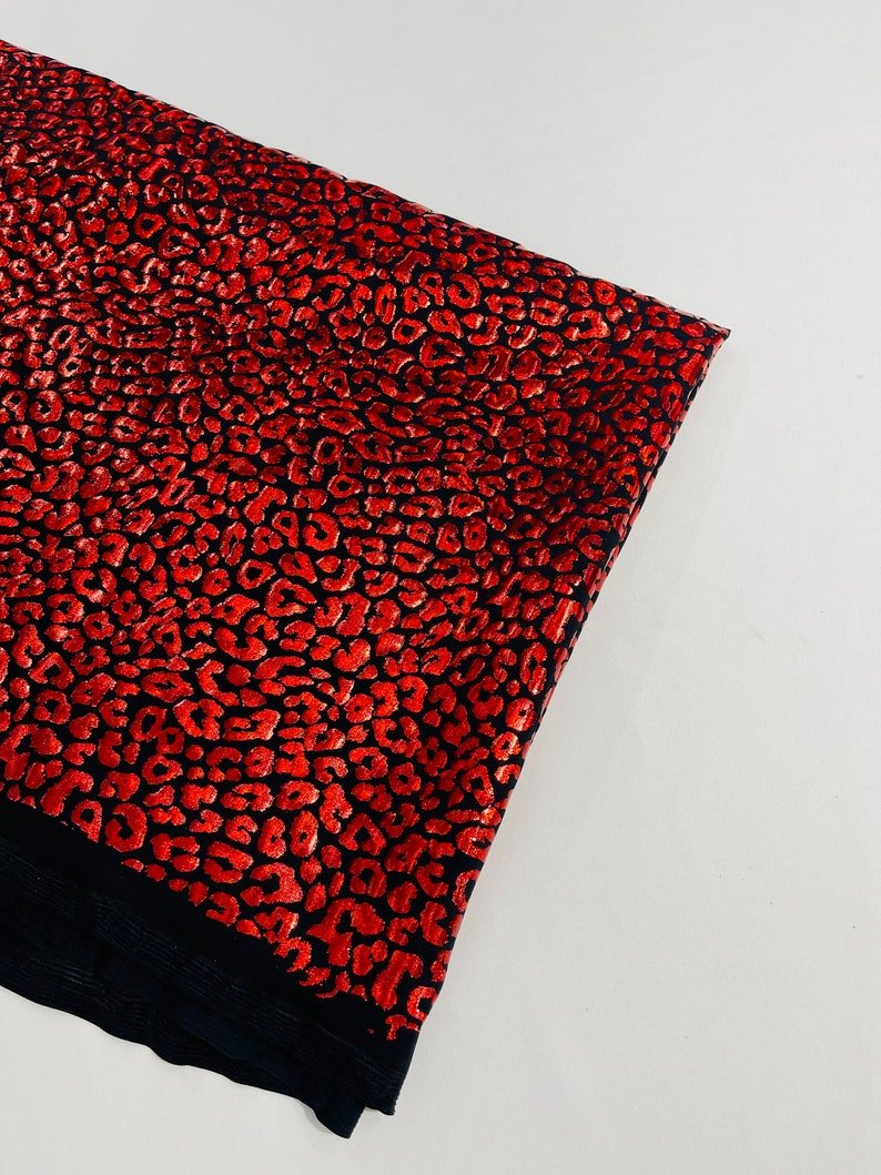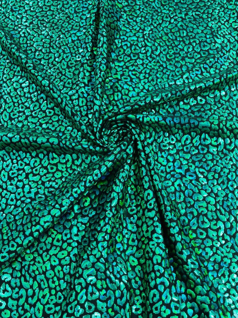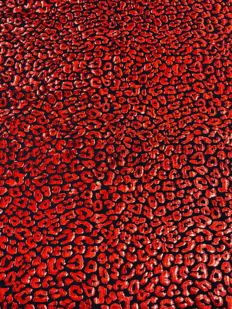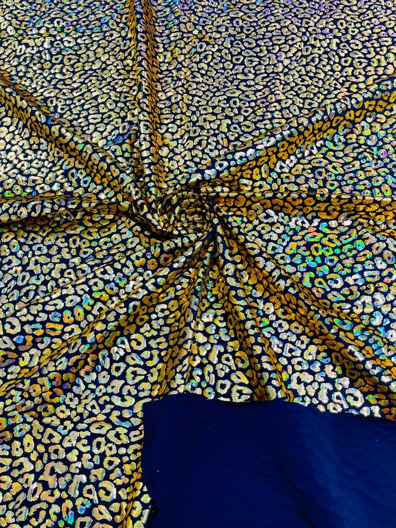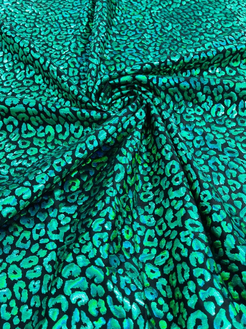 This leopard stretch fabric is 80% Nylon and 20% Spandex with a black stretch milliskin . It features a reflective and shimmering leopard print. This leopard print is Ideal for costumes, dresses, leggings, clothing, nightgowns, prom dresses, swim suits, interior decor and much more.