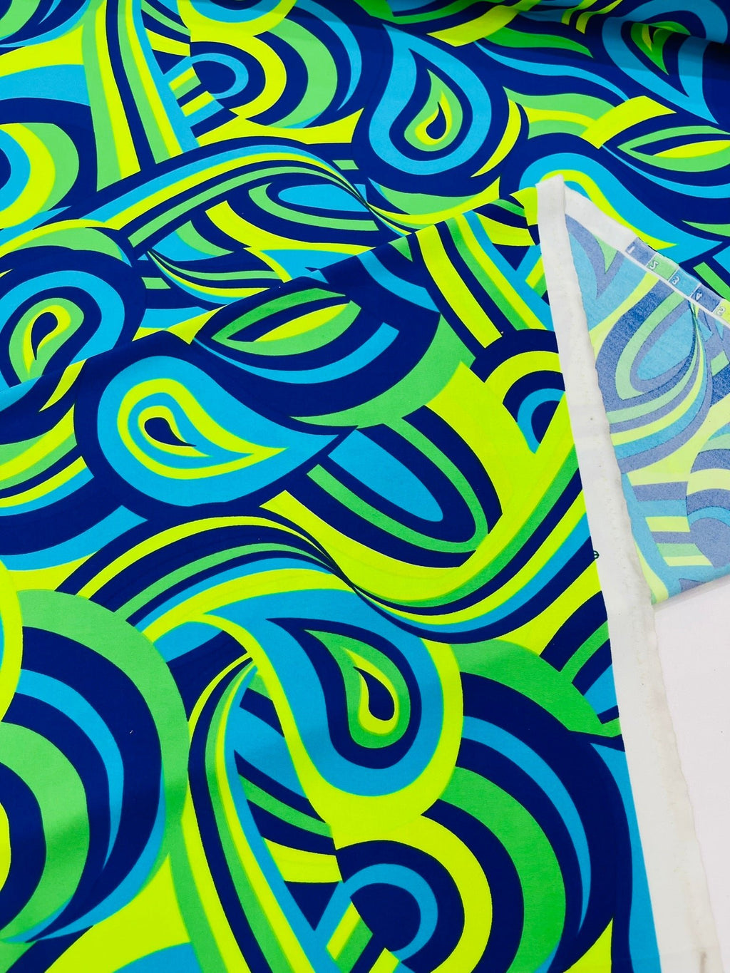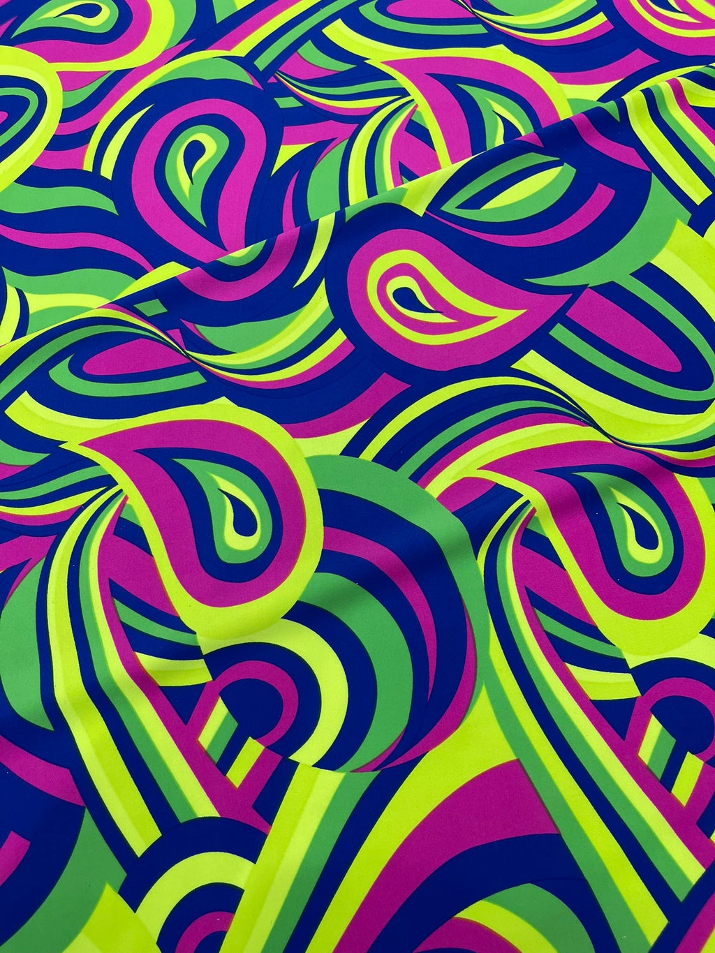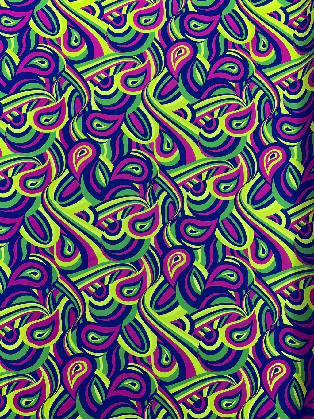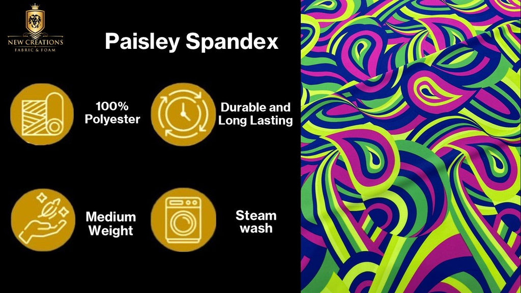 Transform your creative projects with this stunning Retro Paisley Spandex fabric from New Creations Fabric & Foam Inc. This versatile material, sold by the yard, features a classic paisley pattern that brings a touch of vintage charm to any design. The spandex blend offers excellent stretch and recovery, making it perfect for dancewear, costumes, athletic wear, or form-fitting garments. The fabric's smooth texture and consistent stretch in all directions ensure comfort and ease of movement. Whether you're creating performance wear, fashion pieces, or unique home decor items, this retro-inspired fabric combines style with functionality. The bold paisley design adds visual interest while the spandex component provides durability and shape retention. This fabric is ideal for both experienced sewists and creative enthusiasts looking to bring their designs to life.