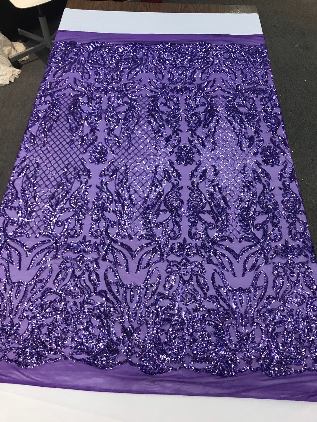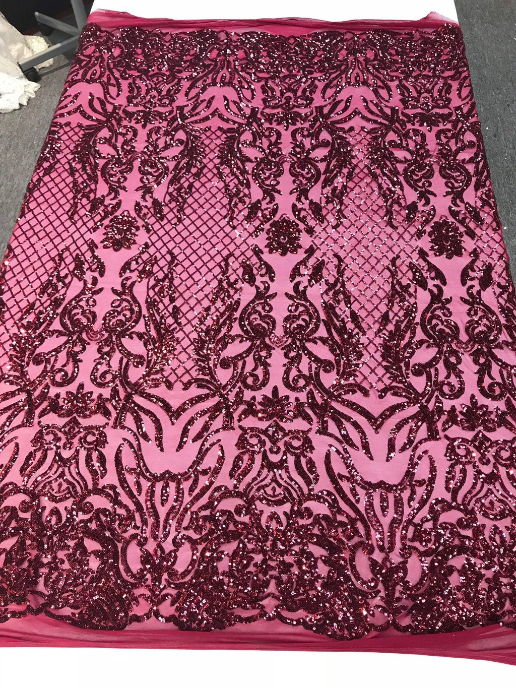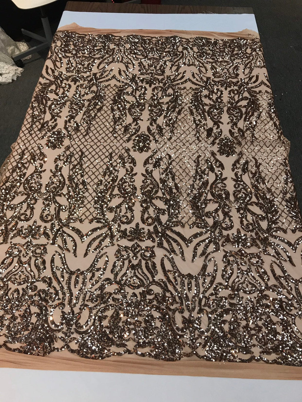 Shiny sequin damask design embroidery on a 4 way stretch mesh-dresses-prom-nightgown-sold by yard-free shipping.