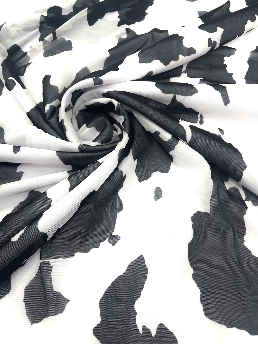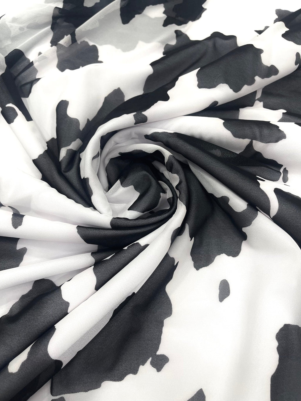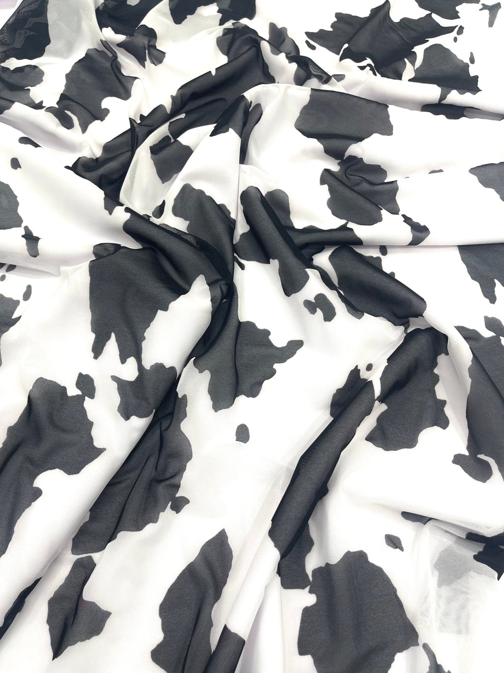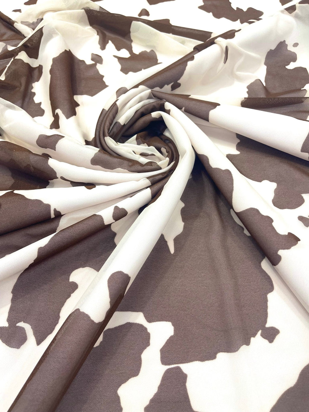 This Cow Print 4 Way Stretch Power Mesh 58" Wide fabric. The cow print has especial and extraordinary design on the Mesh . It is super elegant and classy, The cow design is printed on a power mesh and its used for dresses, tablecloths, night gowns, Skirts, prom dresses, wedding dresses, runners for tables, decoration and much more.