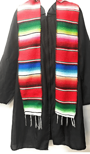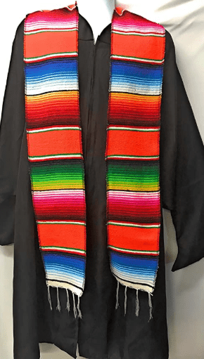 Graduation Stole Sash made from authentic Mexican serape blankets from Mexico. Great way to show your Mexican or Latino pride. Each sash measures 5" Wide by 76" Long with fringe on both ends. Available in a number of colors. Great for Latin American studies majors or minors. These are made of thick woven thread so they will lay flat, WILL NOT curl up on the ends like other brands.
