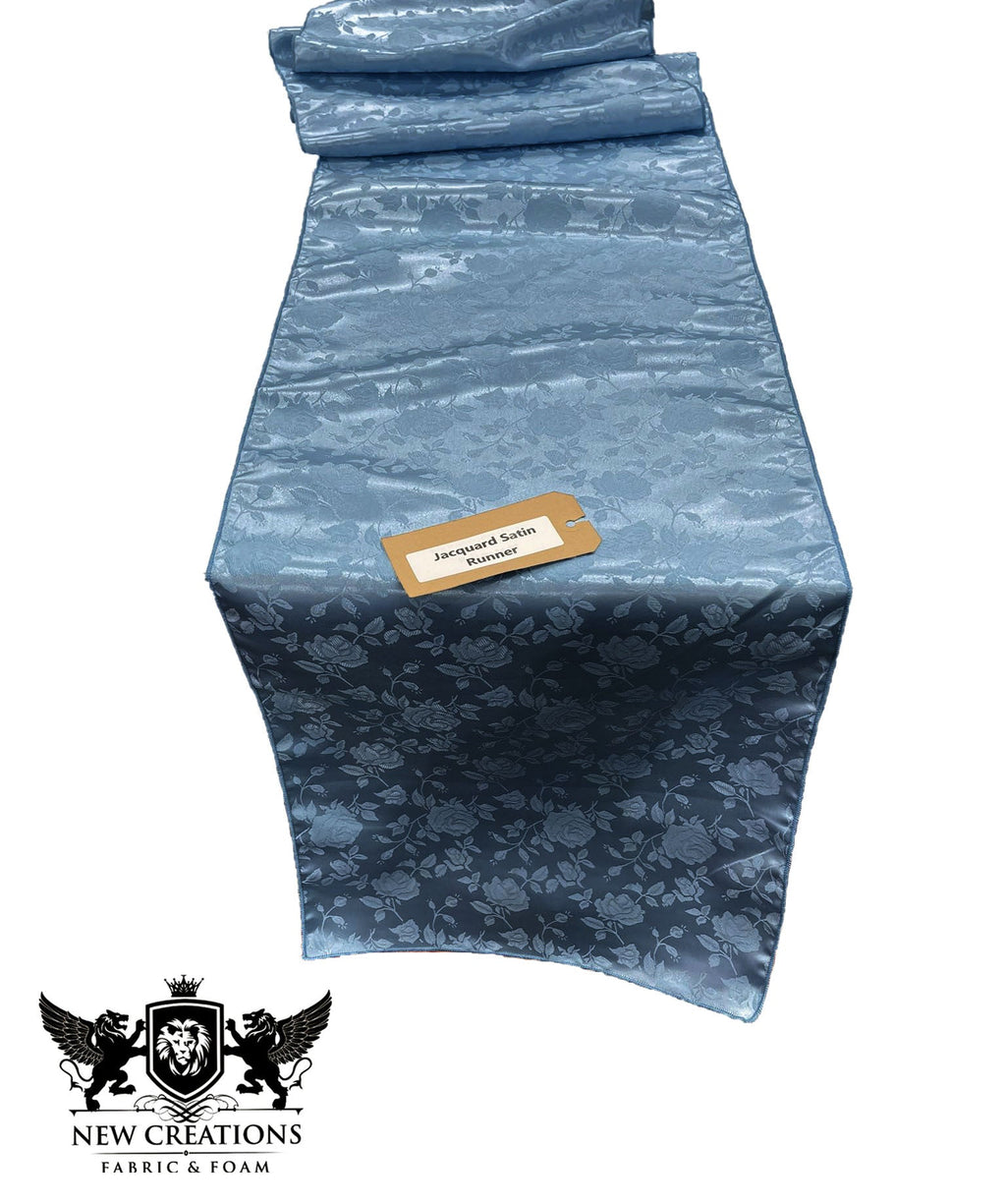 This elegant satin runner adds a touch of romance to any table setting. Crafted of luxurious jacquard satin adorned with a repeating rose motif, it effortlessly elevates the atmosphere. its generous size allows it to drape gracefully down the full length of your table. The satin material lends a silky softness that feels lovely to the touch while remaining durable enough for frequent use. Its neutral ecru hue makes it a versatile accent, pairing beautifully with tableware and décor of any style or color palette. Wipe clean as needed to maintain its lustrous sheen. This quality satin runner from New Creations Fabric & Foam Inc. will enhance your special events in refined style for years to come.