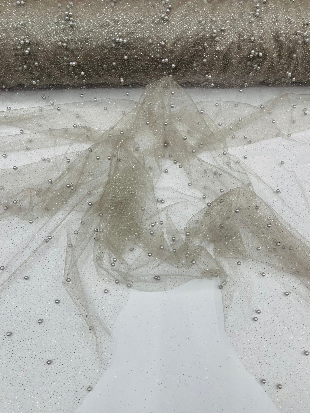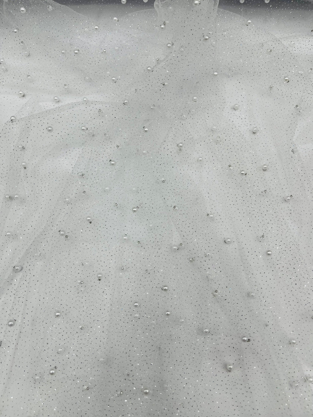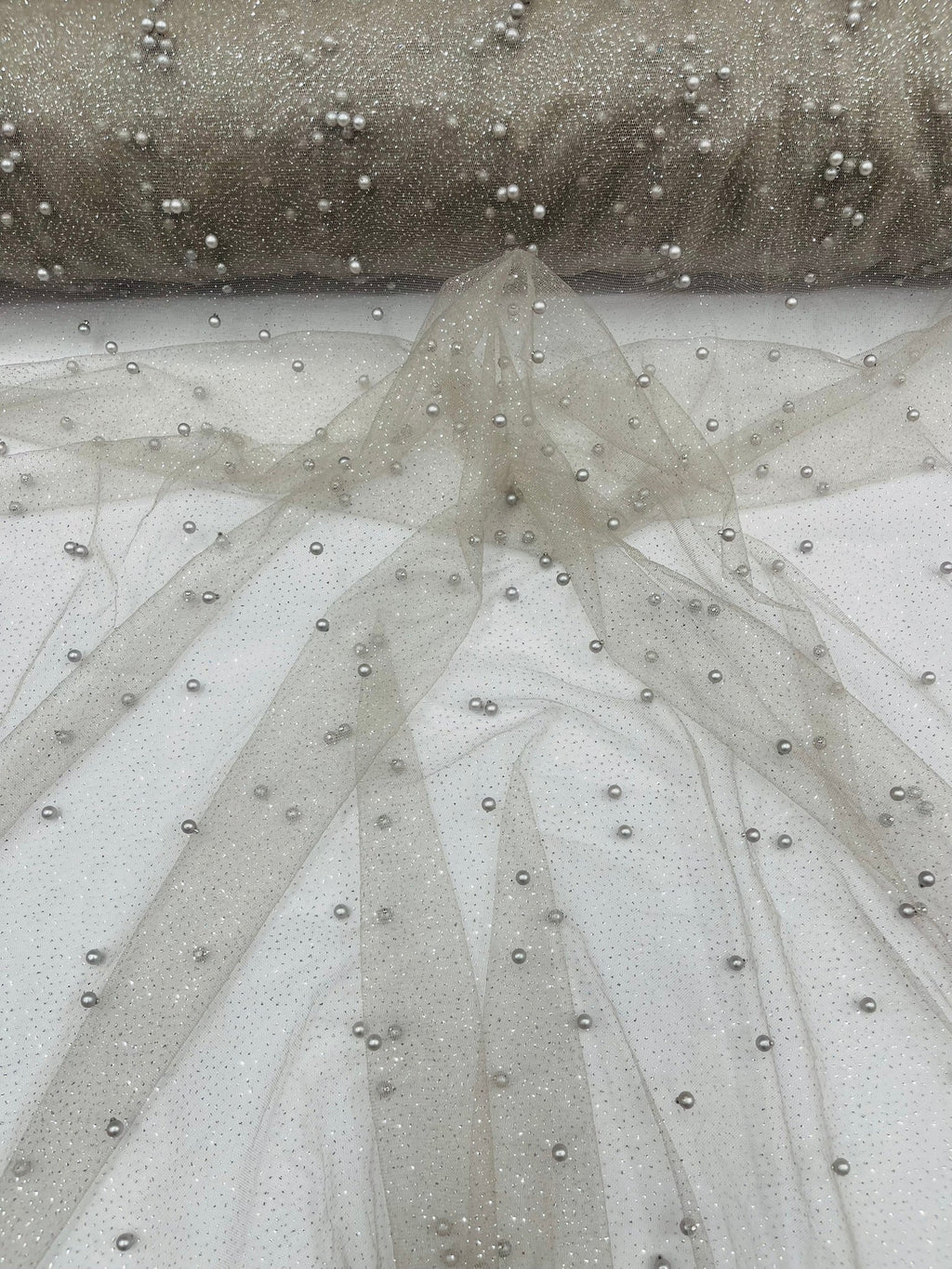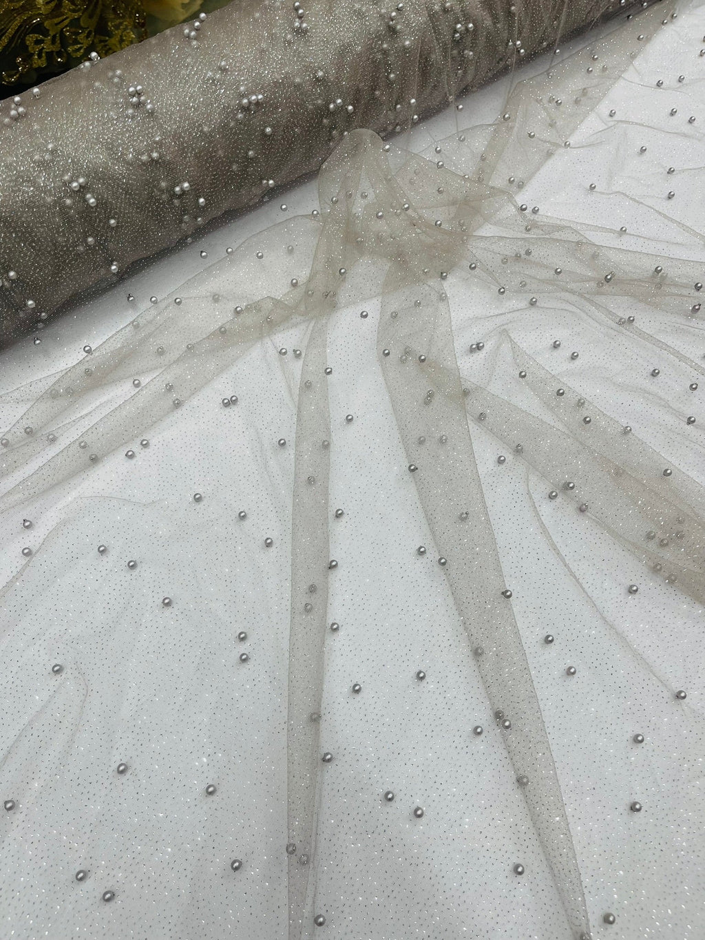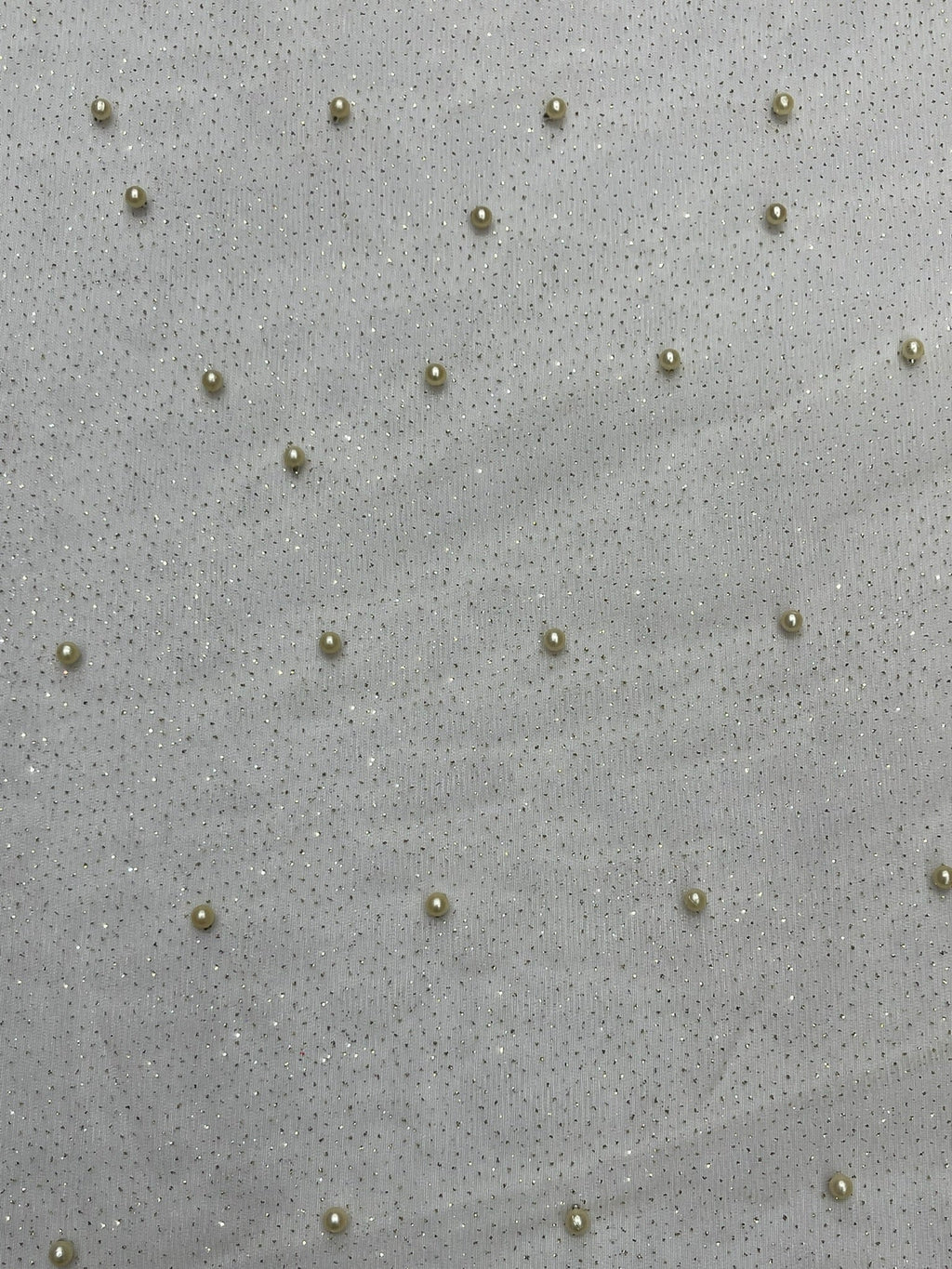 This Glitter Studded mesh fabric embroidered with pearls, It is a 2-way stretch mesh fabric. width of 60" wide this fabric is suitable for tailoring of final and wedding dresses, skirts, corsets and décor.