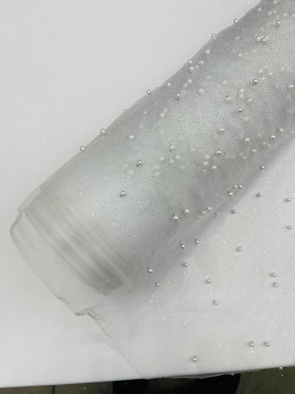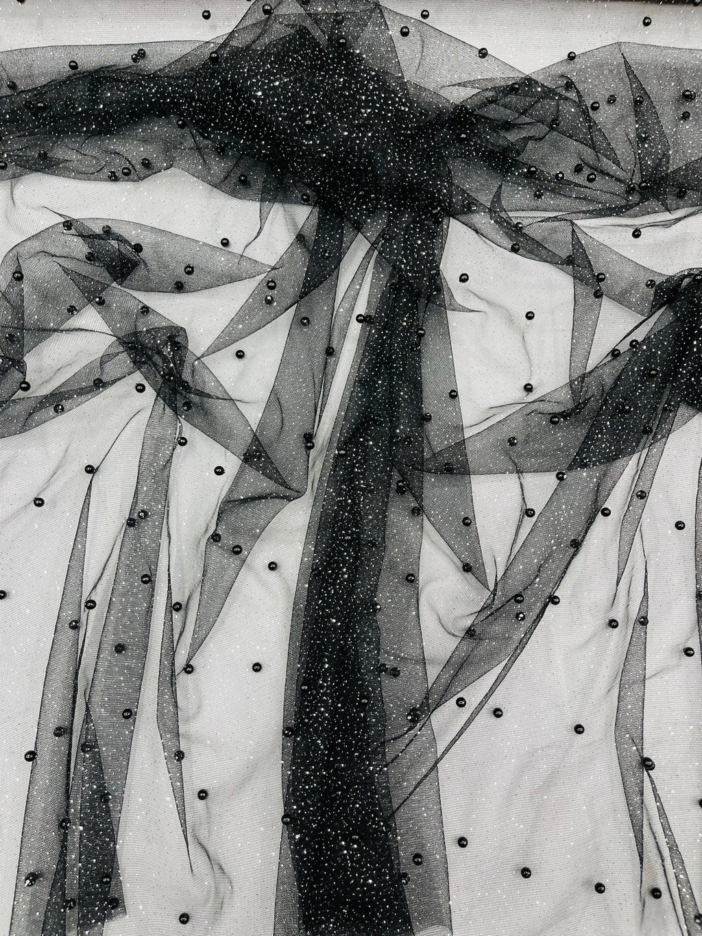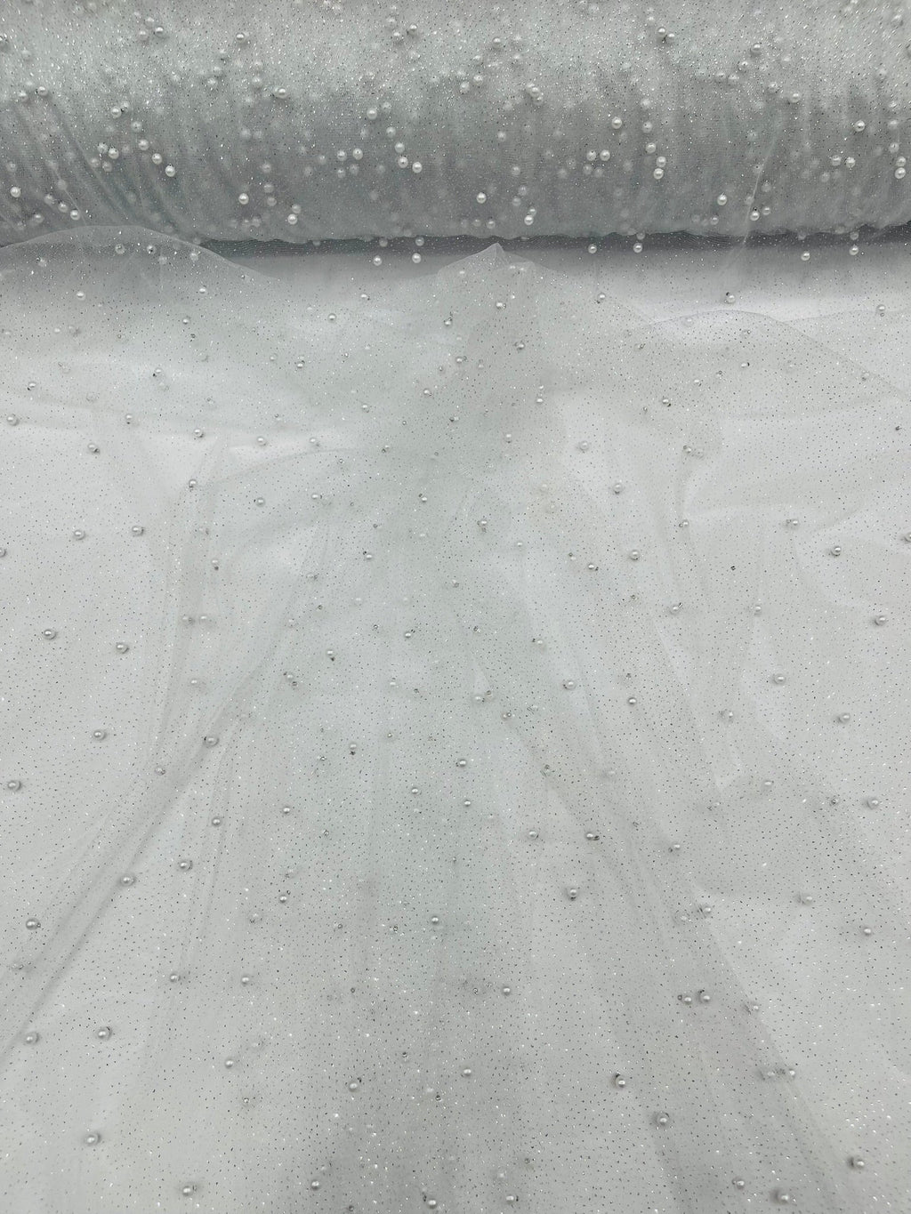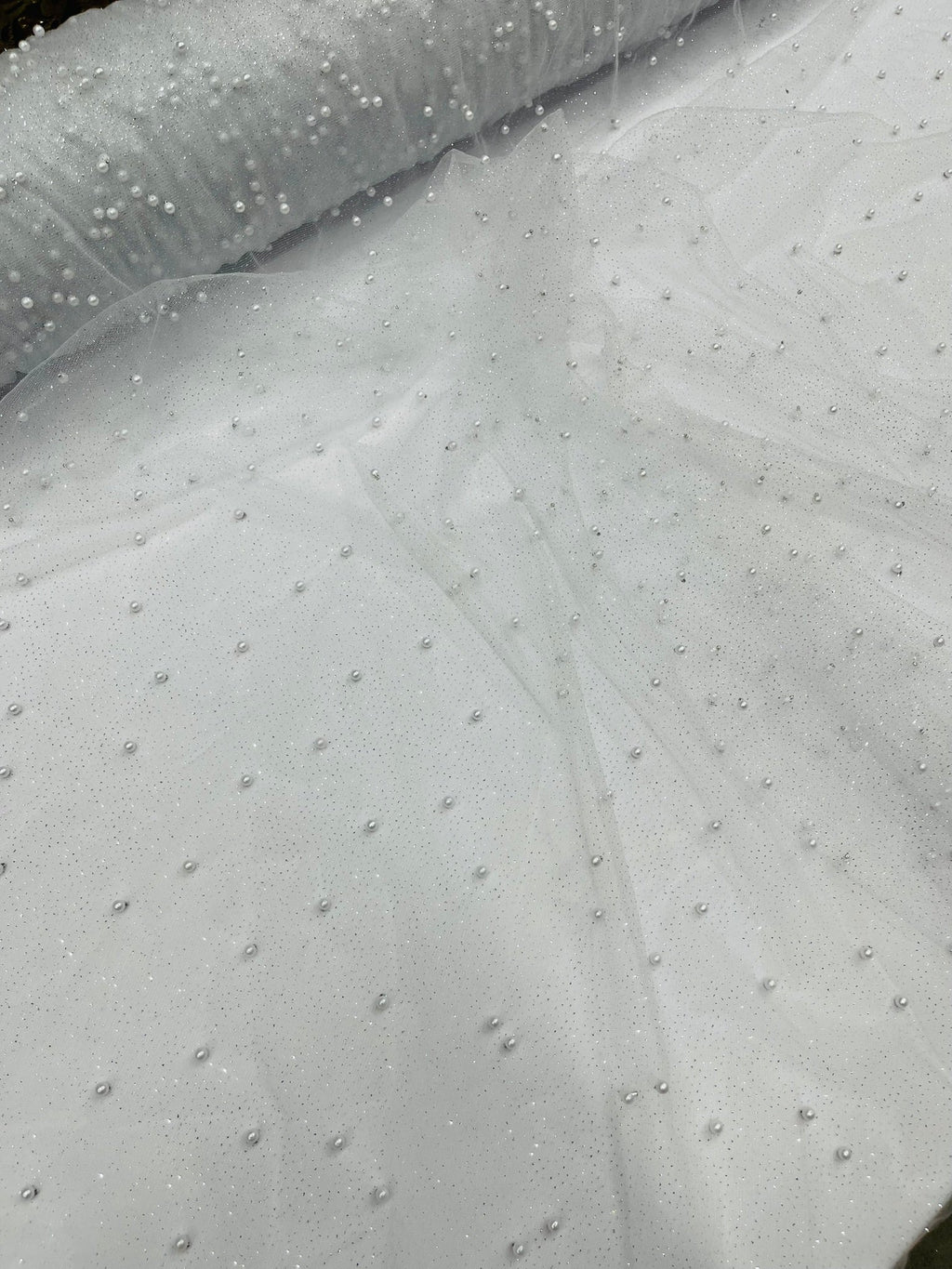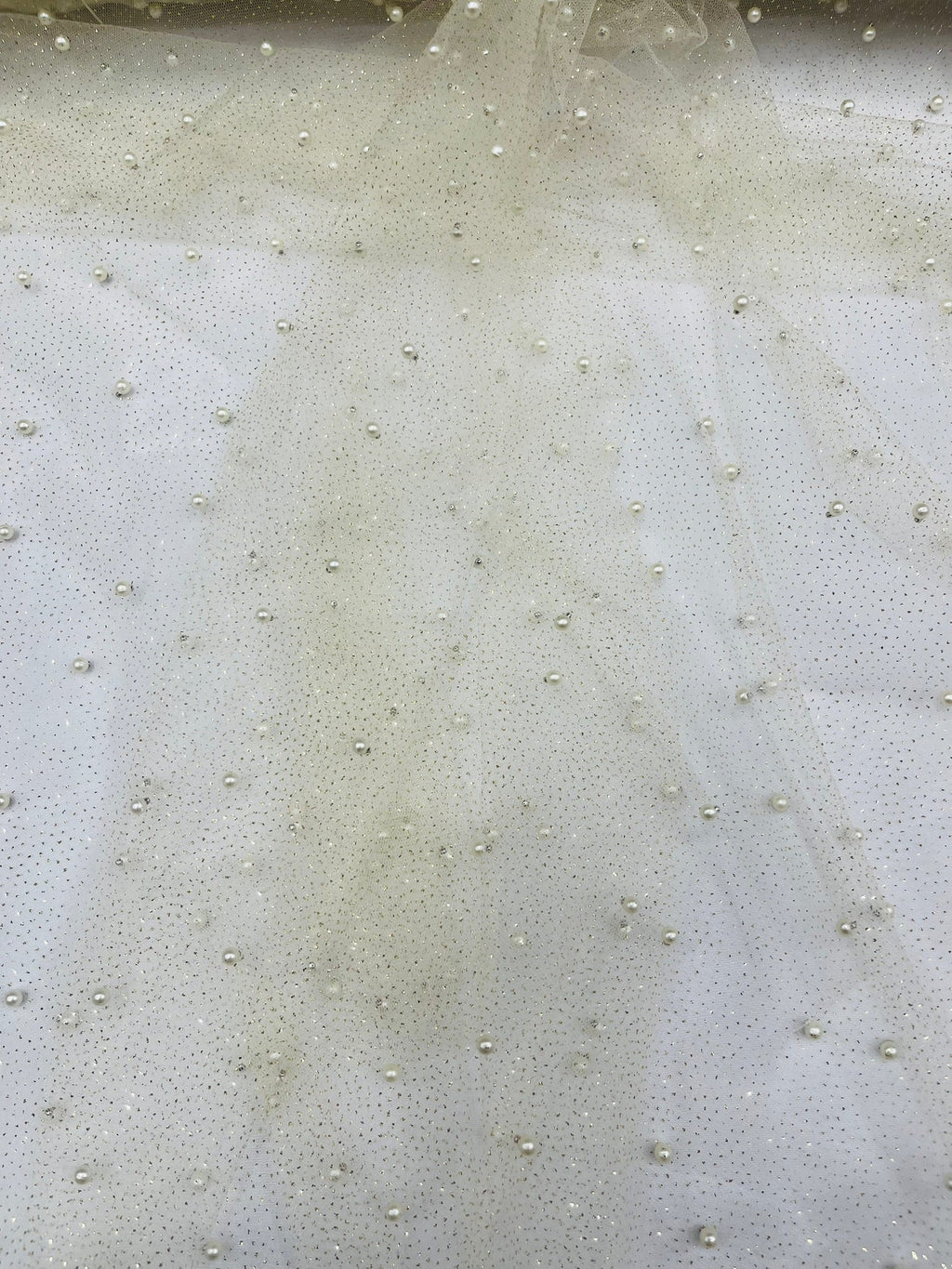 This Glitter Studded mesh fabric embroidered with pearls, It is a 2-way stretch mesh fabric. width of 60" wide this fabric is suitable for tailoring of final and wedding dresses, skirts, corsets and décor.
