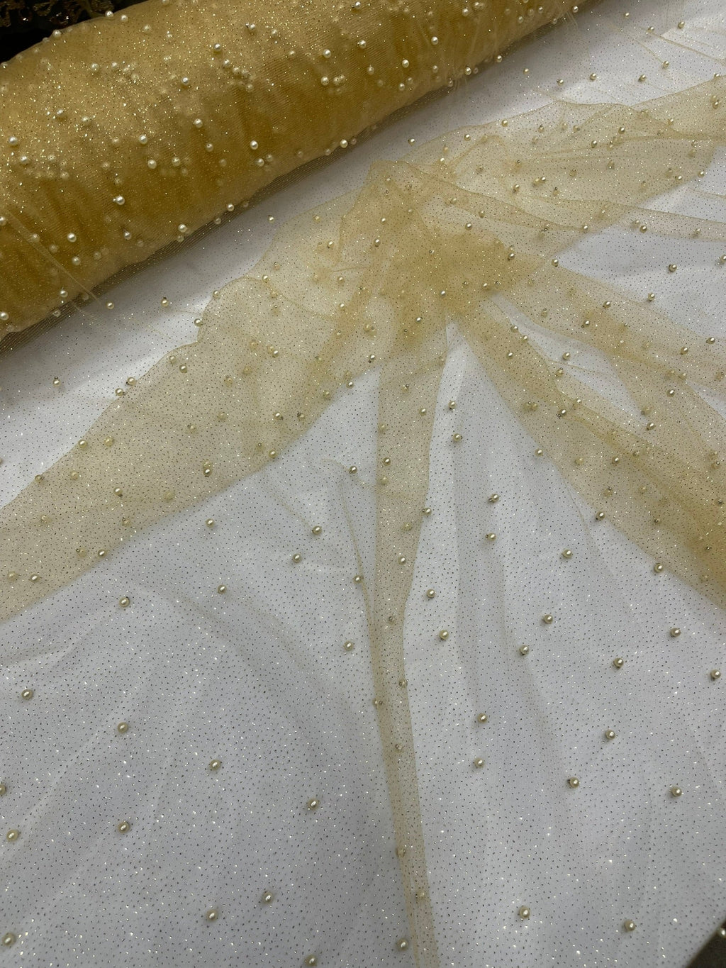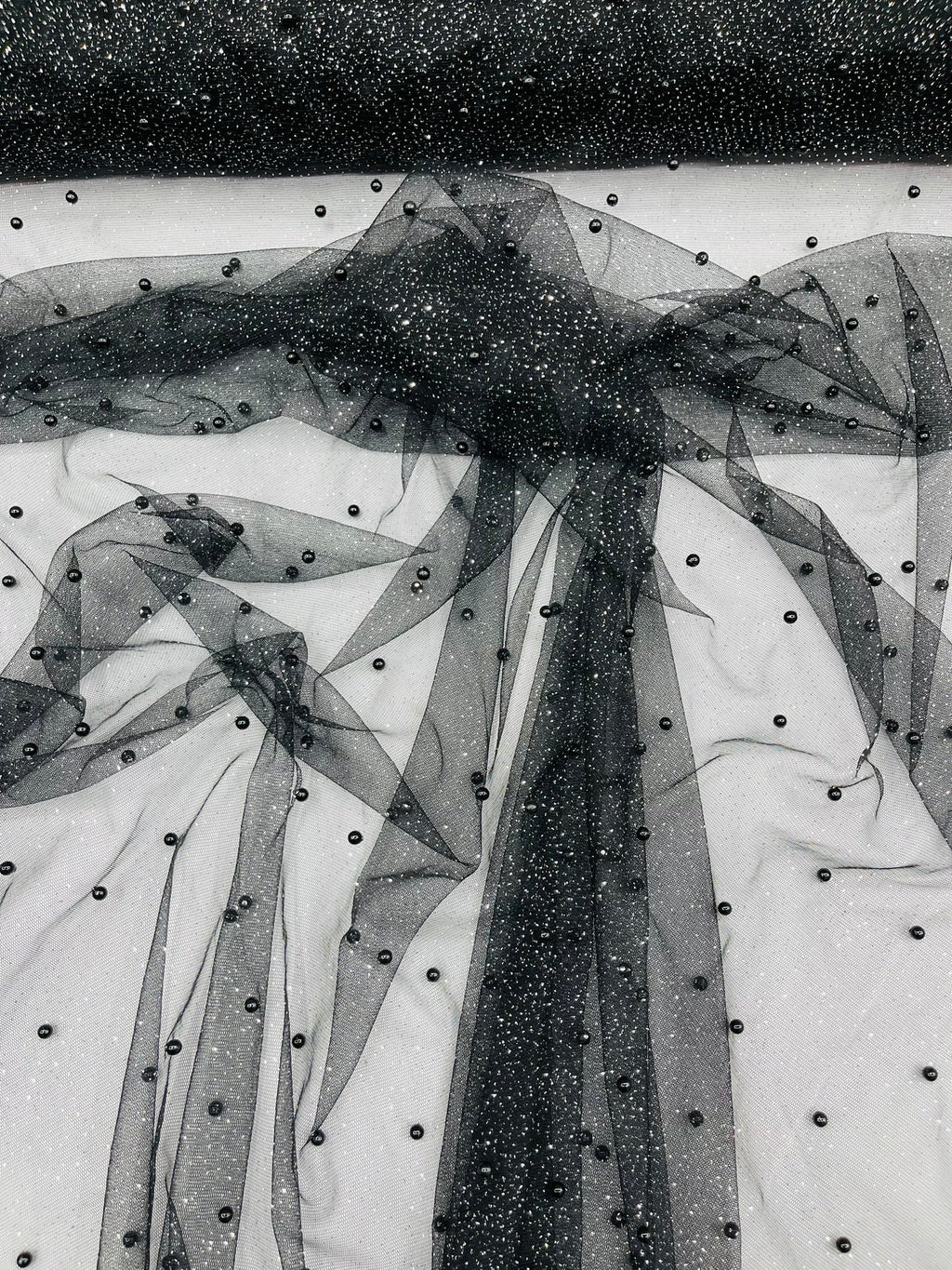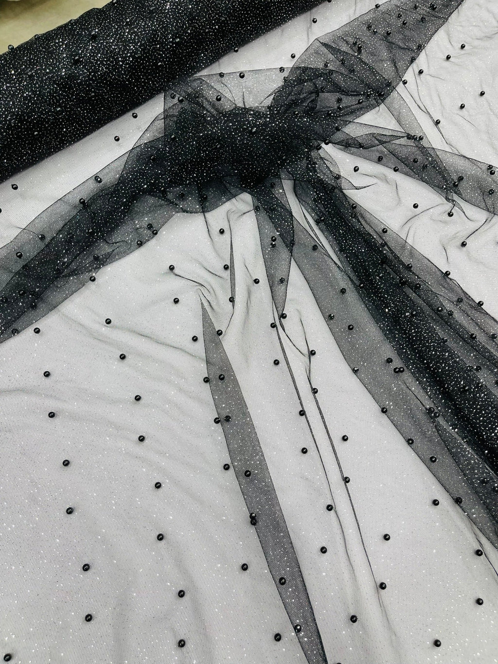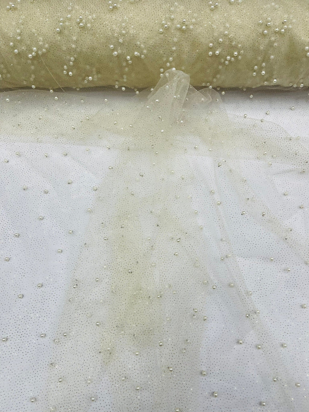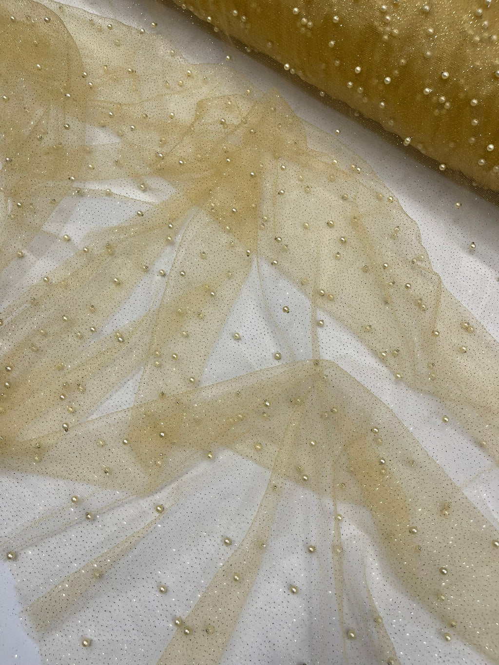 This Glitter Studded mesh fabric embroidered with pearls, It is a 2-way stretch mesh fabric. width of 60" wide this fabric is suitable for tailoring of final and wedding dresses, skirts, corsets and décor.