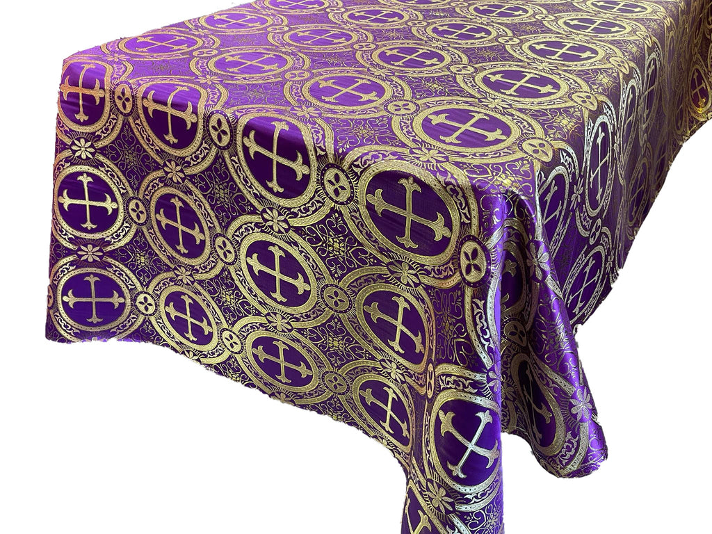 Elevate your table setting with the Square Metallic Cross Brocade Jacquard Satin Table Overlay. This luxurious fabric overlay is crafted from high-quality satin material with an intricate brocade jacquard pattern featuring a metallic cross design. Perfect for religious events, church services, or adding a touch of elegance to any occasion. The rich texture and shimmering metallic accents create a visually stunning centerpiece. Drape it over your table to transform the ambiance instantly. With its square shape, this overlay offers versatility in sizing to fit various table dimensions. Enhance your decor with this remarkable liturgical fabric.