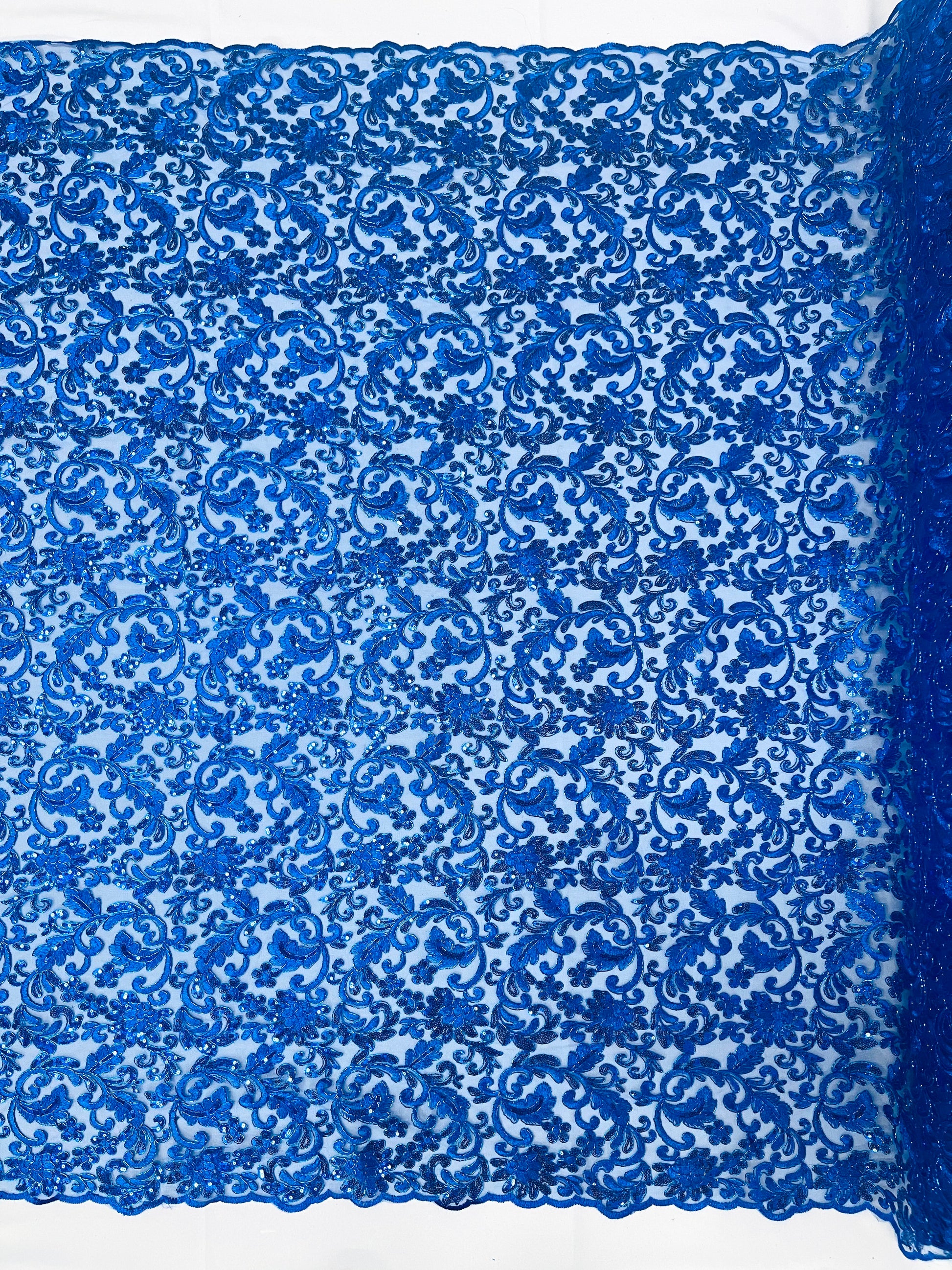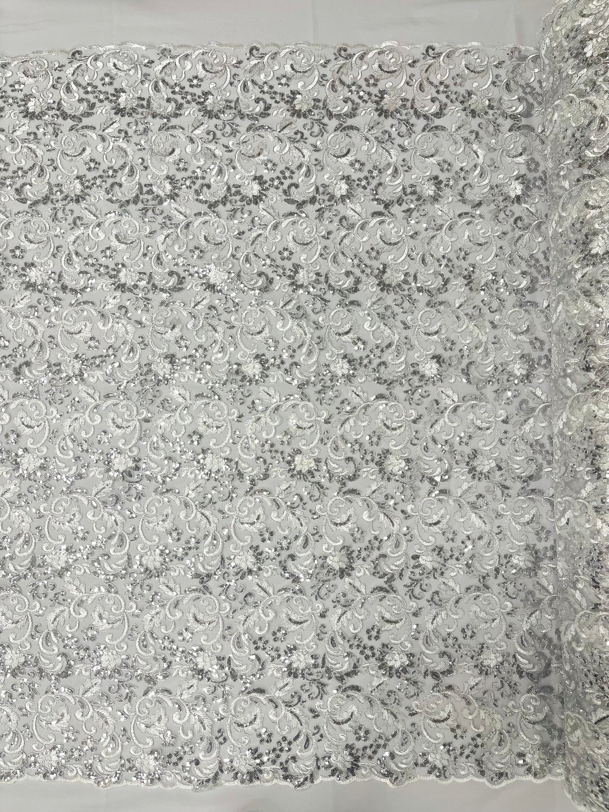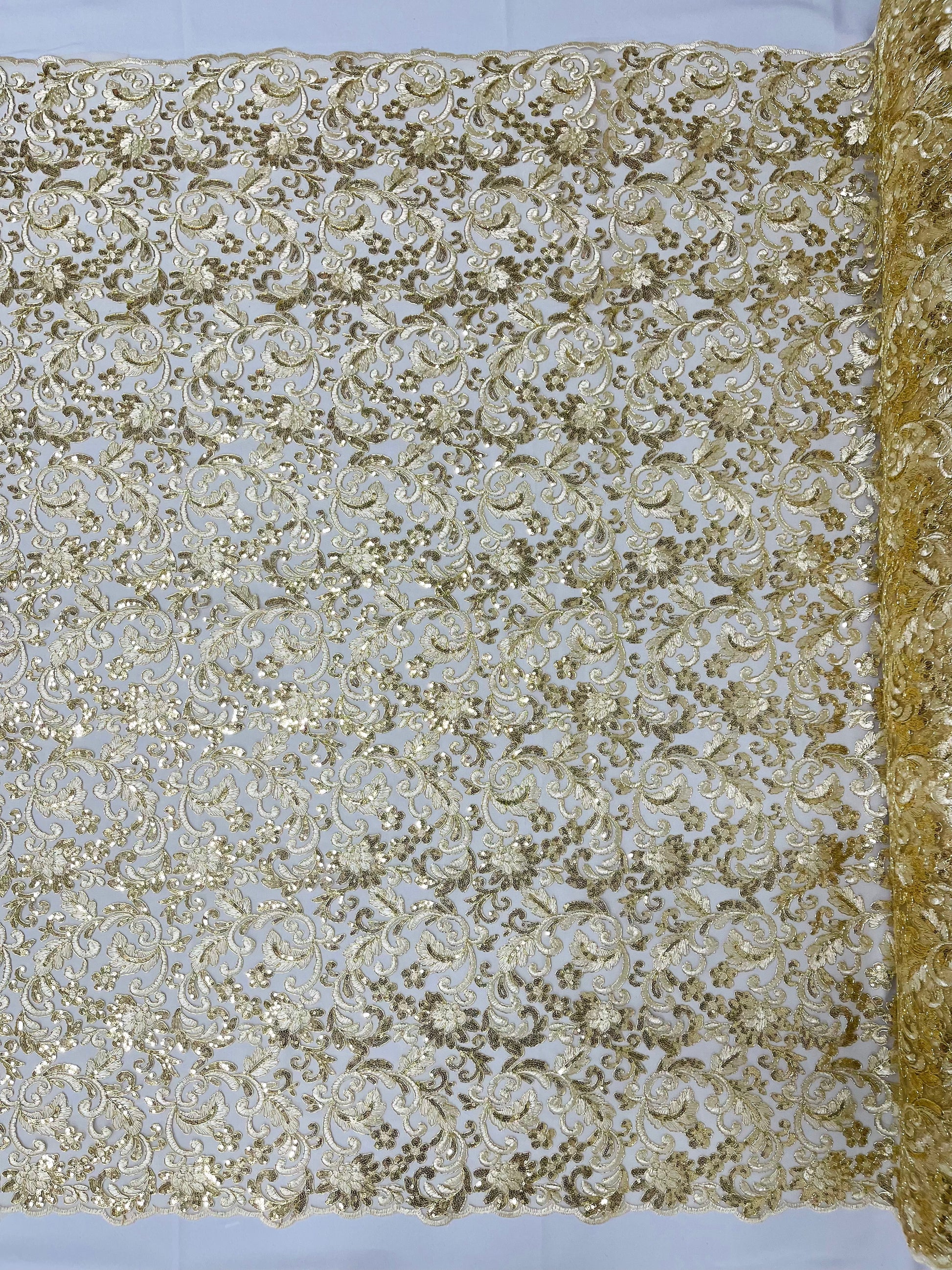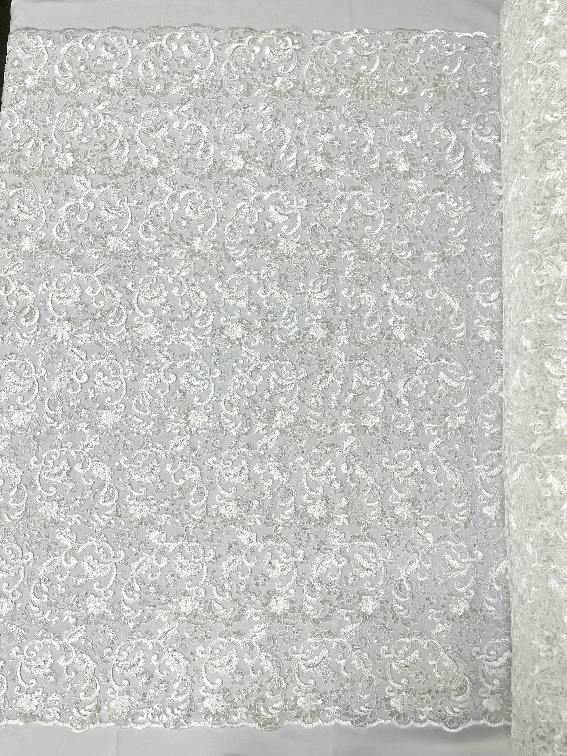 These corded flowers are embroider with sequins on a mesh lace fabric giving off a sophisticated and elegant look . The lace has a double scallops on the width .This lace can be used for dresses, tablecloths, nightgowns, prom gowns, bridal gowns, wedding gowns, runners, Vegas shows, pillows, decoration, and much more.
