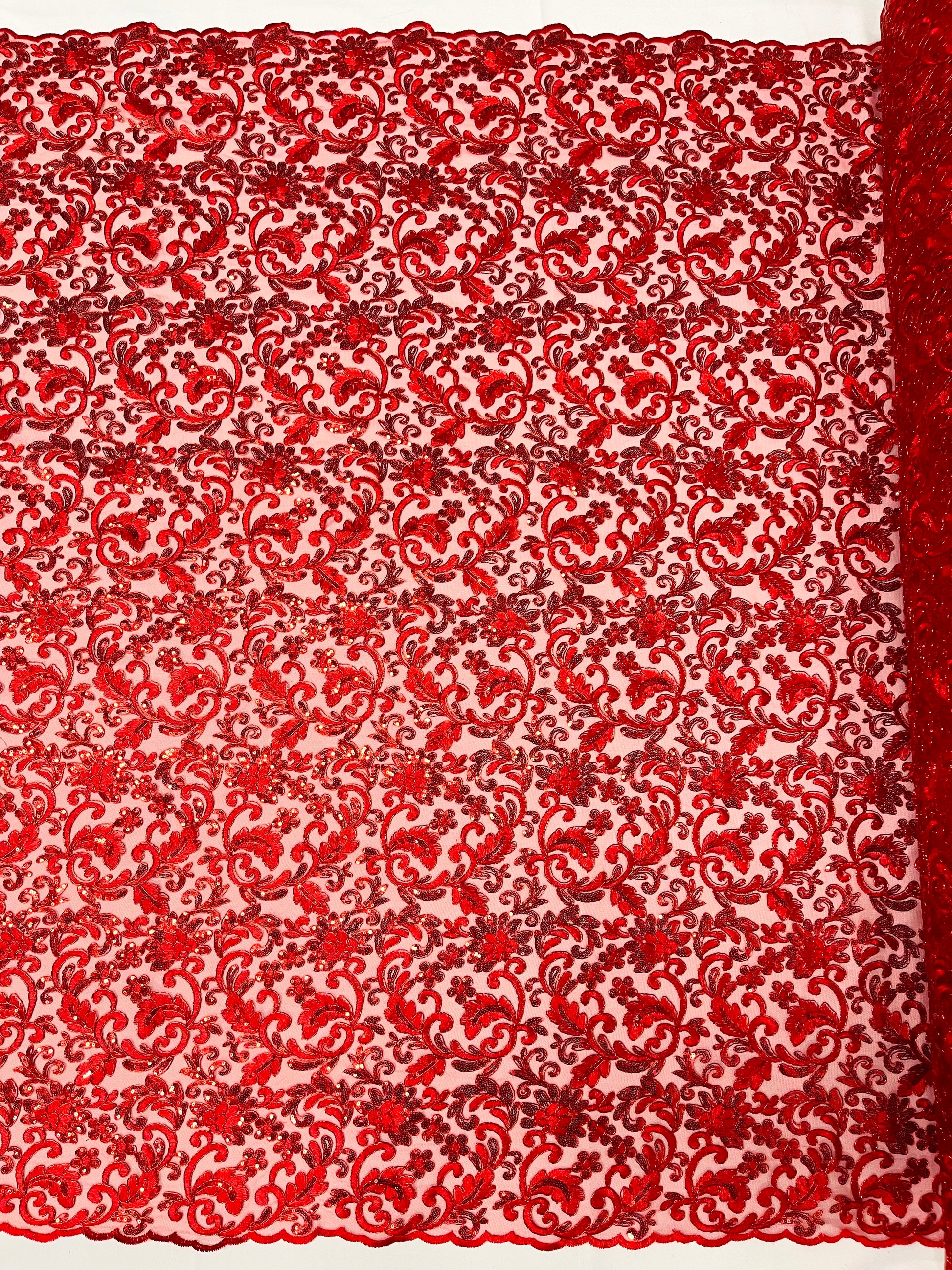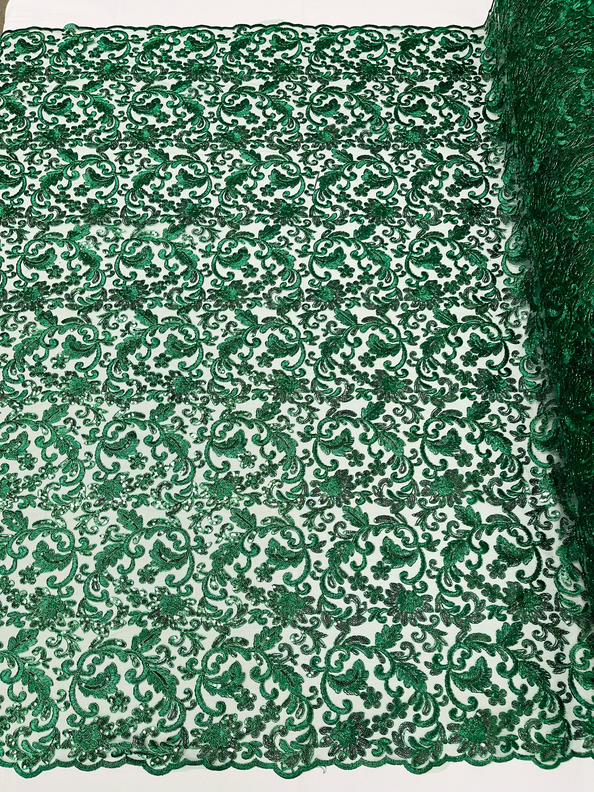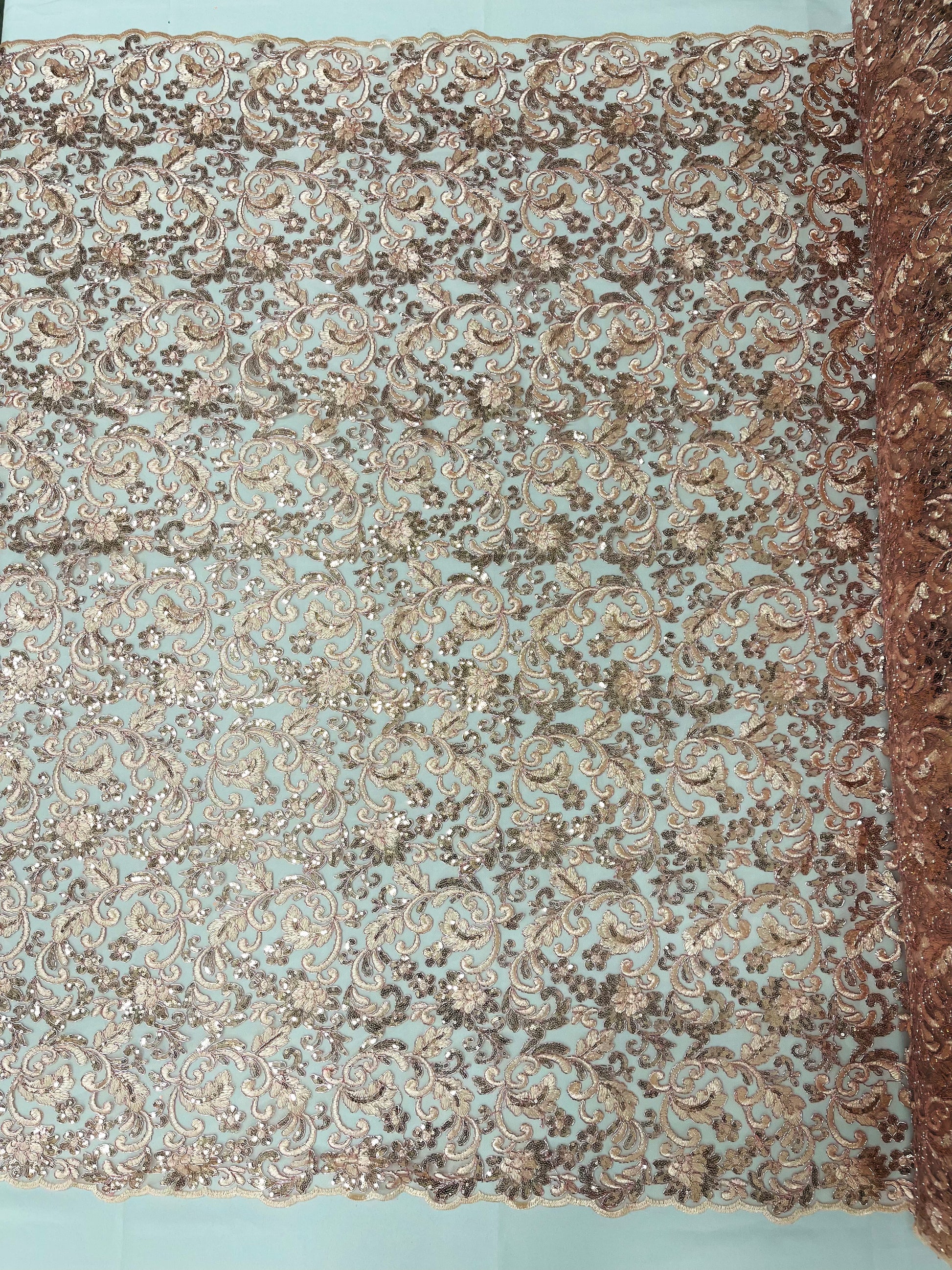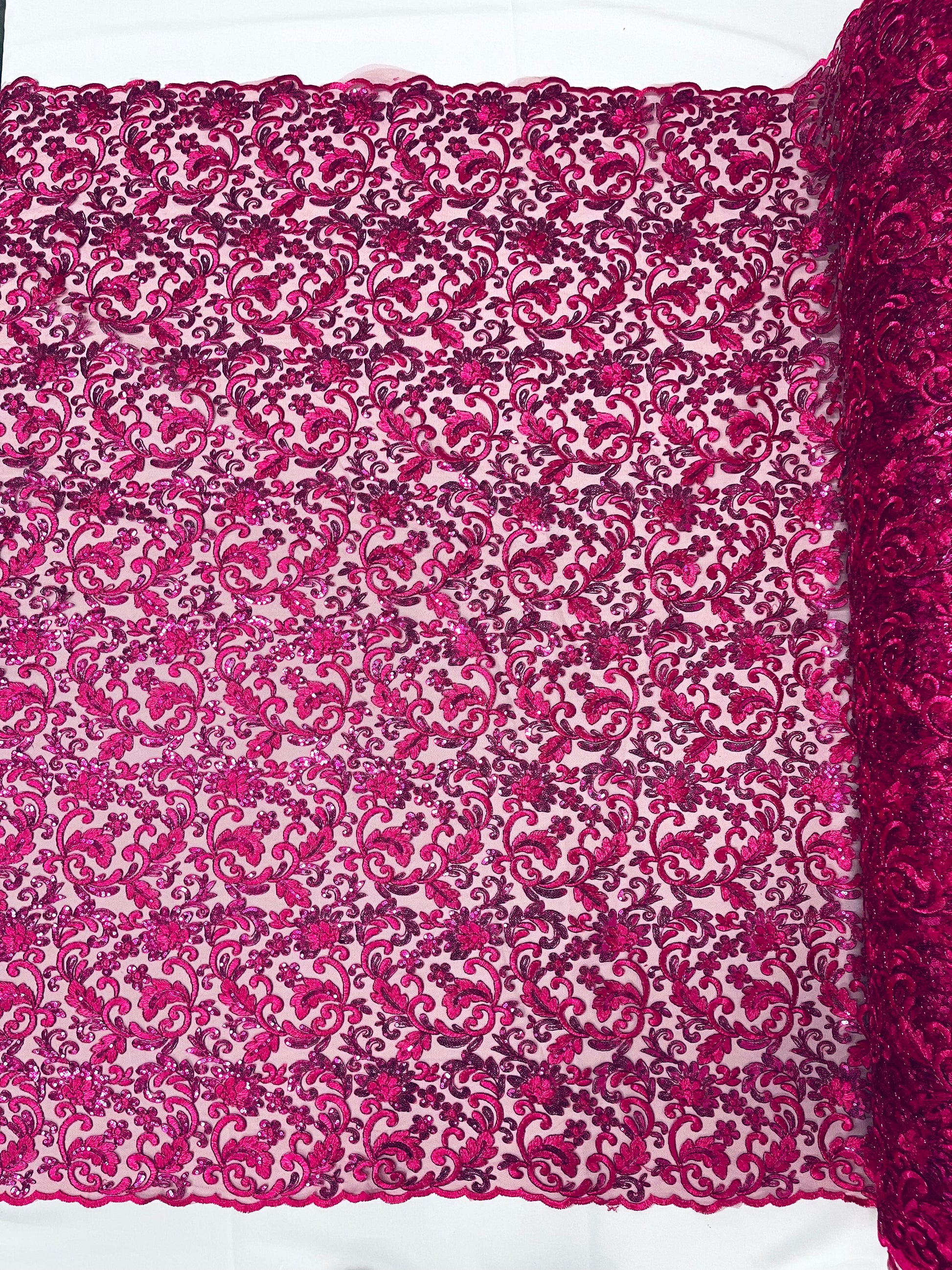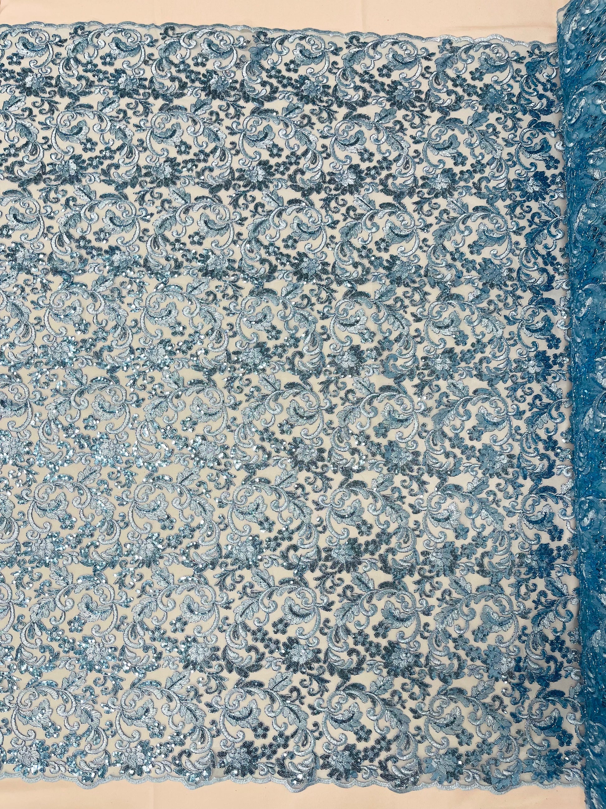 These corded flowers are embroider with sequins on a mesh lace fabric giving off a sophisticated and elegant look . The lace has a double scallops on the width .This lace can be used for dresses, tablecloths, nightgowns, prom gowns, bridal gowns, wedding gowns, runners, Vegas shows, pillows, decoration, and much more.