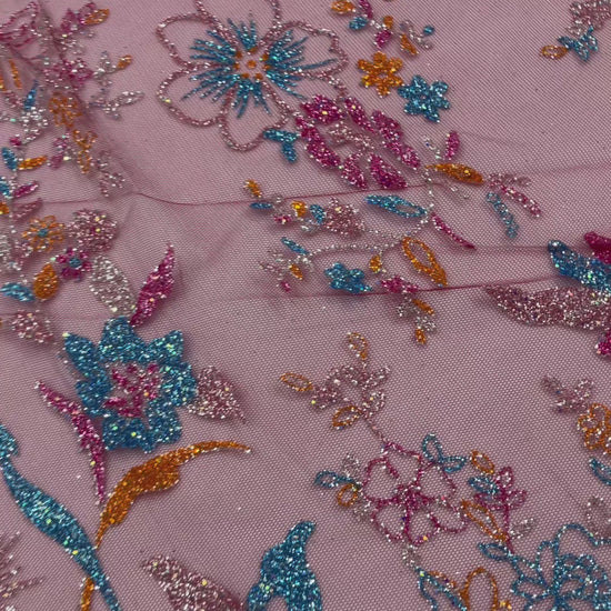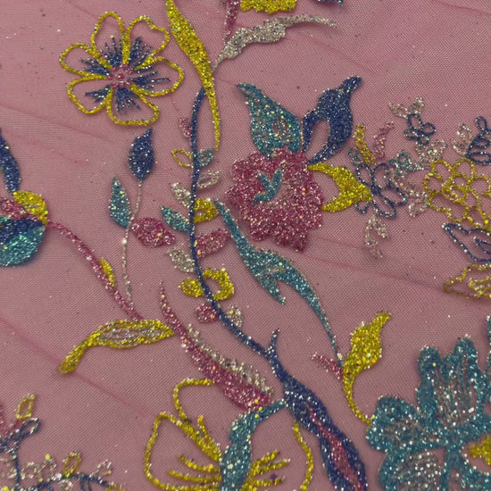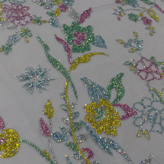 Multi Color Roses Glitter Design On A Mesh Lace Fabric| New Creations Fabric & Foam Inc