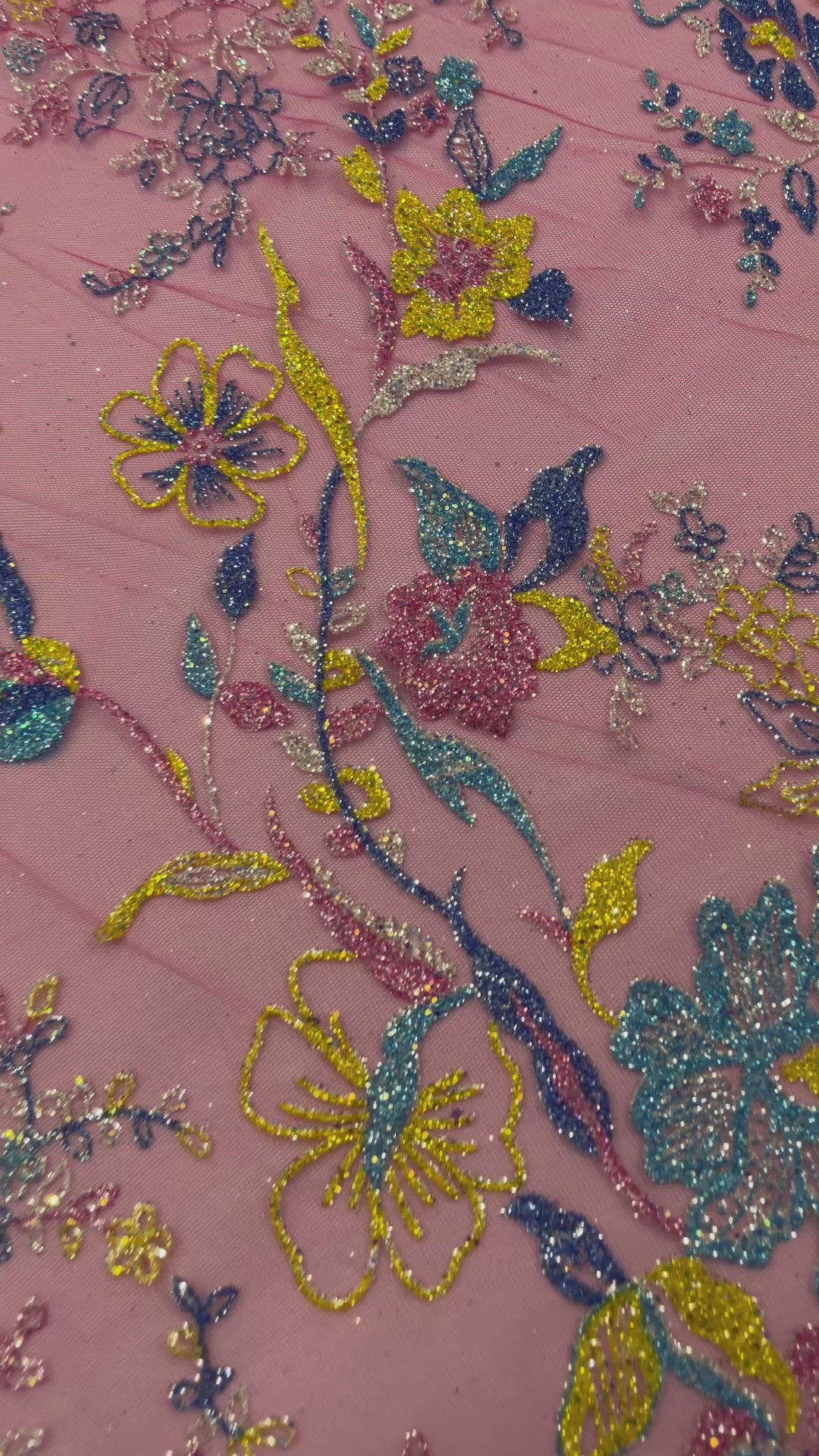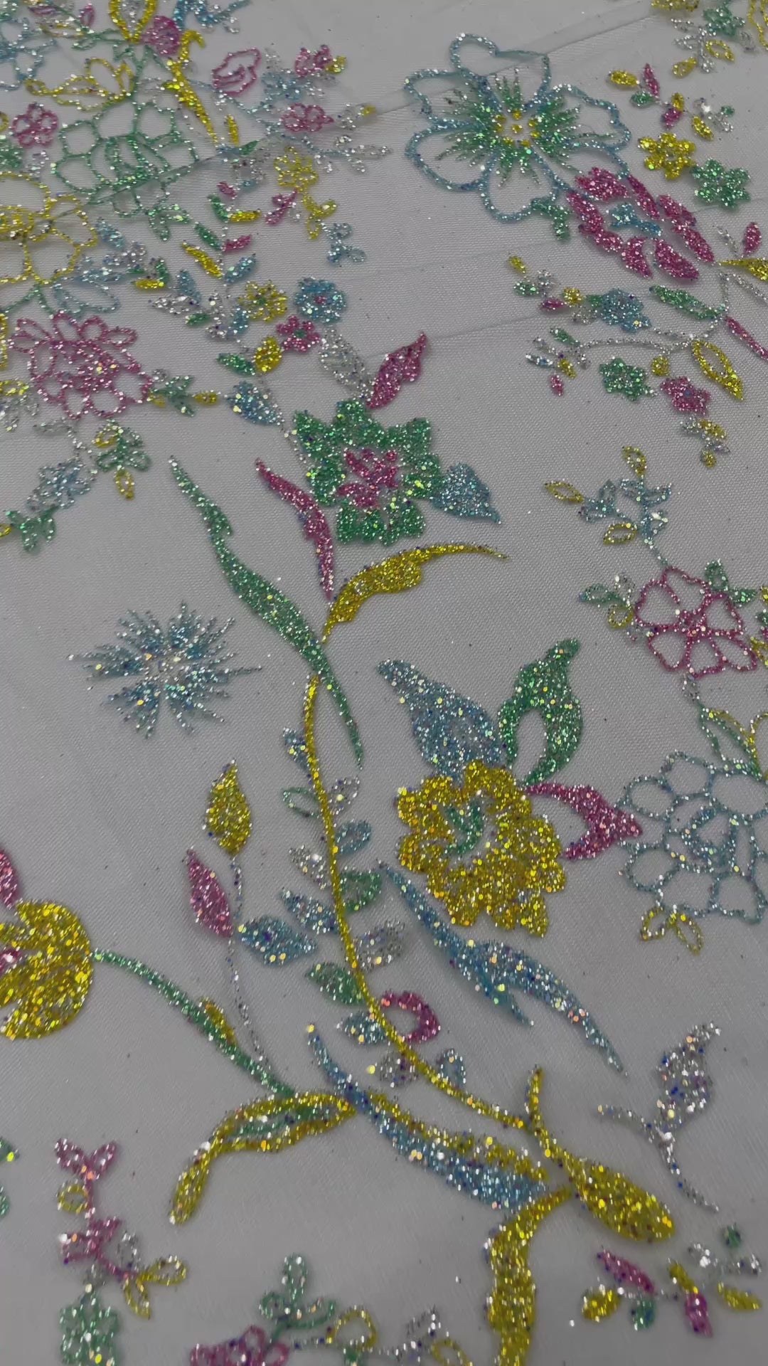 This shiny Multi Color Roses Glitter design is made up of glue on a Mesh with glitter on the design. This lace is modern but yet classy and the glitter gives it's a beautiful look. The lace can be used for dresses, tablecloths, runners, decoration, skirts, jackets, nightgowns, prom dresses, apparel and much more.