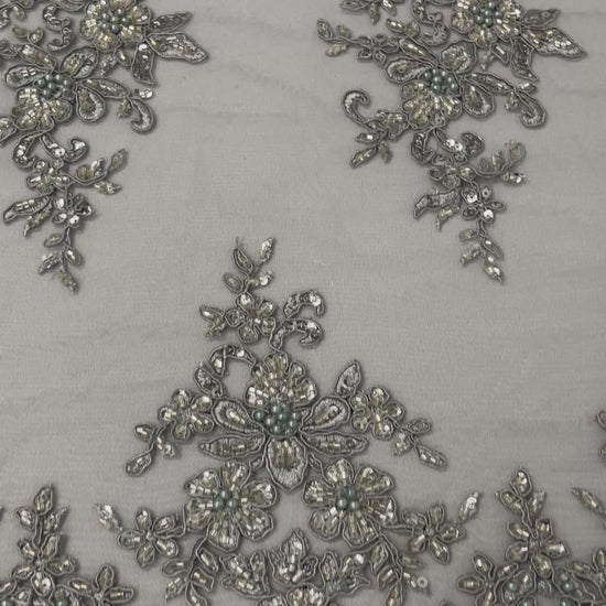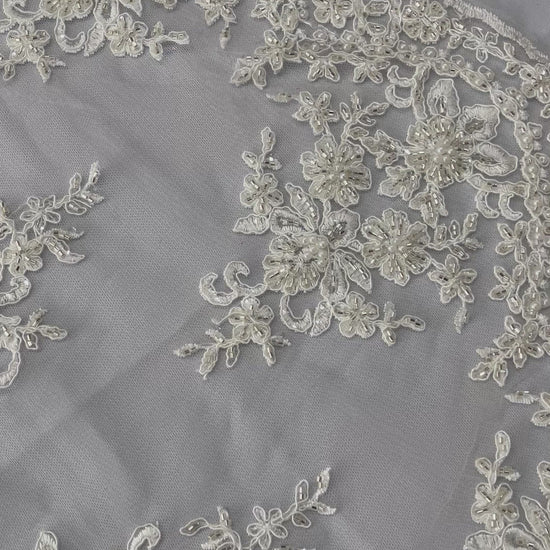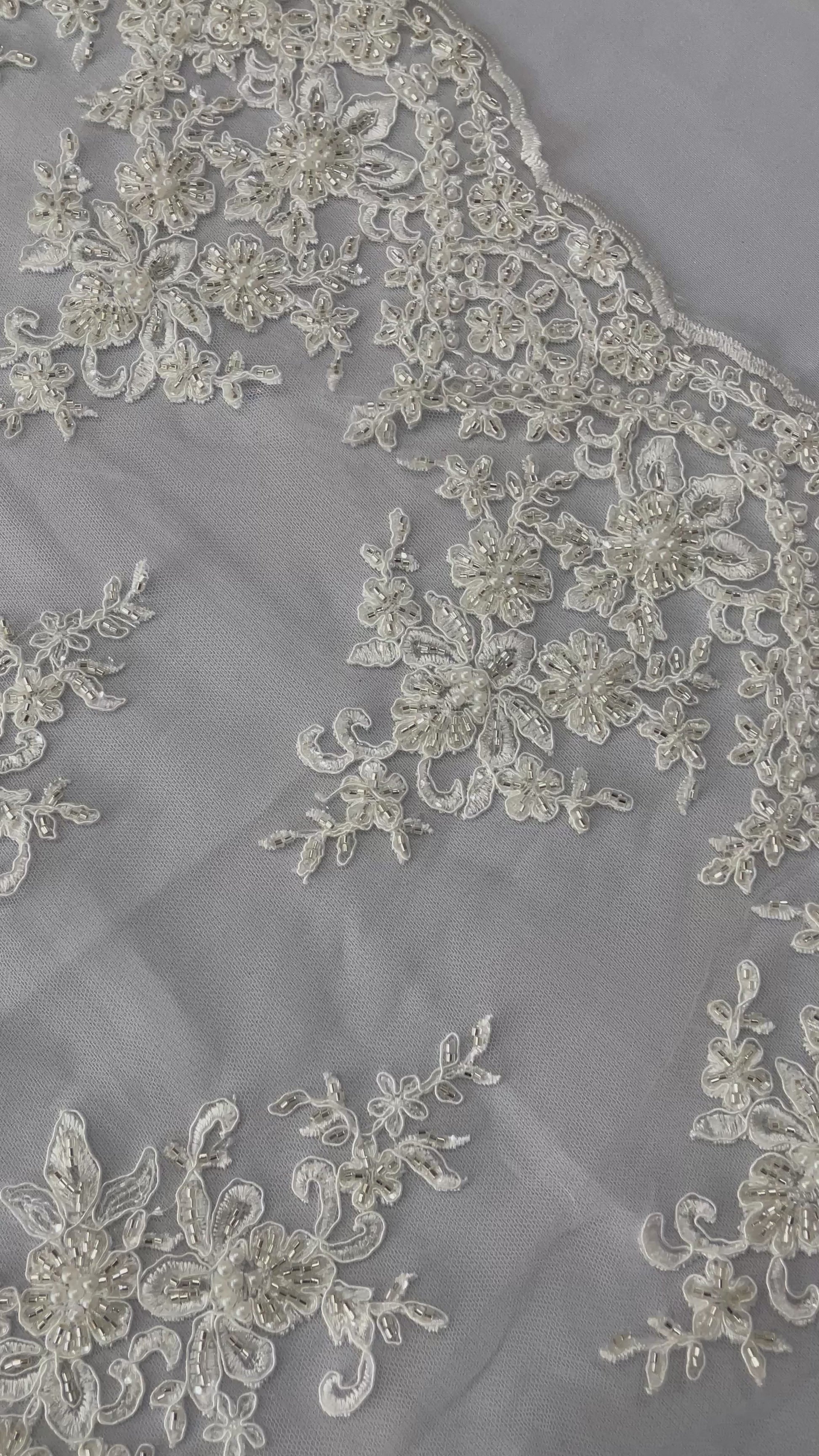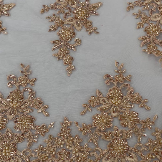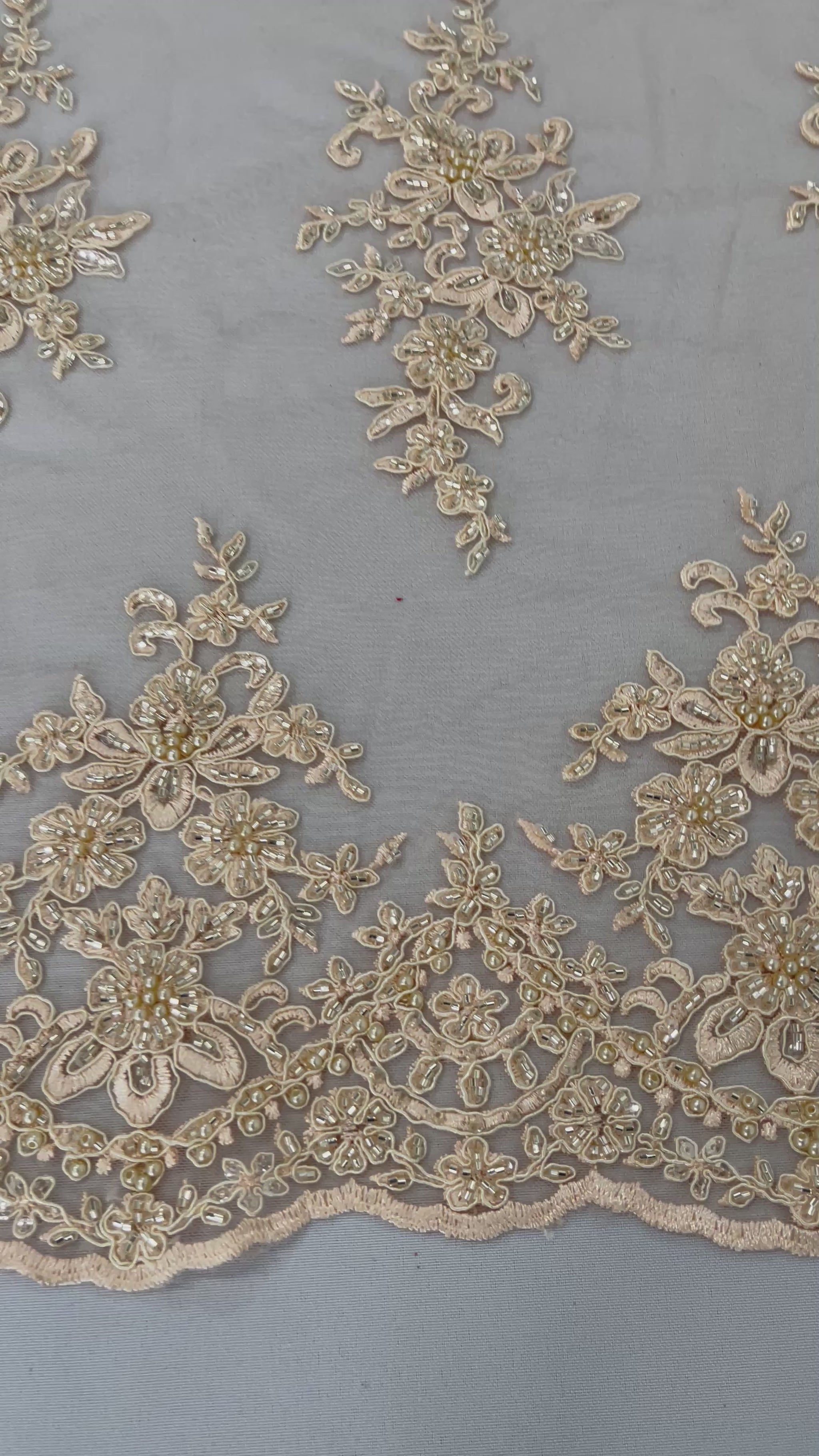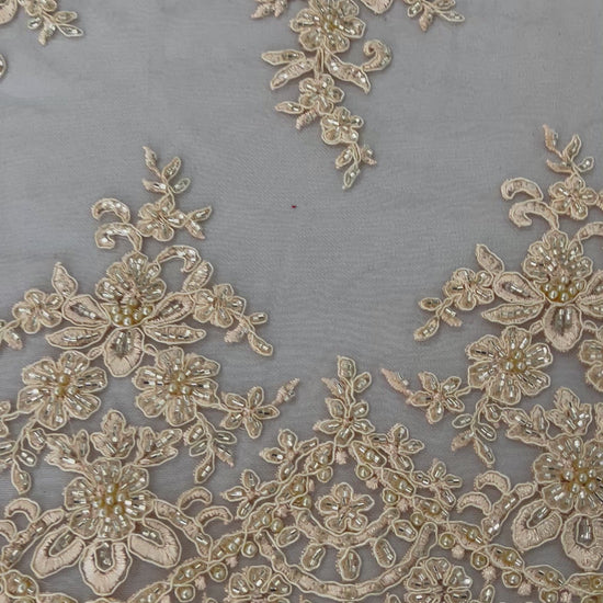 French design embroidered and hand beading on a mesh lace. This lace is hand beaded with sequins and glass beads. The lace has a Metallic tread that gives it that especial shine. The lace can be use for dresses, tablecloths, night gowns, Skirts, prom dresses, wedding dresses, runners for tables, decoration and much more.