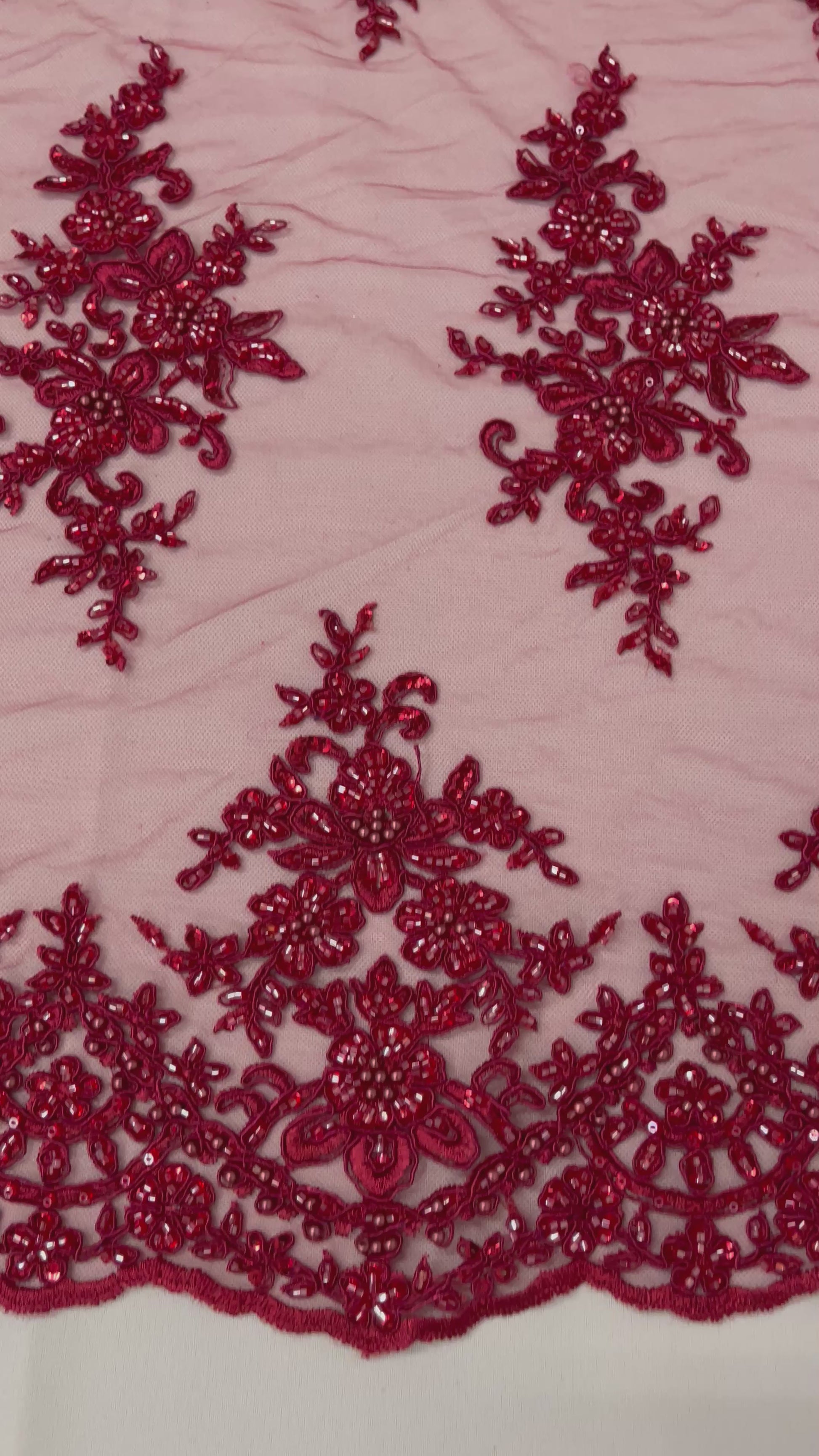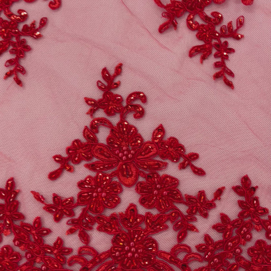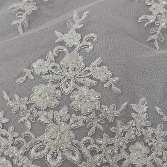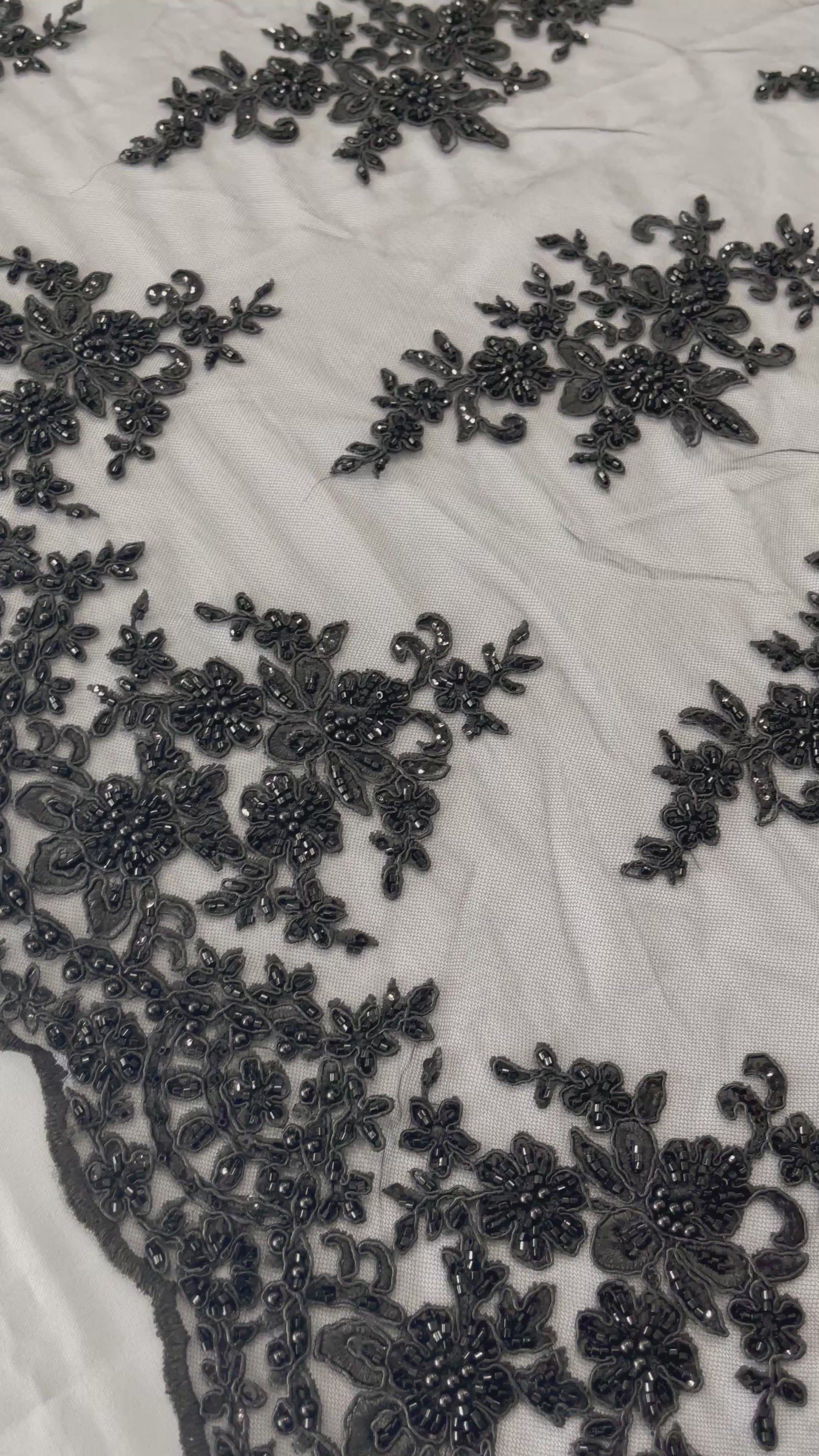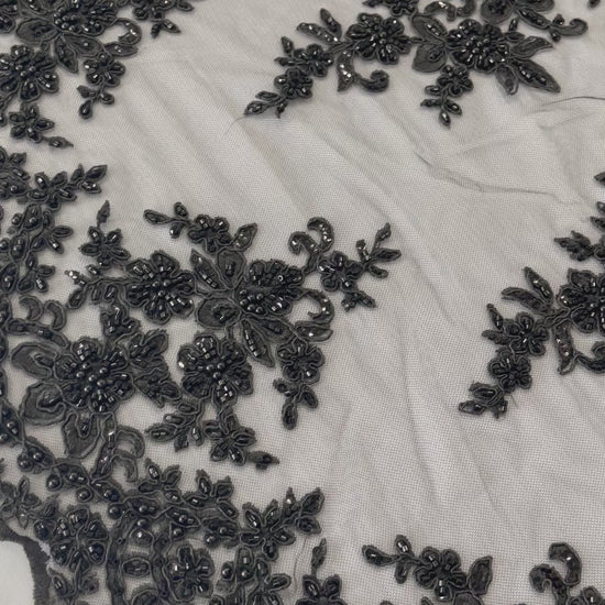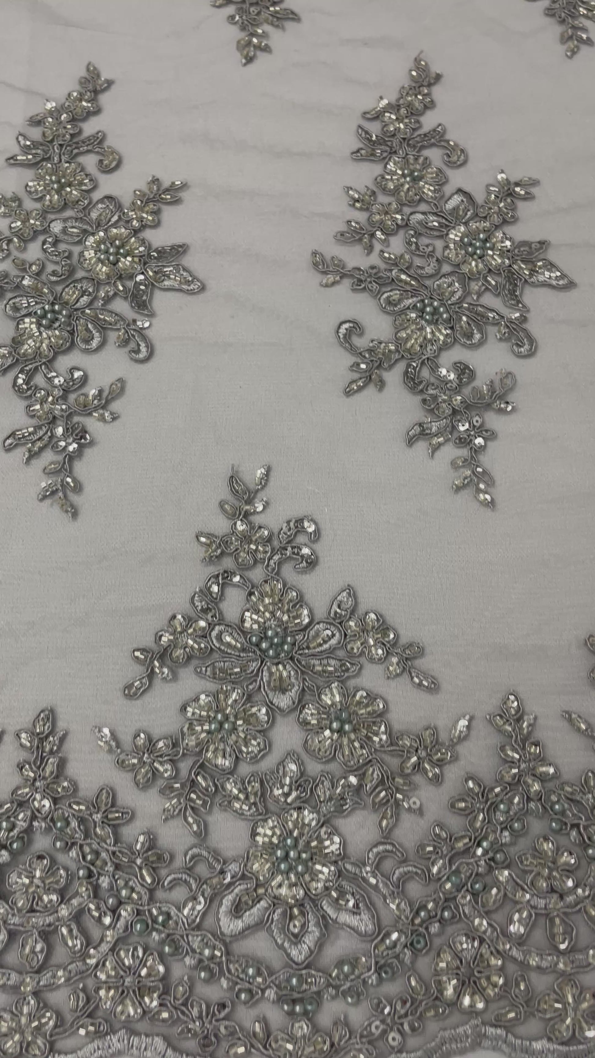French design embroidered and hand beading on a mesh lace. This lace is hand beaded with sequins and glass beads. The lace has a Metallic tread that gives it that especial shine. The lace can be use for dresses, tablecloths, night gowns, Skirts, prom dresses, wedding dresses, runners for tables, decoration and much more.
