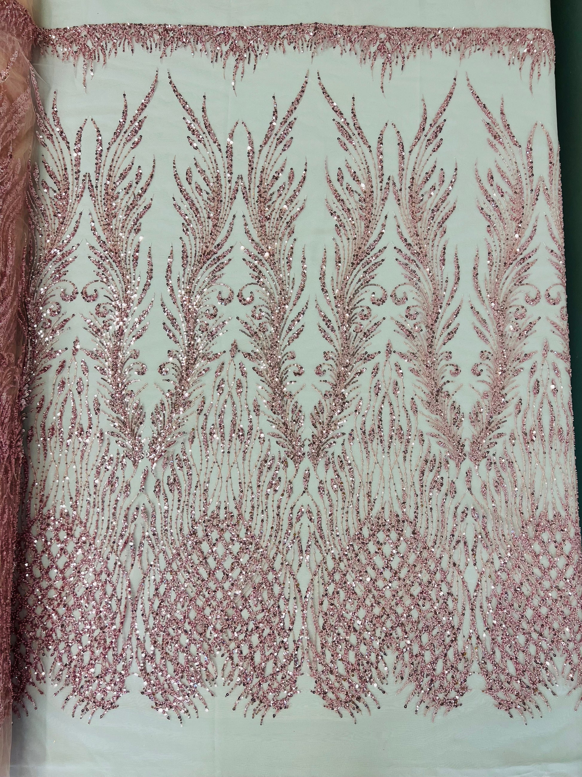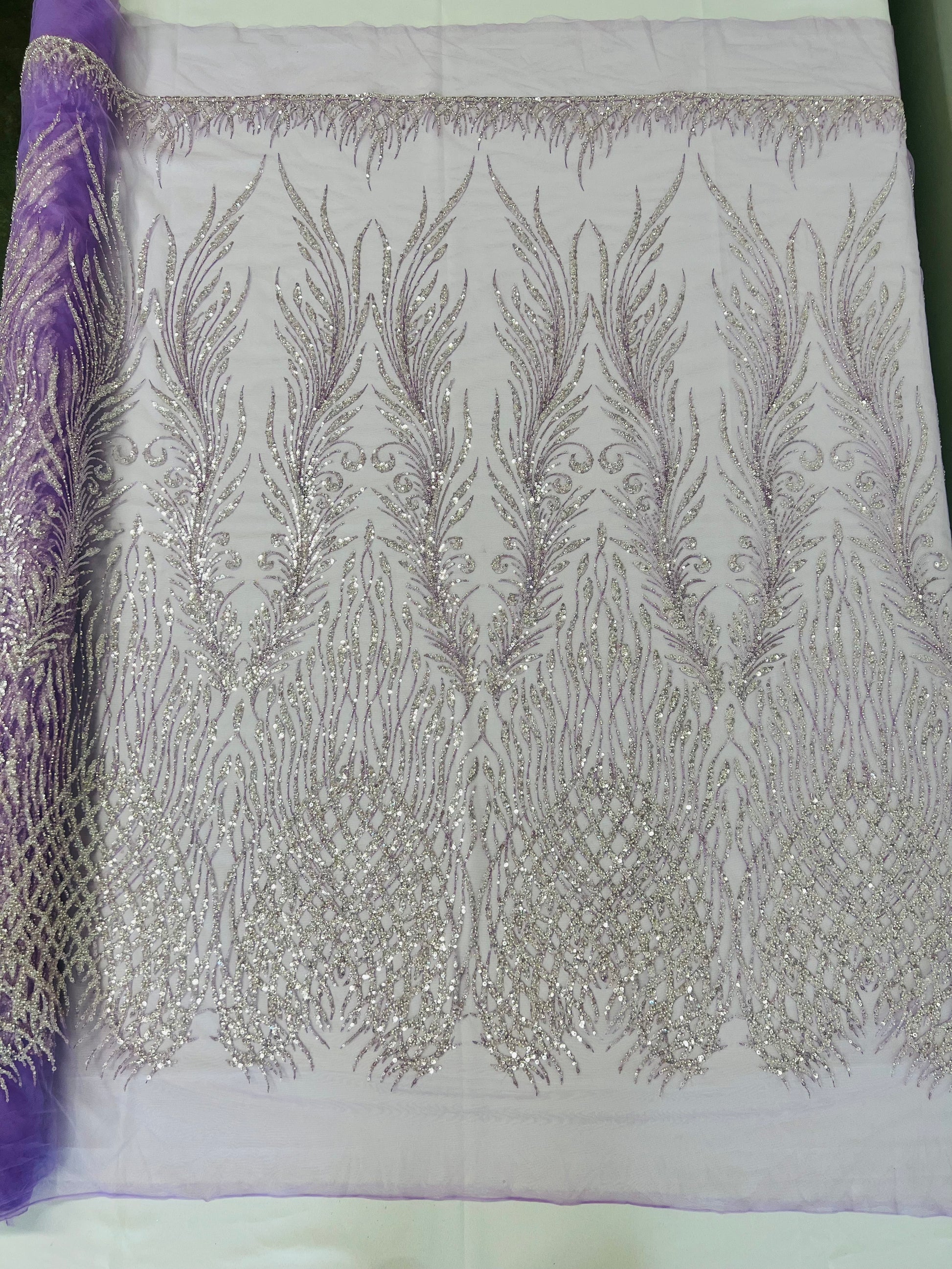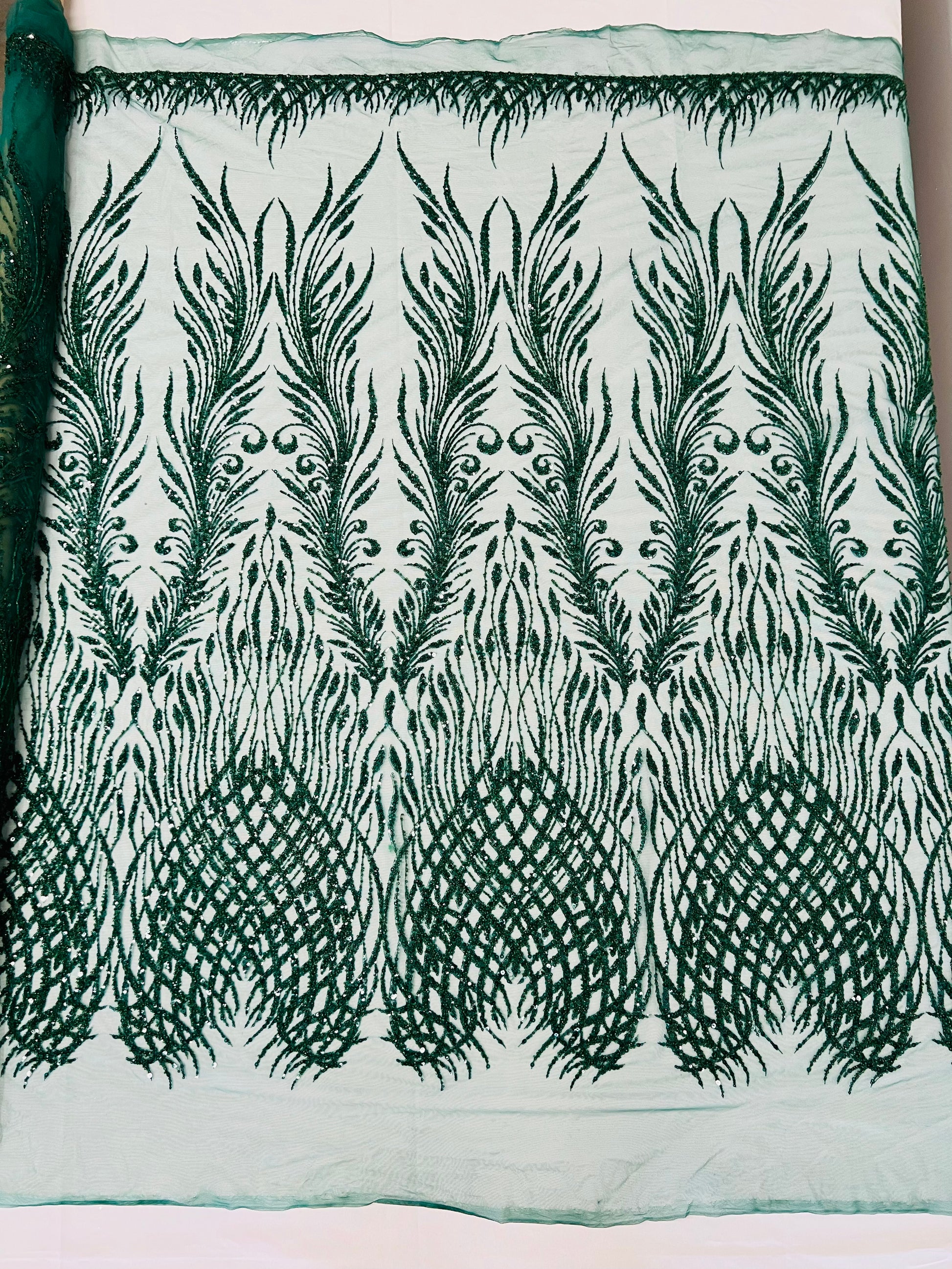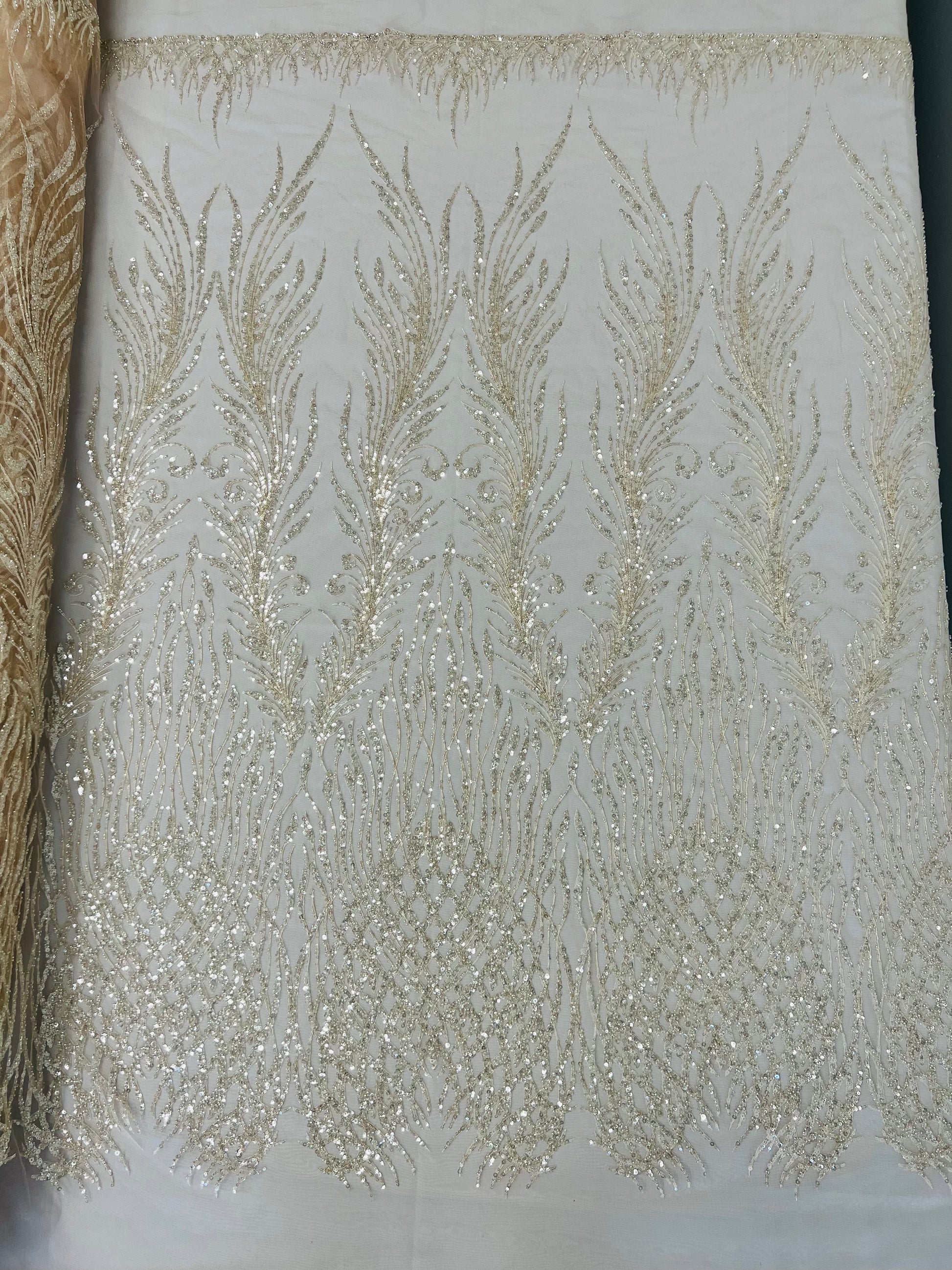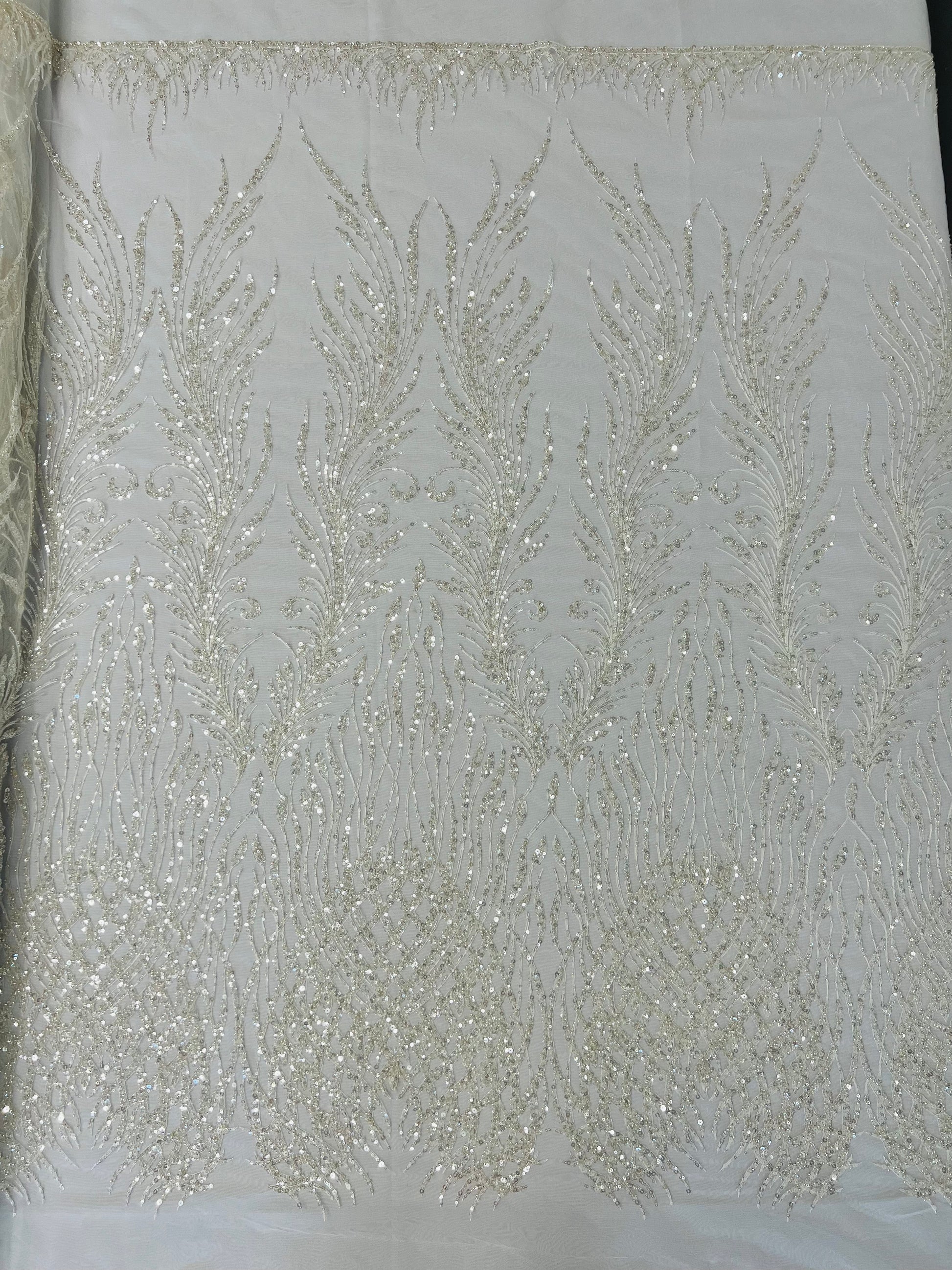 This feather is embroidered and beaded on a mesh lace fabric giving off a sophisticated and elegant look. The lace is heavy beaded with glass beads and sequins on a mesh fabric- The mesh fabric has a slight 2 stretch on the width of the fabric- The lace has a double scallop on the width. It is very classy, and it can be used for dresses, tablecloths, nightgowns, prom gowns, bridal gowns, wedding gowns, runners, Vegas shows, pillows, decoration, and much more.