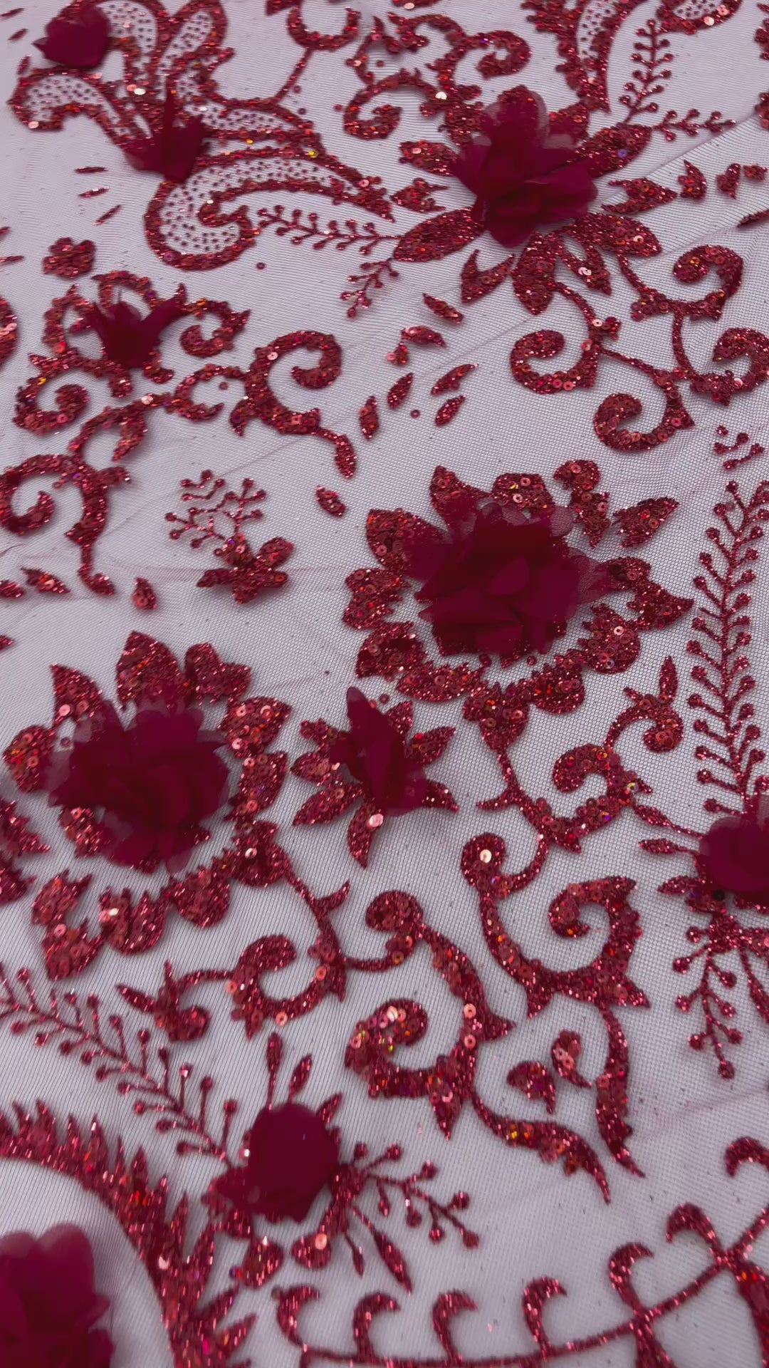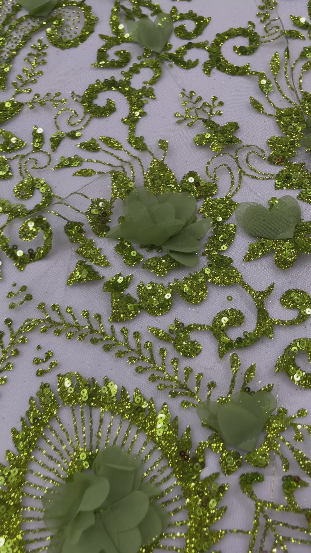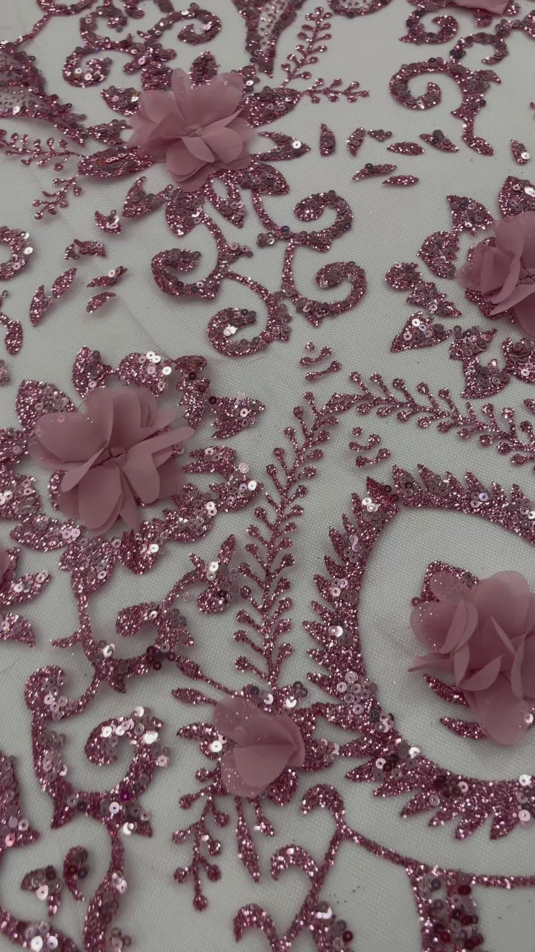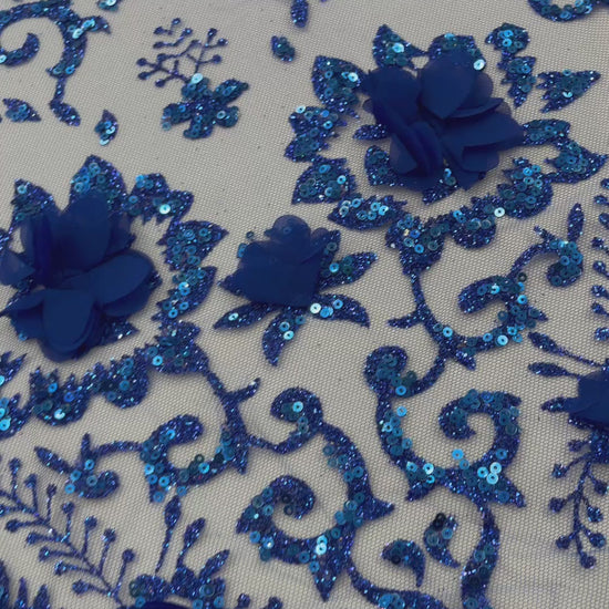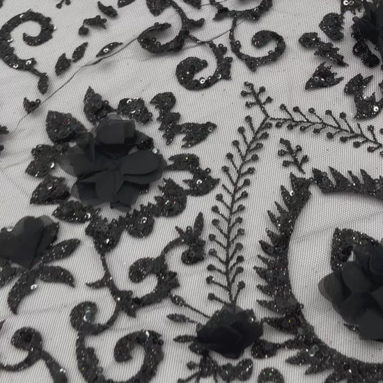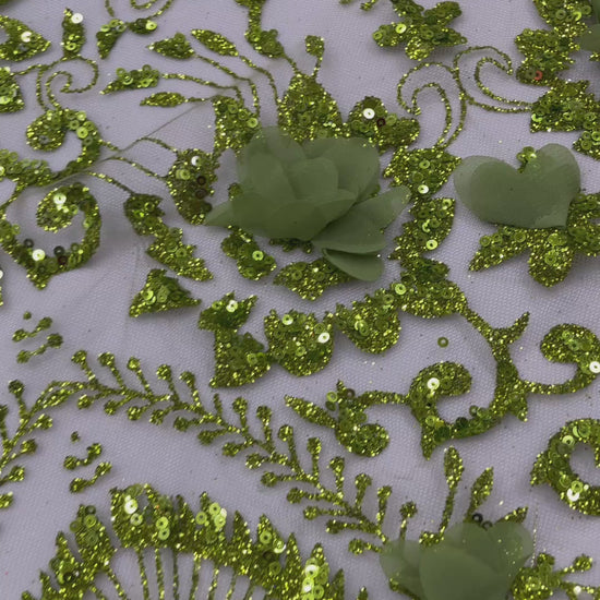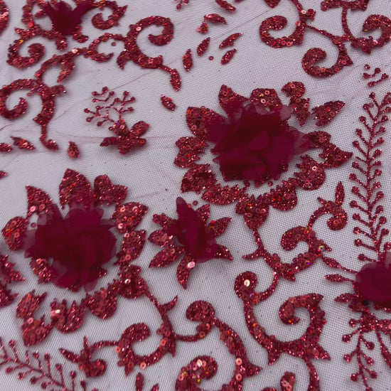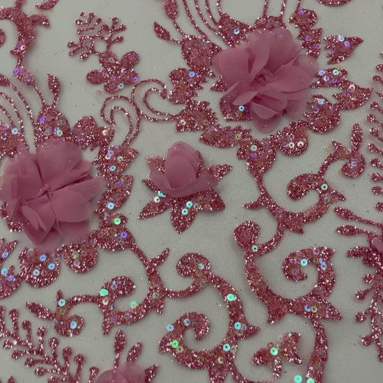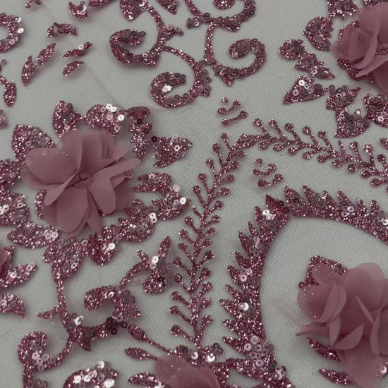 Floral 3D Palm Damask design embroider with glitter and 3d flowers on a mesh lace.. This 3d lace has a glitter on the design that gives a beautiful shine. This lace is a great item for show people and dance dresses, great for Vegas shows.