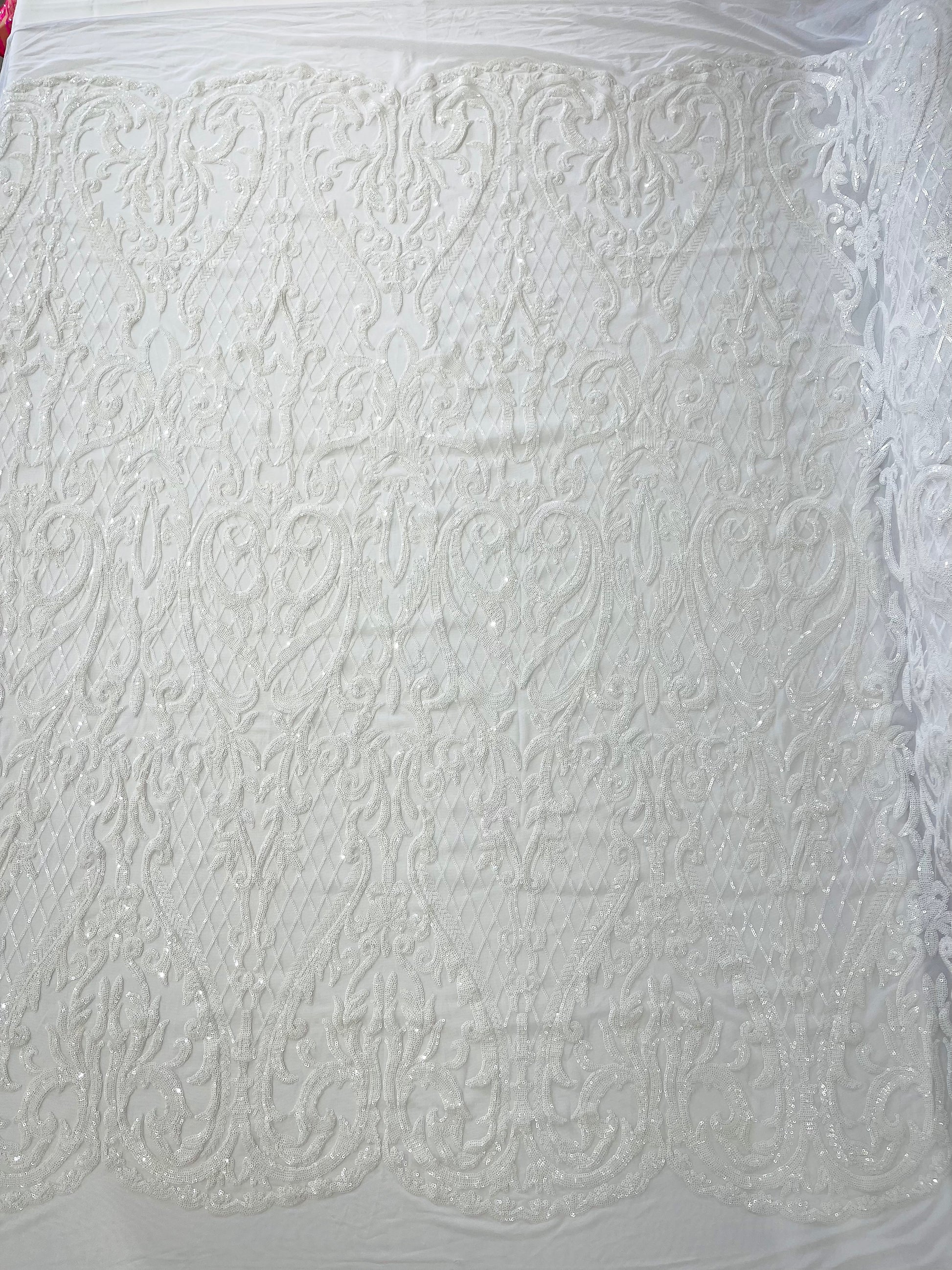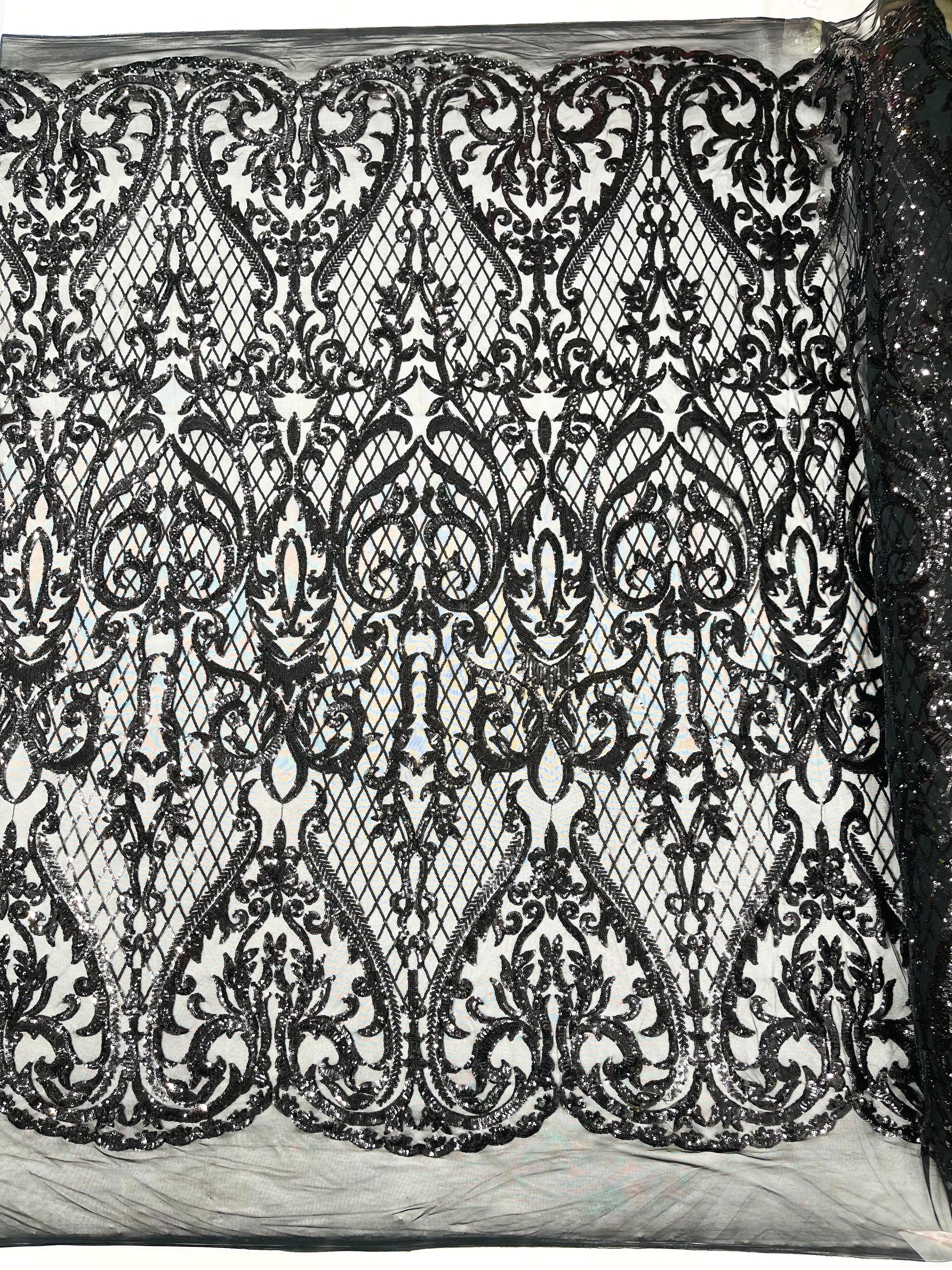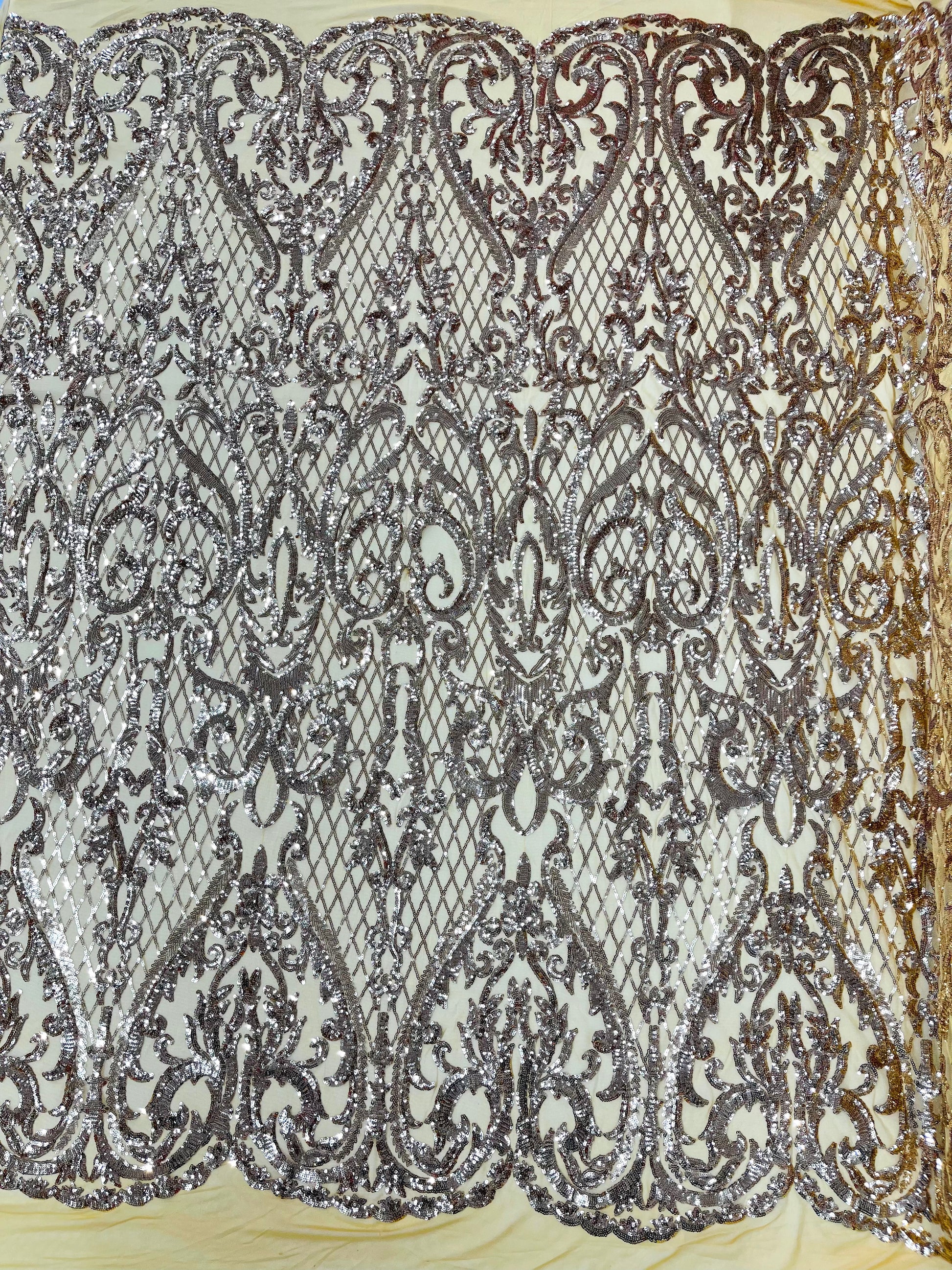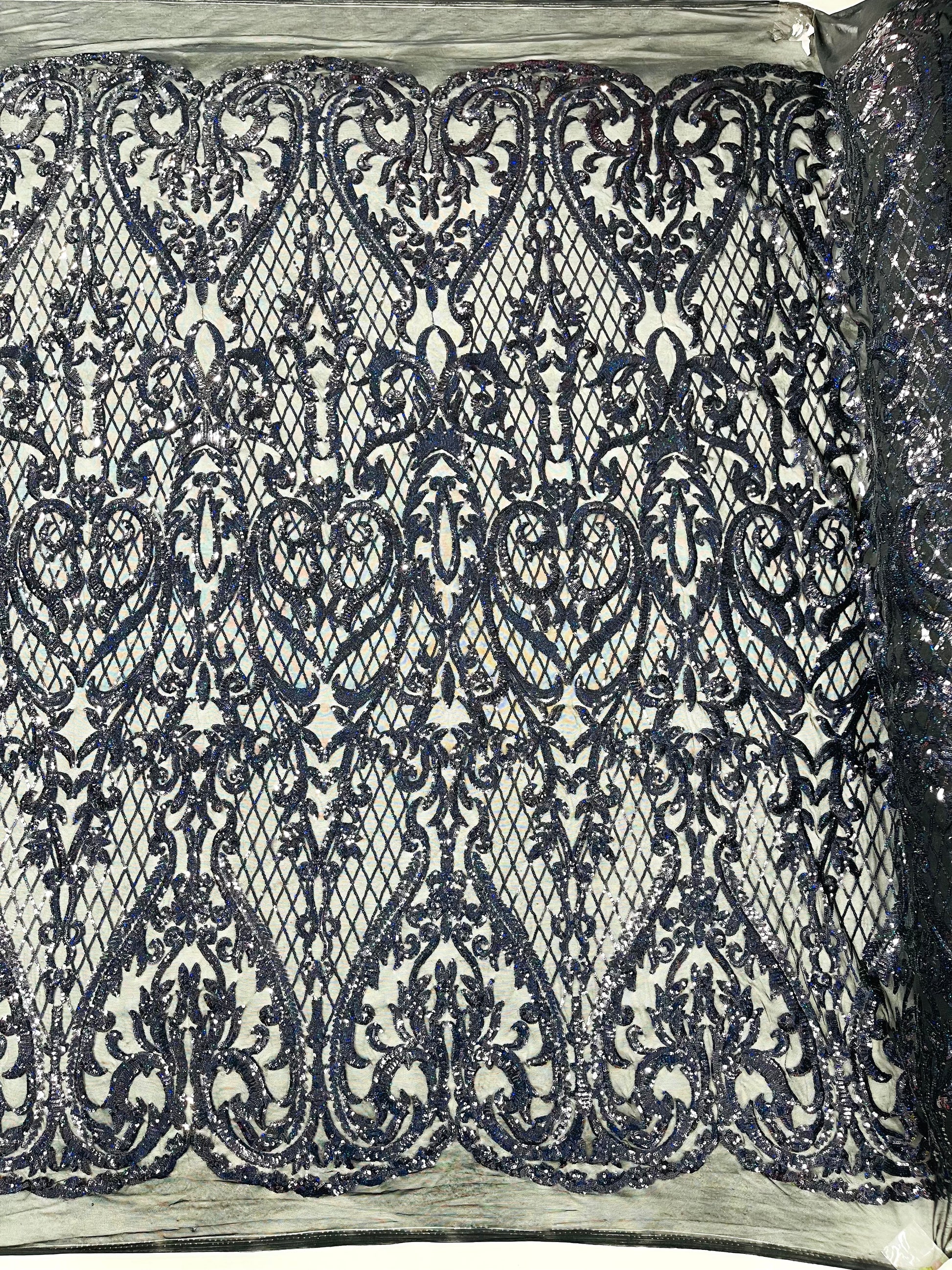 This Heart Damask design is embroidered with iridescent Sequins on a 4 Way Stretch mesh fabric. The iridescent Sequins has especial and extraordinary design on the Mesh . It is super elegant and classy, The Heart Damask design embroider with iridescent Sequins on a mesh can be use for dresses, tablecloths, night gowns, Skirts, prom dresses, wedding dresses, runners for tables, decoration and much more.
