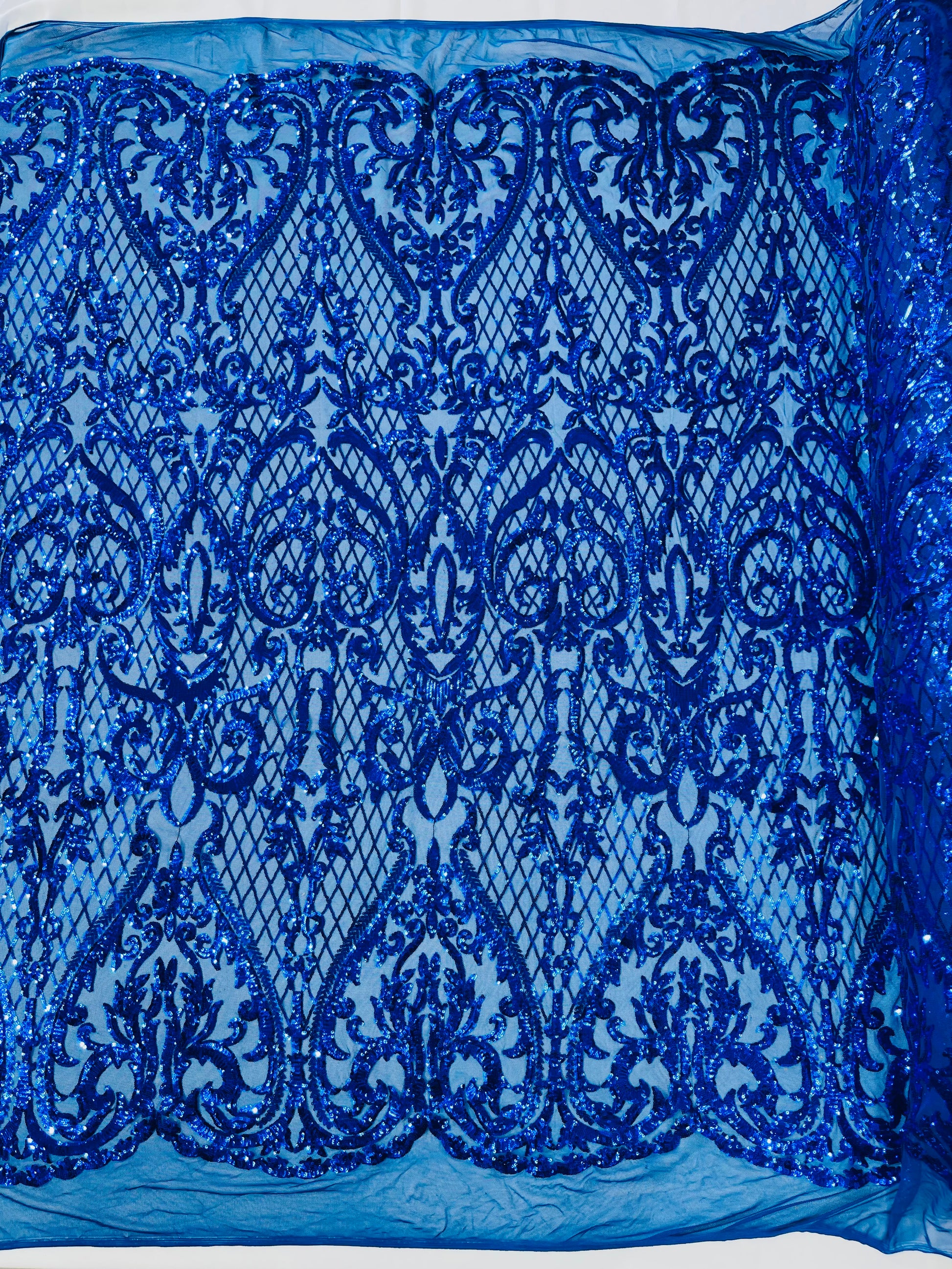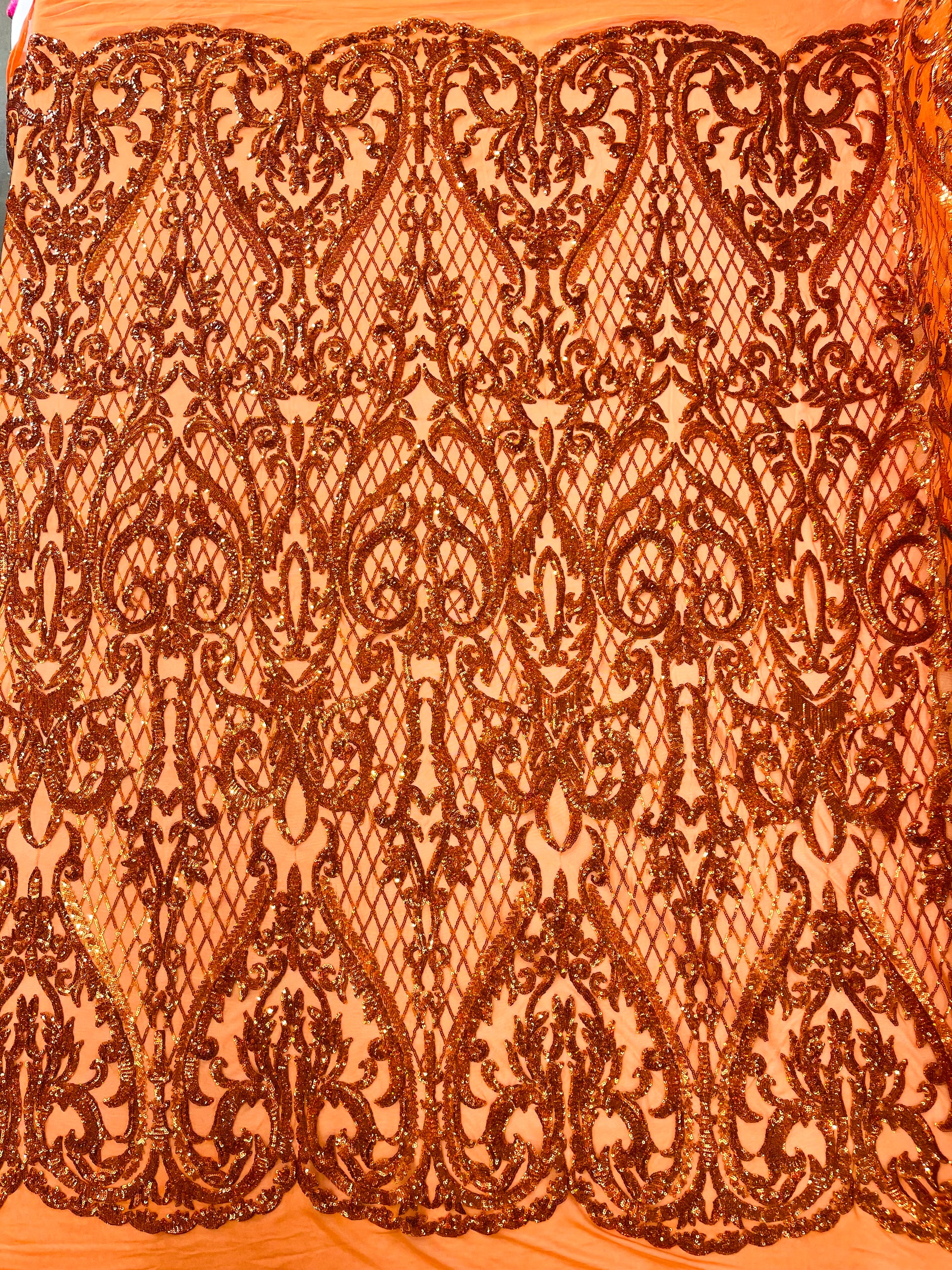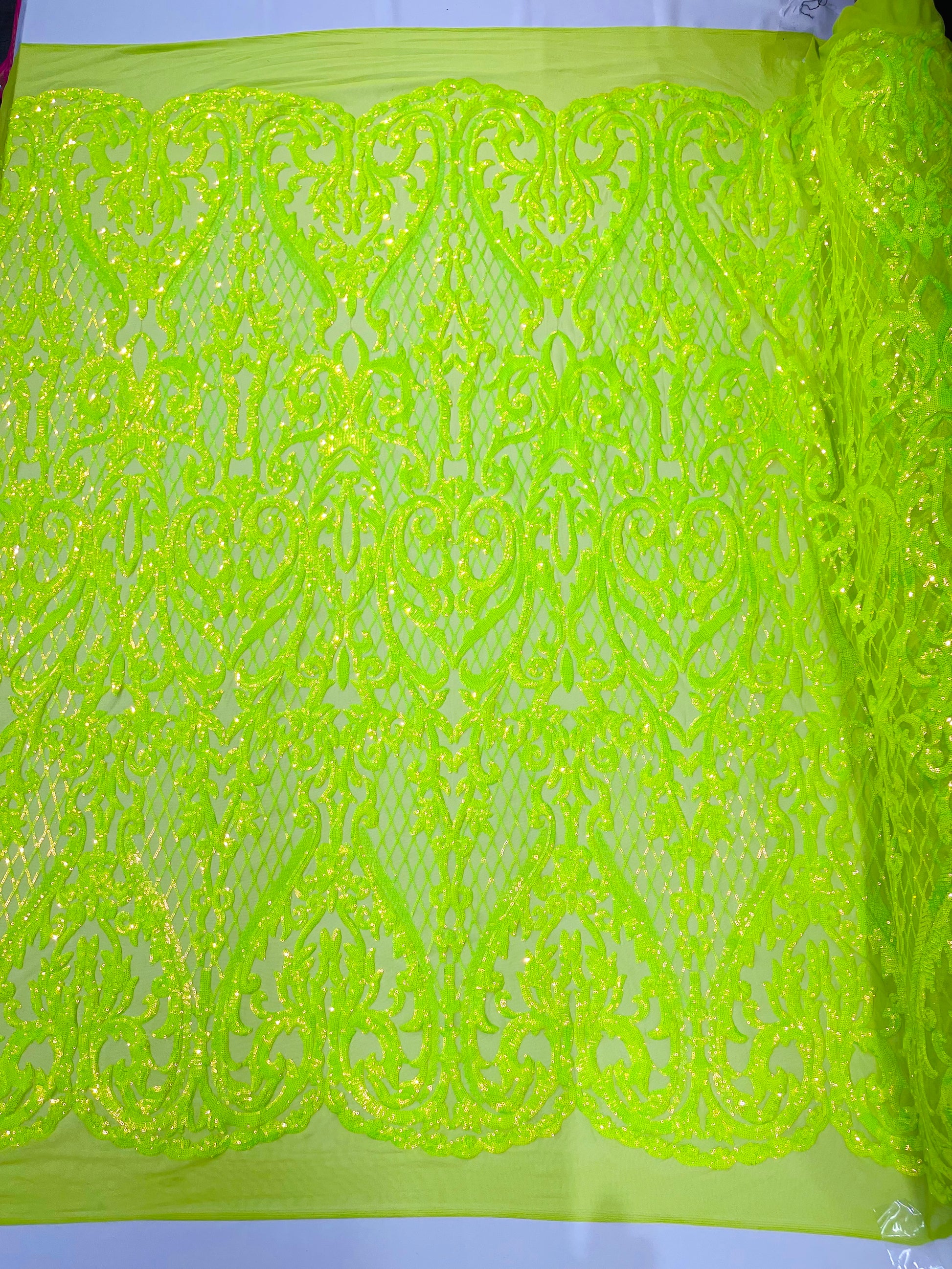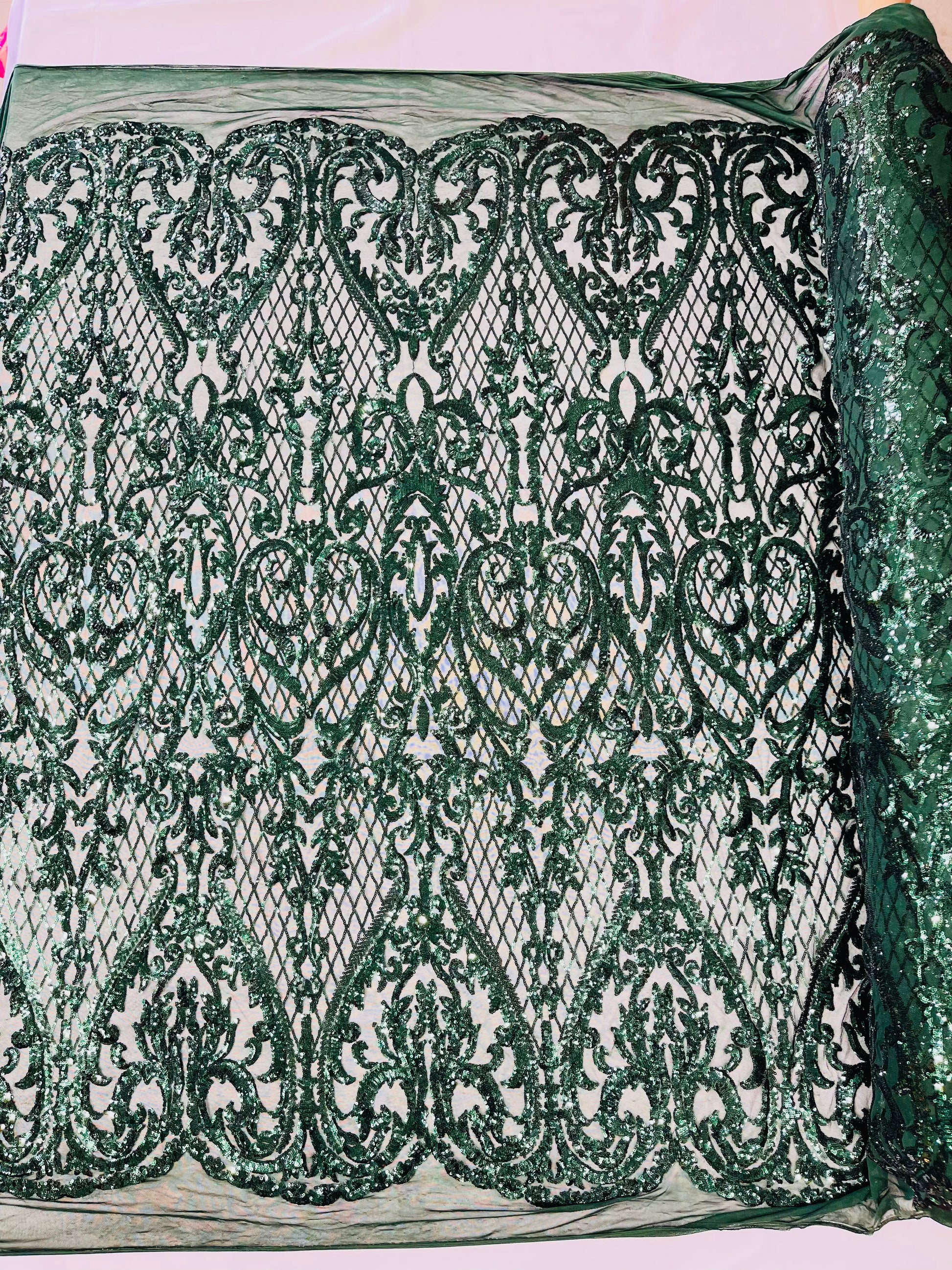 This Heart Damask design is embroidered with iridescent Sequins on a 4 Way Stretch mesh fabric. The iridescent Sequins has especial and extraordinary design on the Mesh . It is super elegant and classy, The Heart Damask design embroider with iridescent Sequins on a mesh can be use for dresses, tablecloths, night gowns, Skirts, prom dresses, wedding dresses, runners for tables, decoration and much more.
