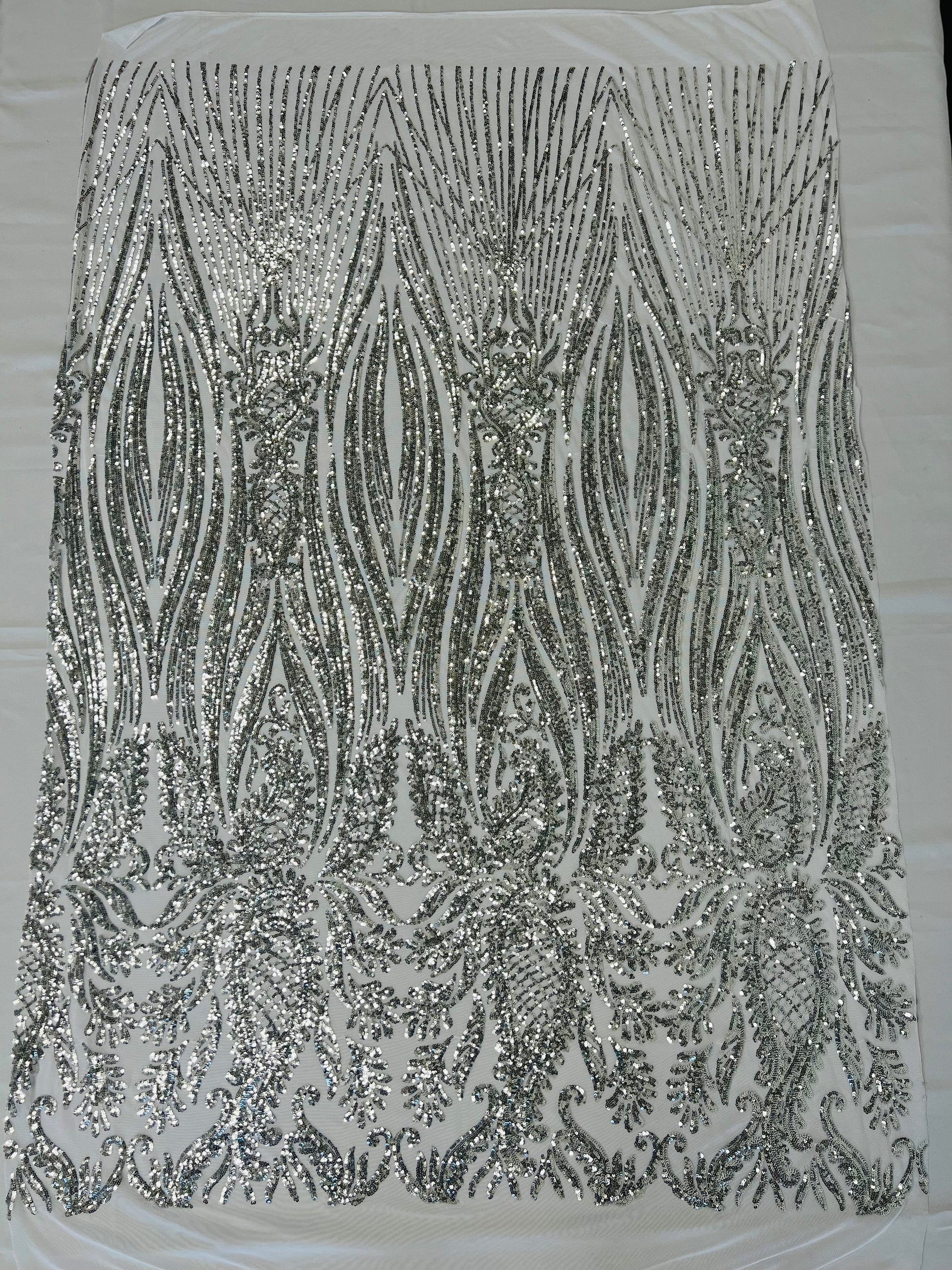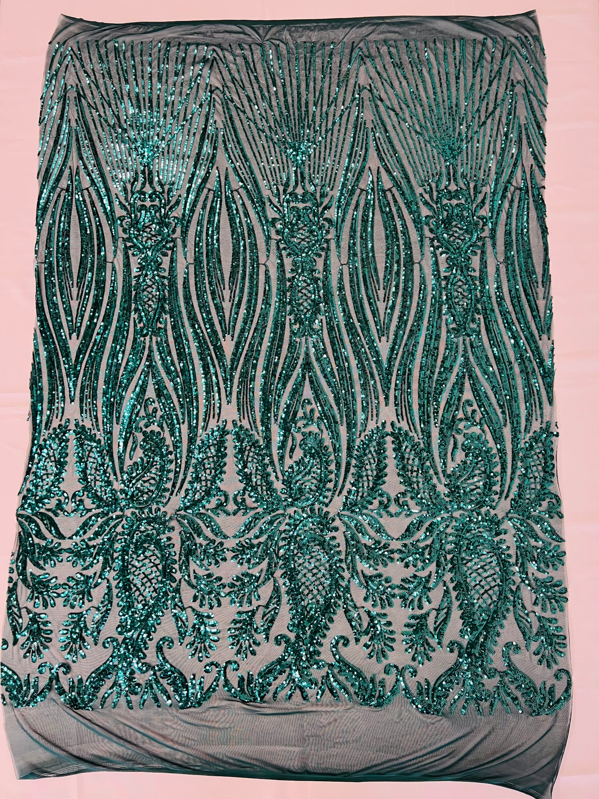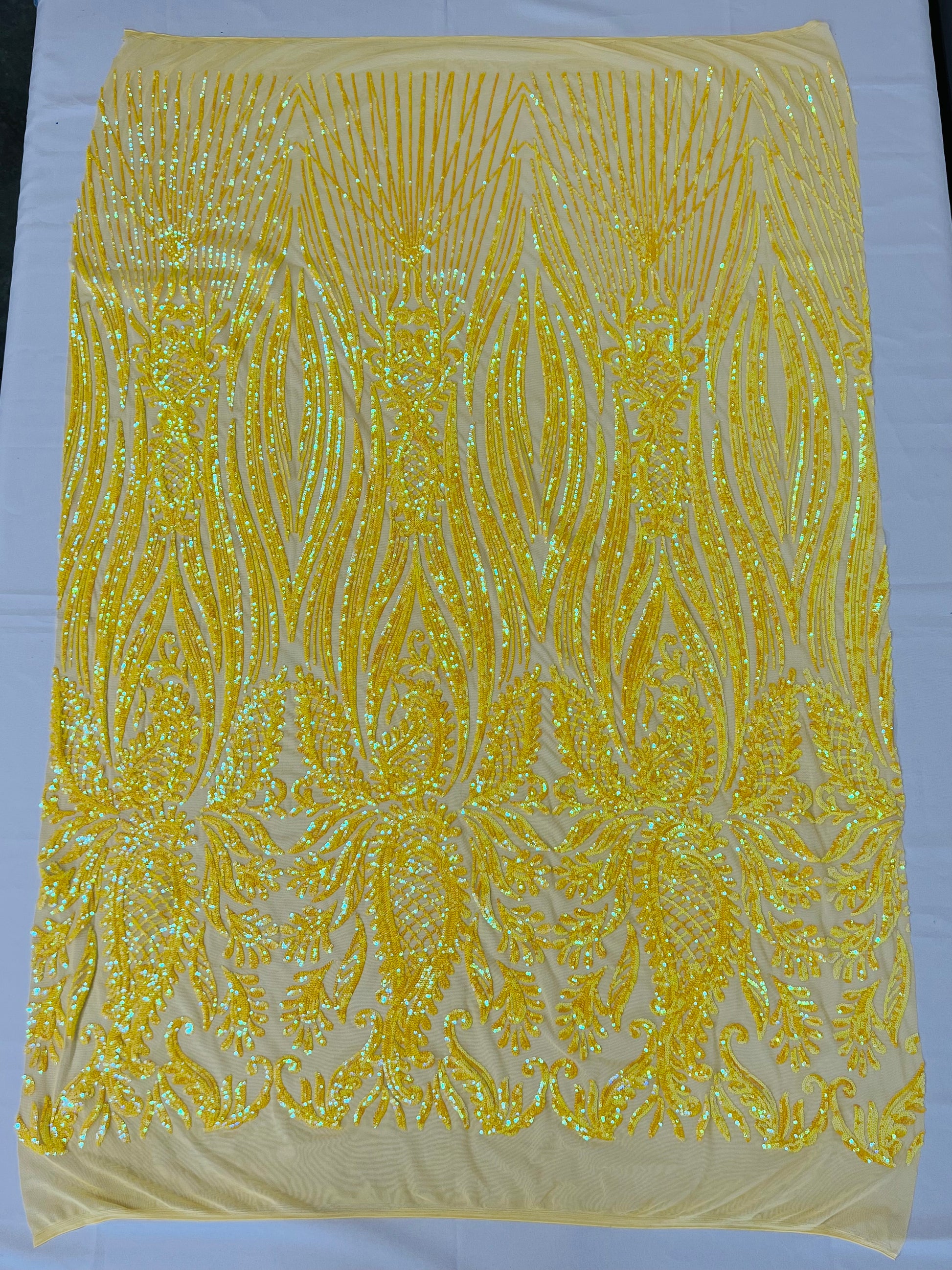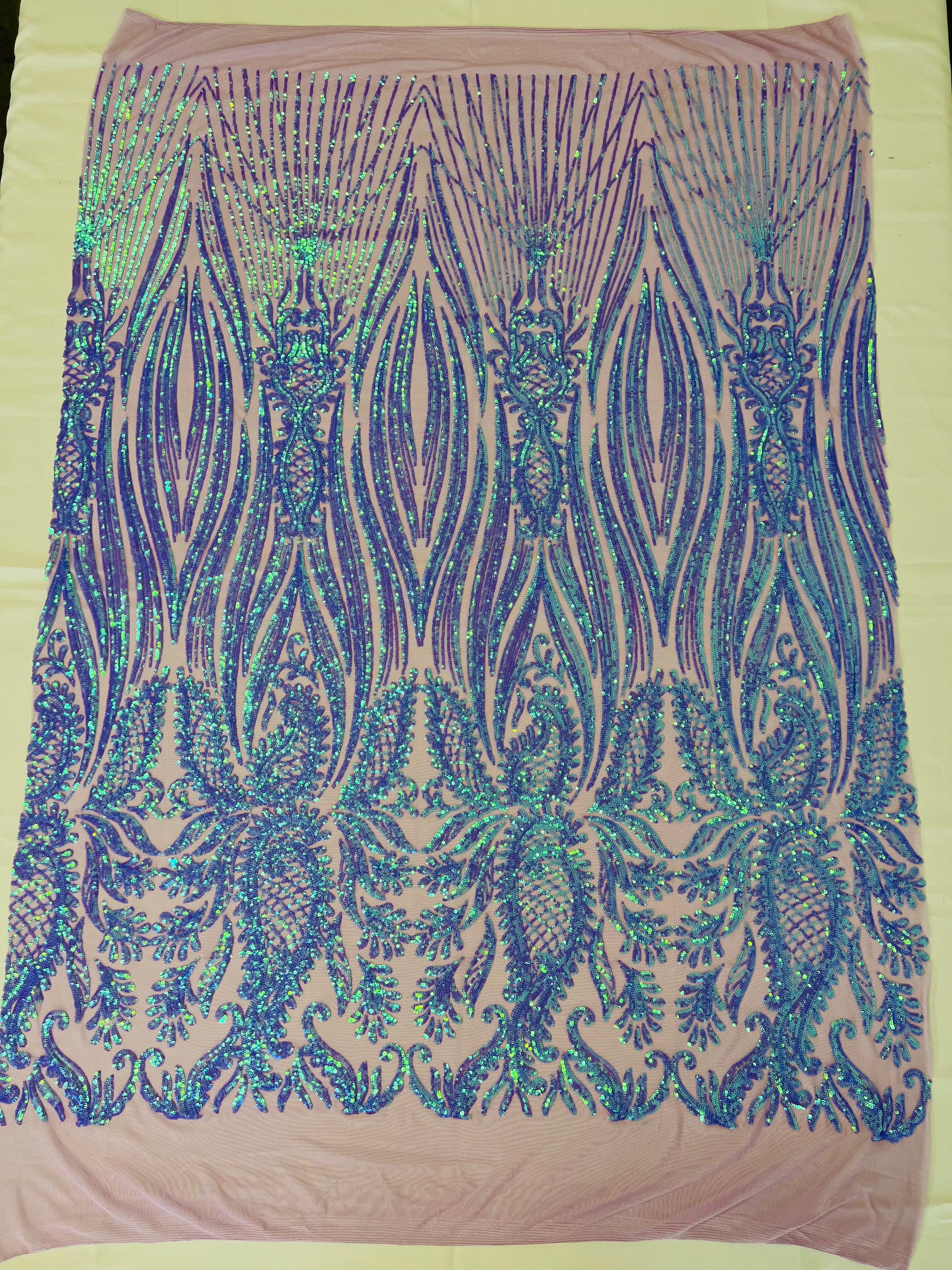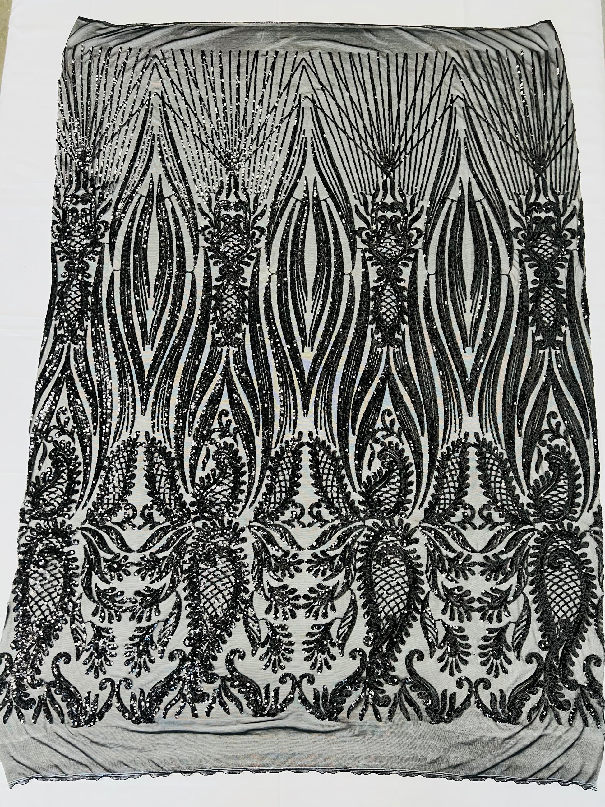 This Paisley design is embroidered with iridescent Sequins on a 4 Way Stretch mesh fabric. The iridescent Sequins has especial and extraordinary design on the Mesh . It is super elegant and classy, The royalty design embroider with iridescent Sequins on a mesh can be use for dresses, tablecloths, night gowns, Skirts, prom dresses, wedding dresses, runners for tables, decoration and much more.