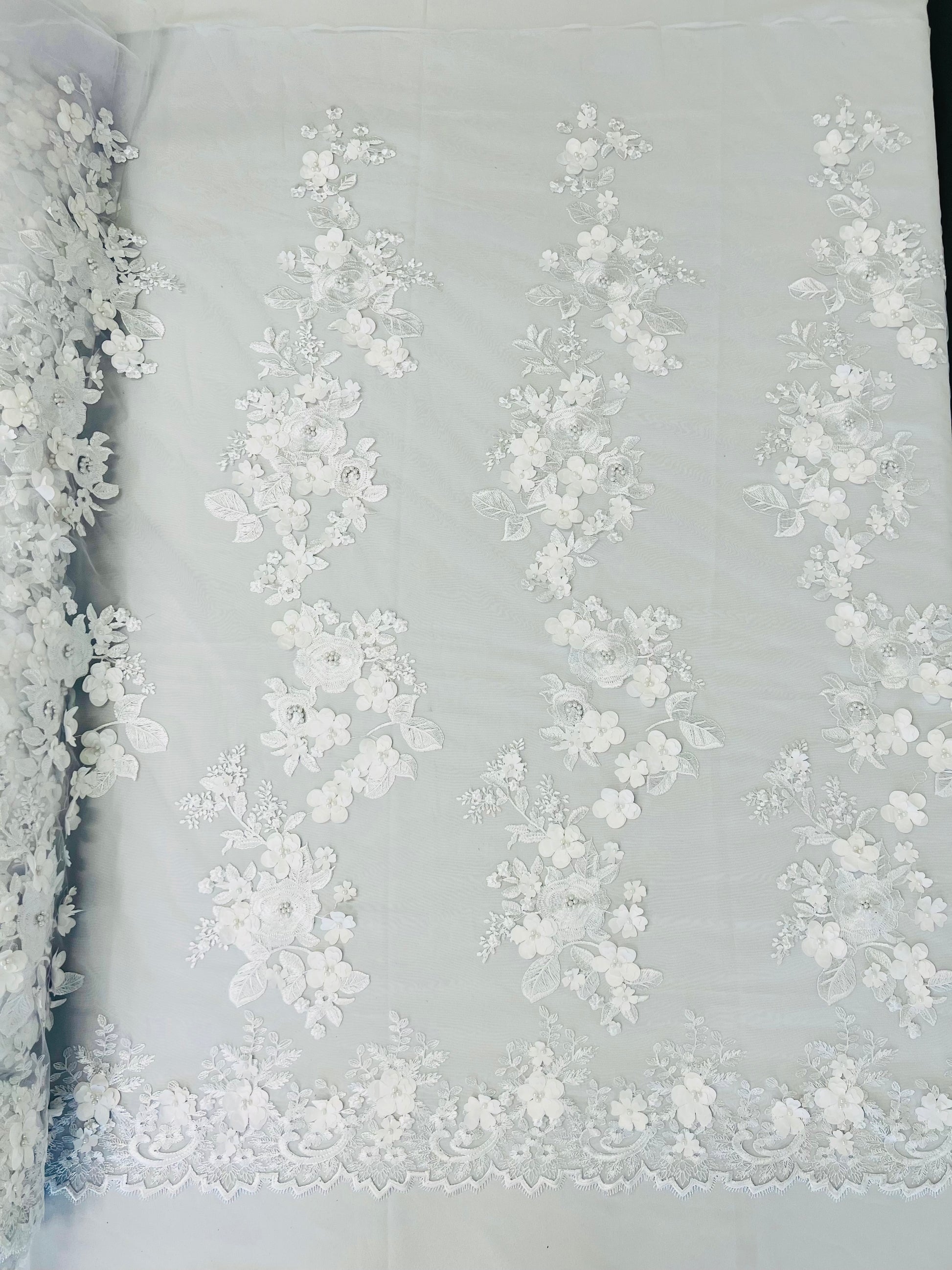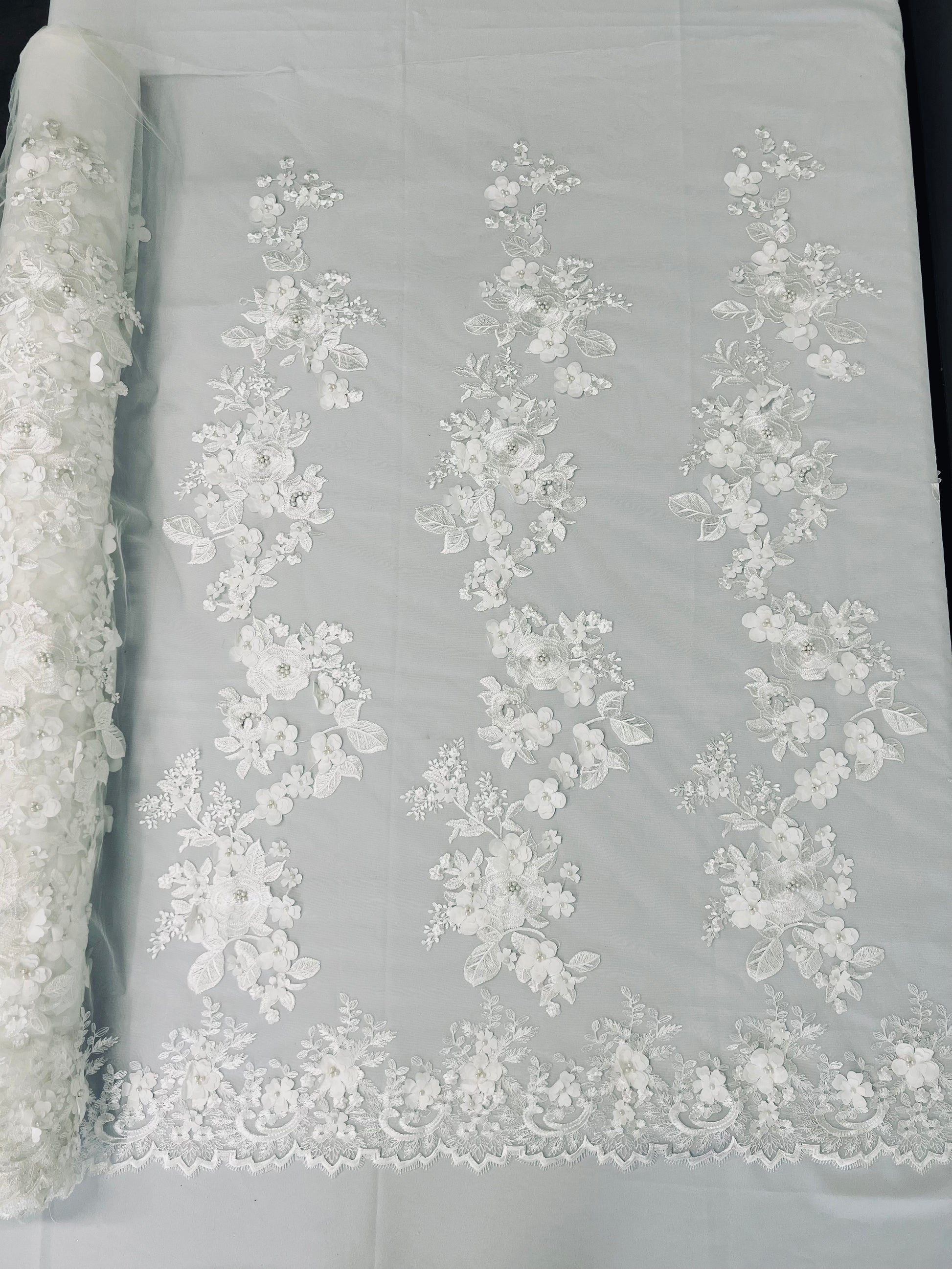 This lace has a double scallop. .The lace can be use for dresses, tablecloths, runners, nightgowns, fashion, apparel, decoration, prom dresses, bridesmaid dresses, and much more.