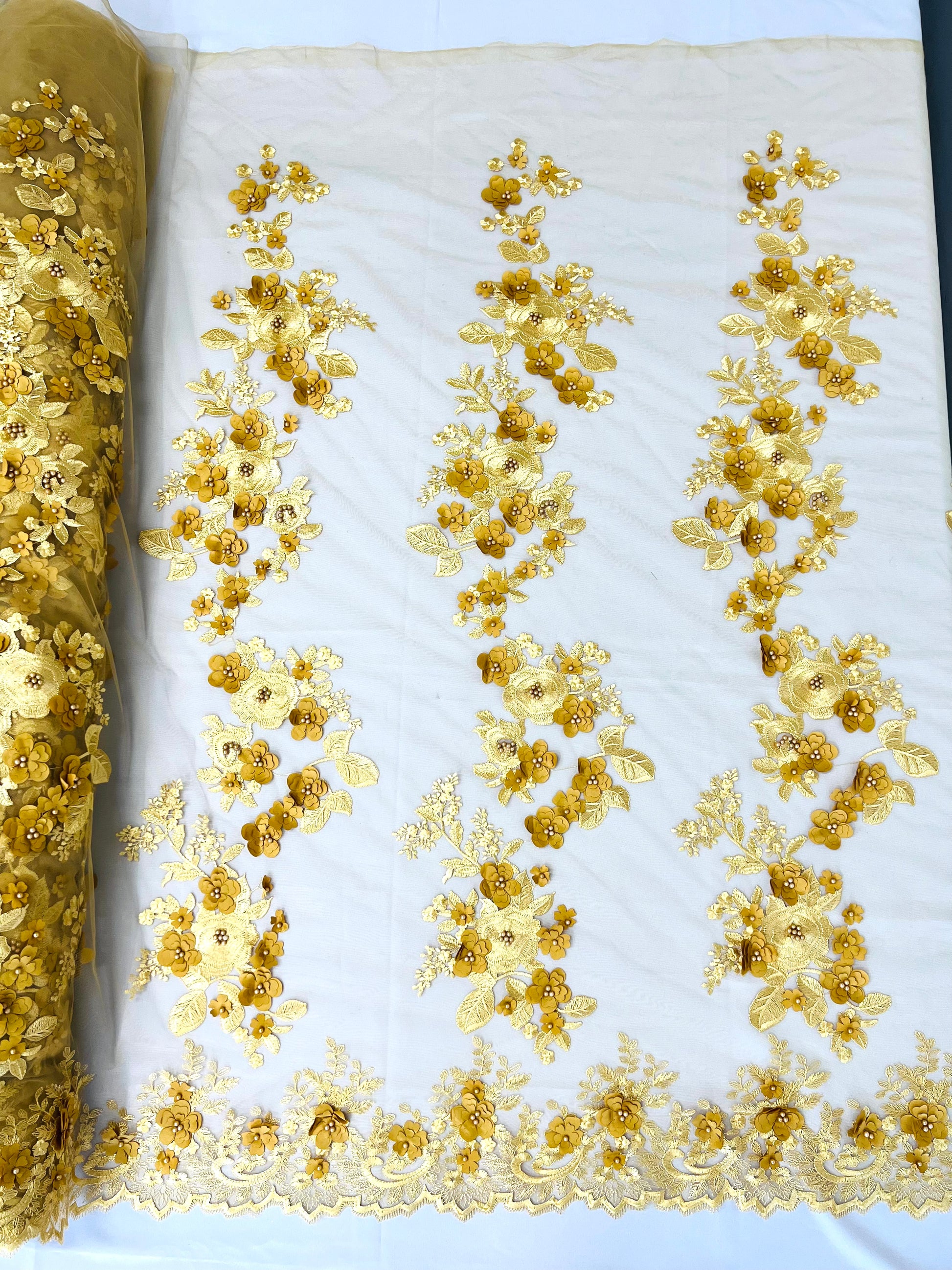 Beautiful Diana flower design embroider with beading and 3d flowers on a mesh lace. The lace has beads and 3d flowers embroider for a sparkling real look. This beaded lace has a Pearls on the design that gives a beautiful shine. This lace is a great item for show people and dance dresses, great for Vegas shows.