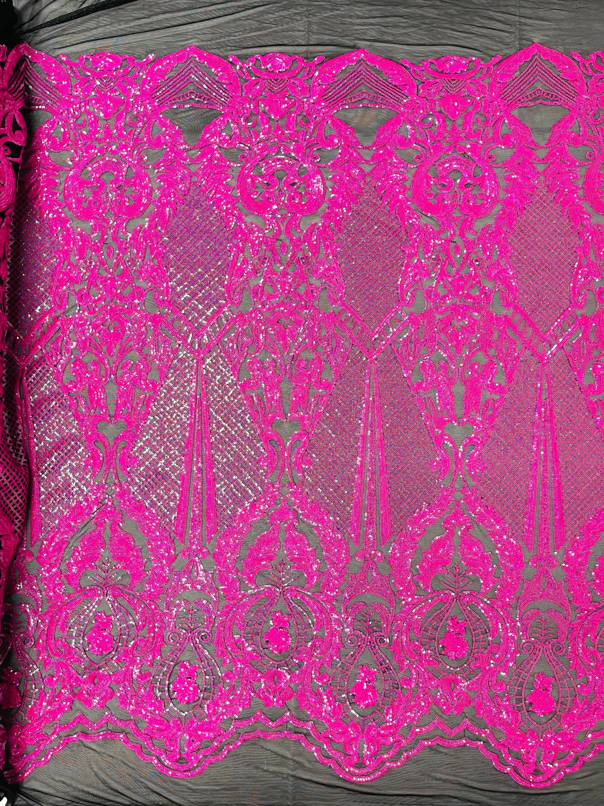 This DAMASK design is embroidered with Sequins on a 4 way stretch mesh fabric. The sequins has especial and extraordinary design on the Mesh . It is super elegant and classy, The DAMASK design is embroidered with sequins on a mesh and can be used for dresses, tablecloths, backdrops, night gowns, skirts, prom dresses, wedding dresses, runners for tables, decorations and much more.
