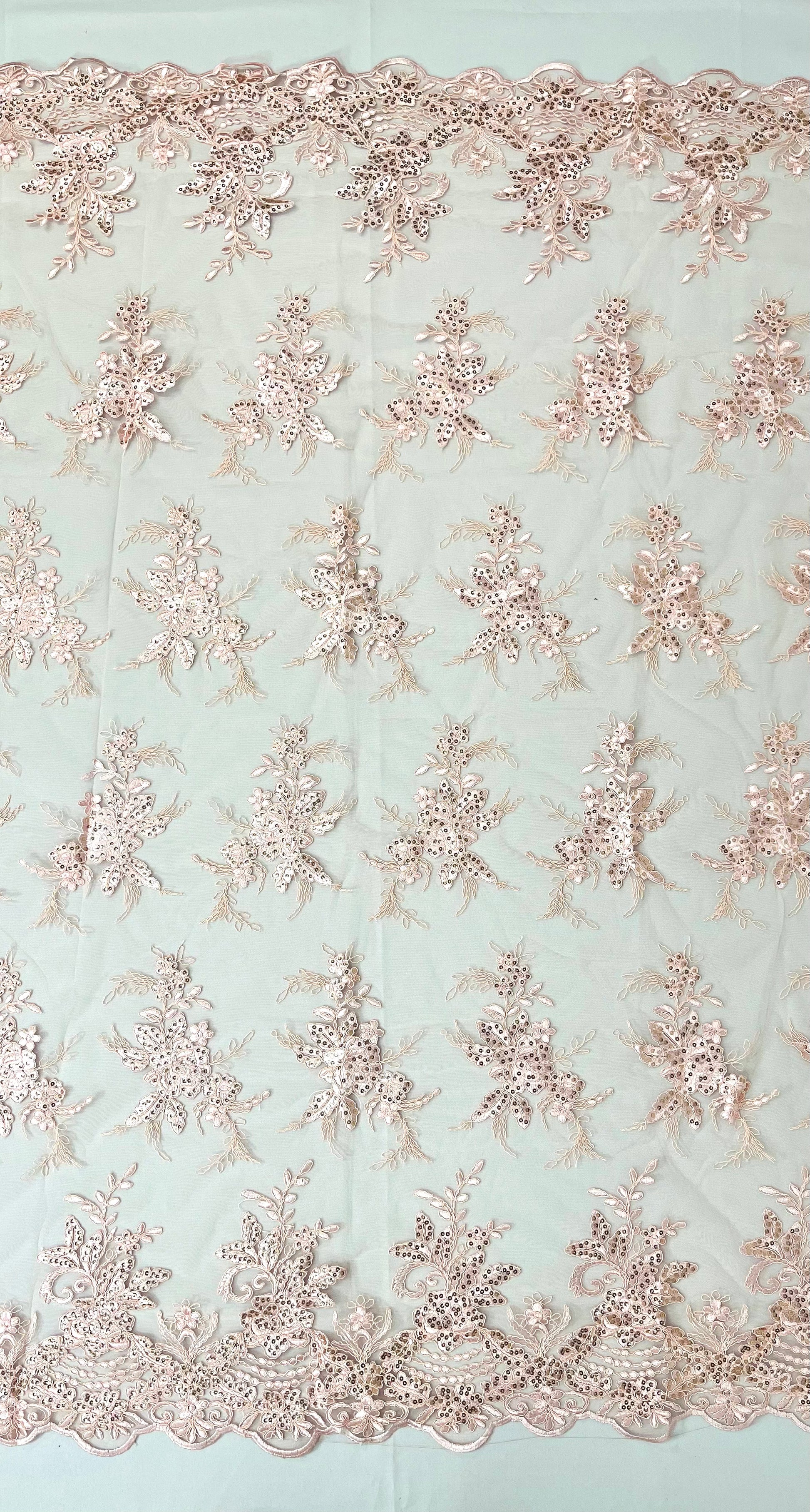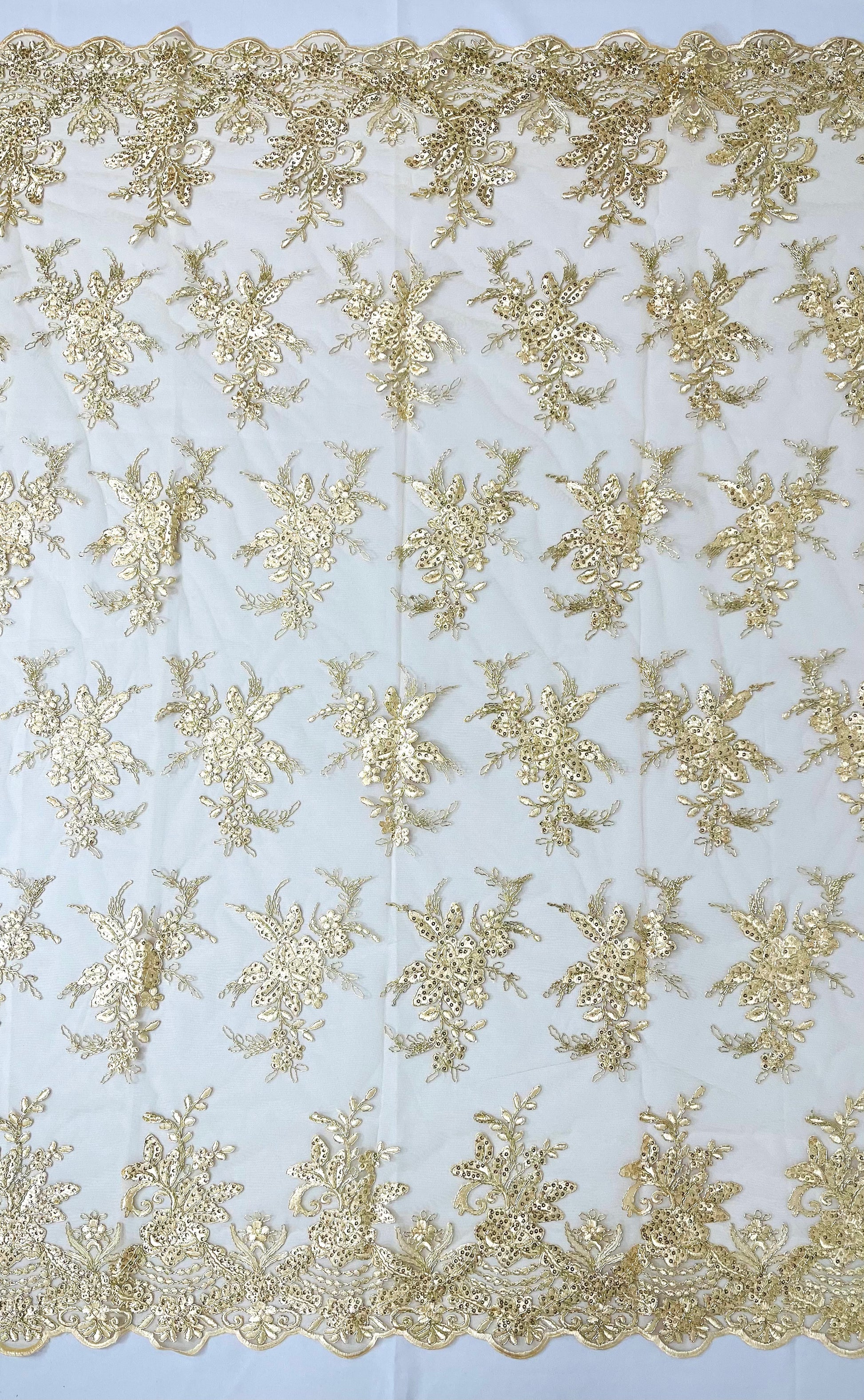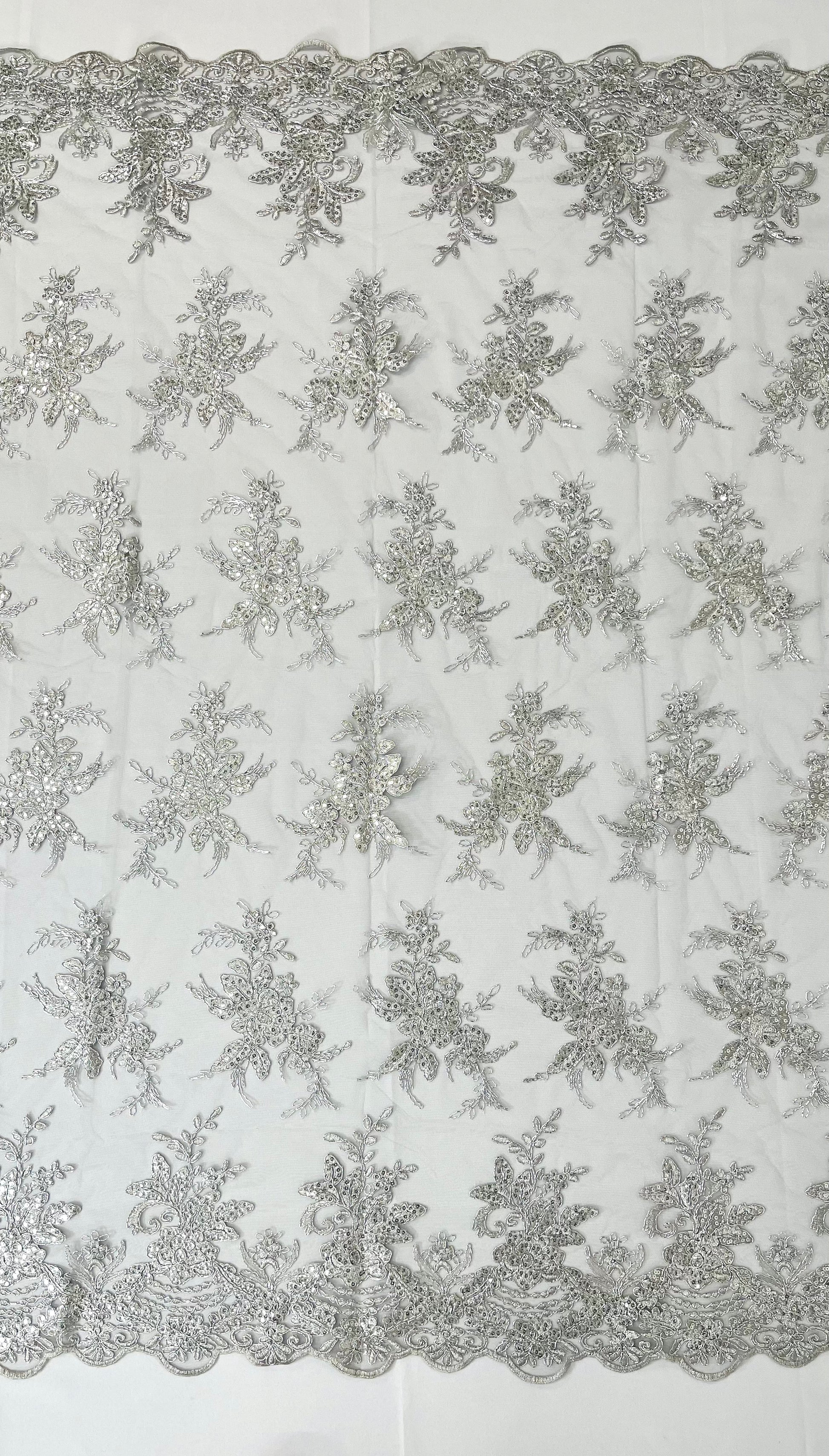 These corded flowers are embroider with sequins on a mesh lace fabric giving off a sophisticated and elegant look . The lace has a double scallops on the width .This lace can be used for dresses, tablecloths, nightgowns, prom gowns, bridal gowns, wedding gowns, runners, Vegas shows, pillows, decoration, and much more.