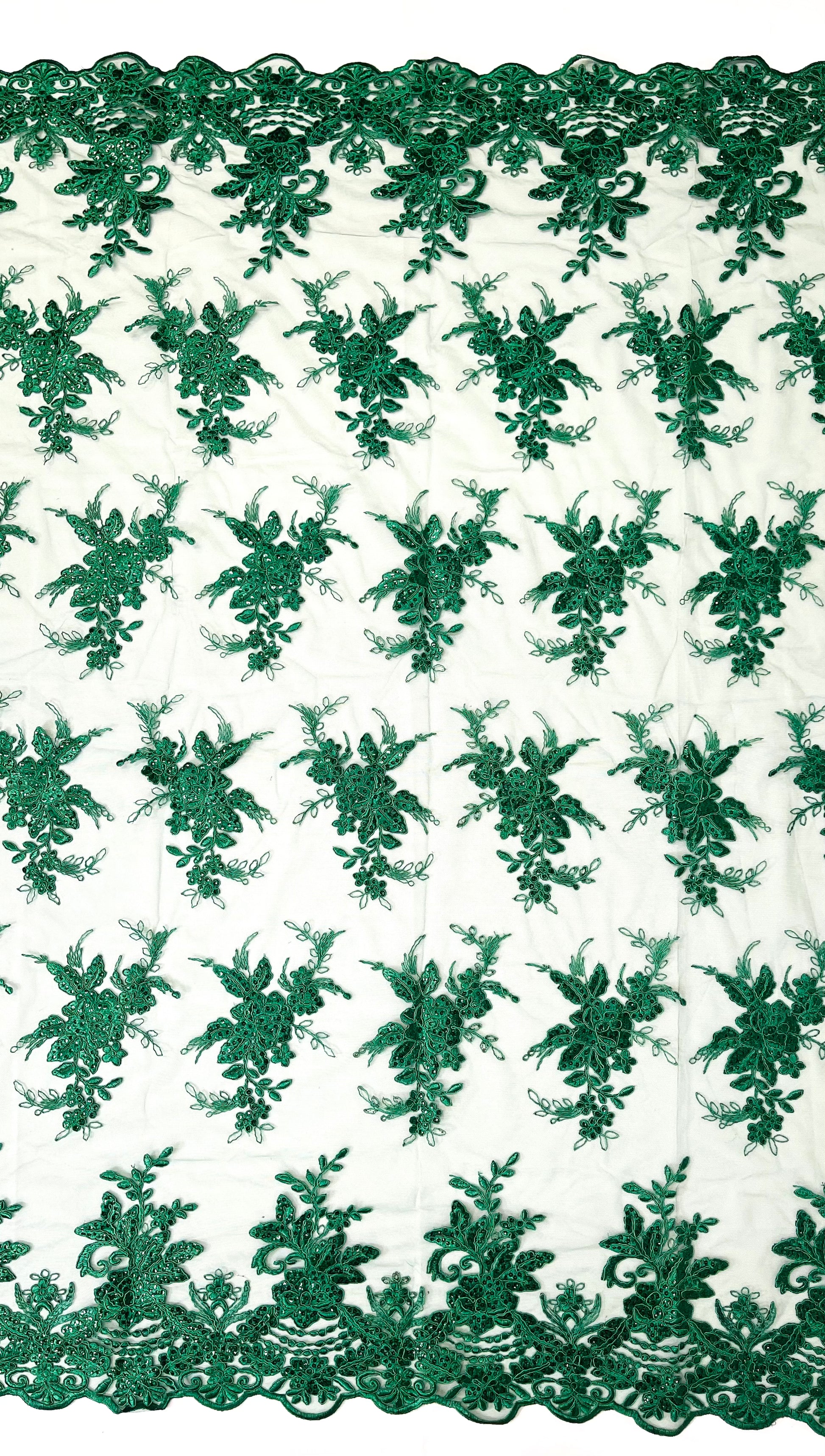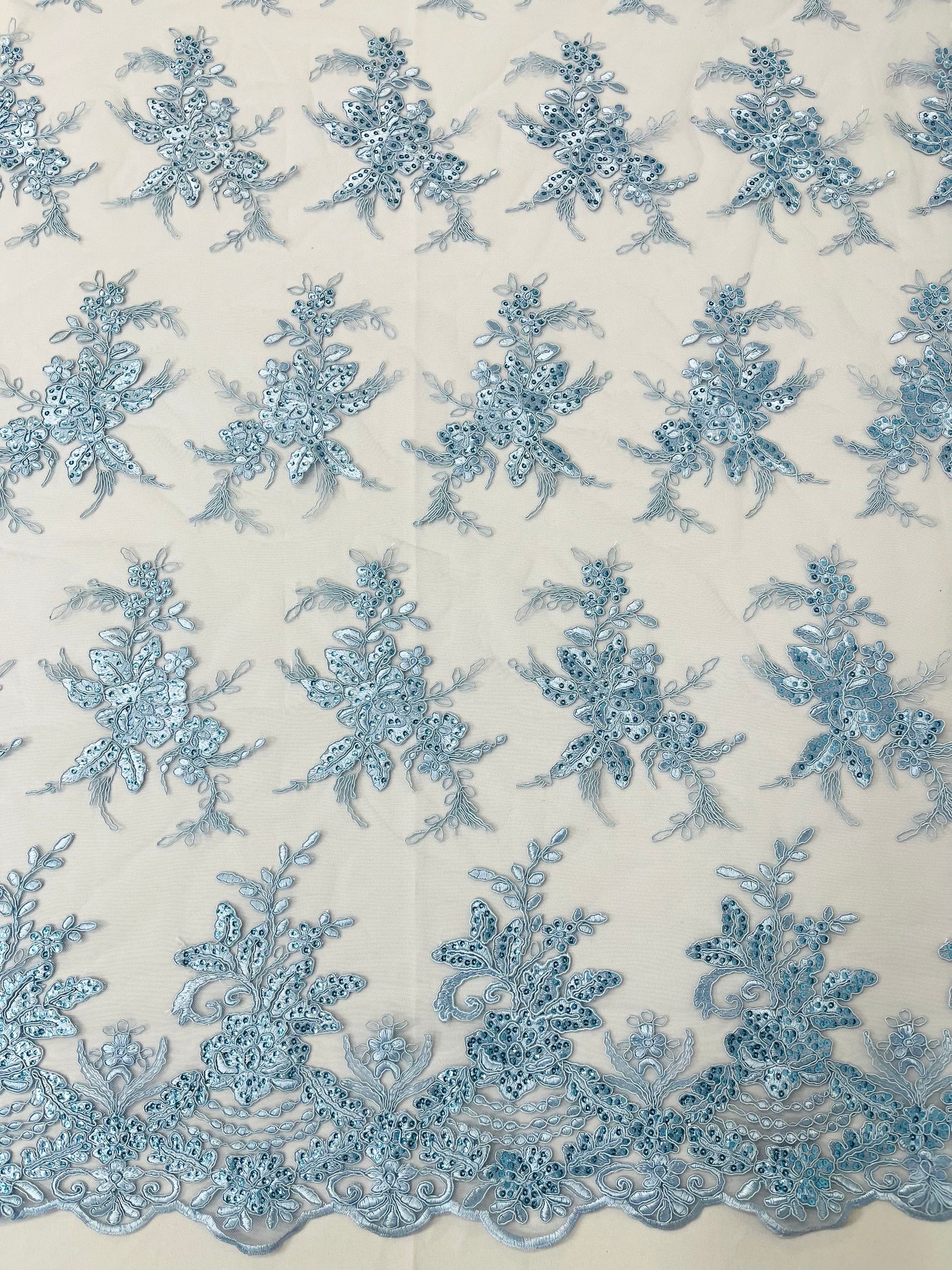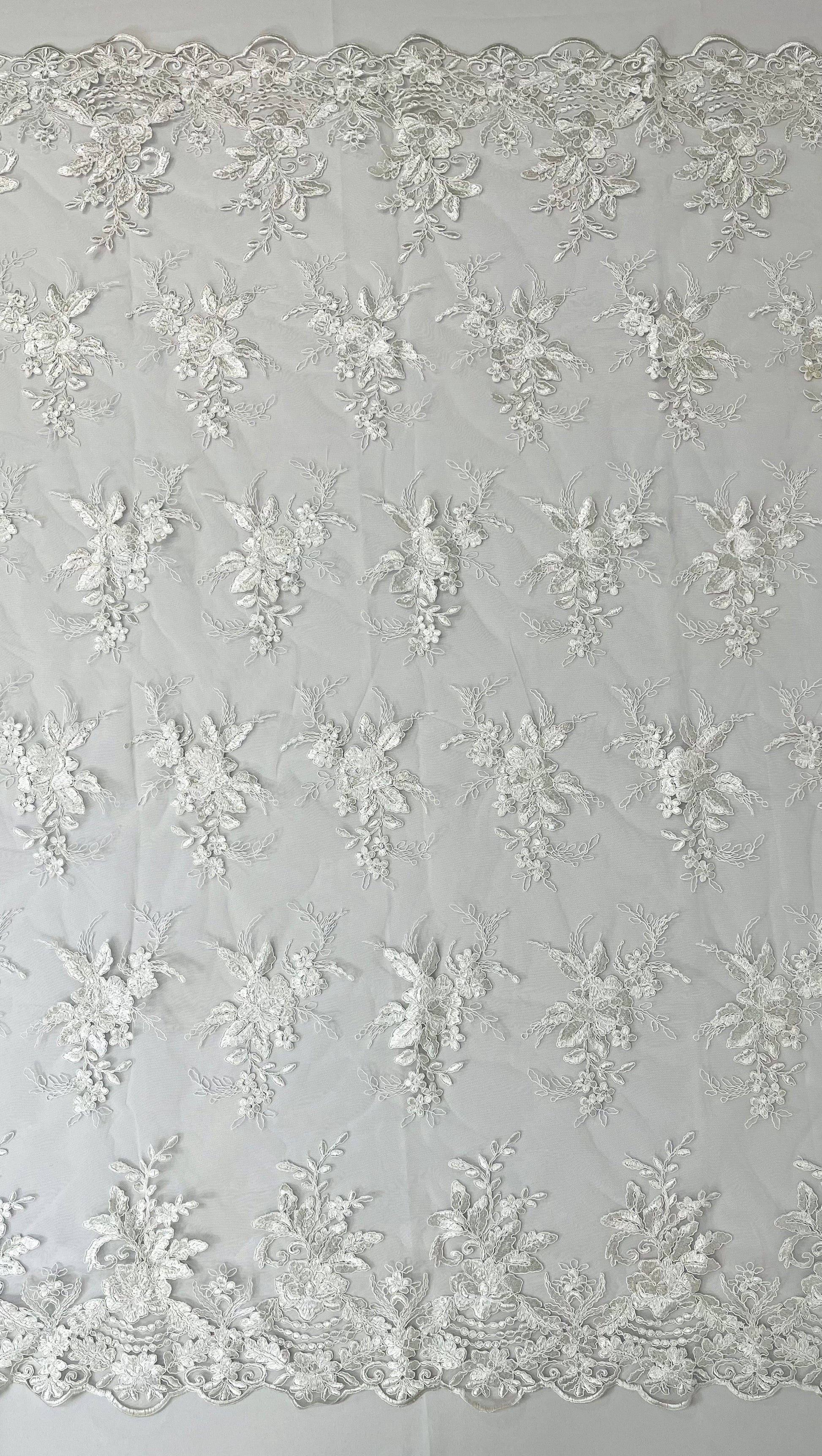 These corded flowers are embroider with sequins on a mesh lace fabric giving off a sophisticated and elegant look . The lace has a double scallops on the width .This lace can be used for dresses, tablecloths, nightgowns, prom gowns, bridal gowns, wedding gowns, runners, Vegas shows, pillows, decoration, and much more.